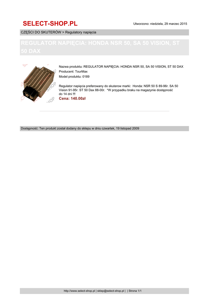 SELECT-SHOP.PL Utworzono: niedziela, 29 marzec 2015 CZĘŚCI DO SKUTERÓW > Regulatory napięcia REGULATOR NAPIĘCIA: HONDA NSR 50, SA 50 VISION, ST 50 DAX Nazwa produktu: REGULATOR NAPIĘCIA: HONDA NSR 50, SA 50 VISION, ST 50 DAX Producent: TourMax Model produktu: 0189 Regulator napięcia preferowany do skuterow marki: Honda: NSR 50 S 89-96r. SA 50 Vision 91-95r. ST 50 Dax 88-00r. *W przypadku braku na magazynie dostępność do 14 dni !!! Cena: 140.00zł Dostępność: Ten produkt został dodany do sklepu w dniu czwartek, 19 listopad 2009 http://www.select-shop.pl | [email protected] | | Strona 1/1