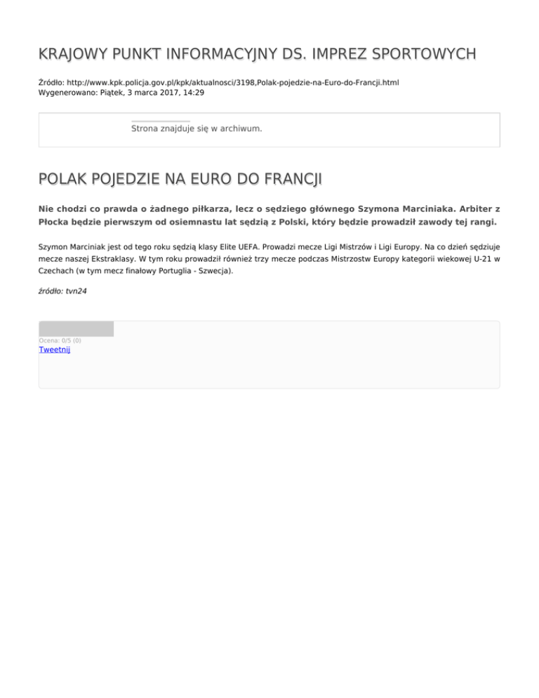 KRAJOWY PUNKT INFORMACYJNY DS. IMPREZ SPORTOWYCH Źródło: http://www.kpk.policja.gov.pl/kpk/aktualnosci/3198,Polak-pojedzie-na-Euro-do-Francji.html Wygenerowano: Piątek, 3 marca 2017, 14:29 Strona znajduje się w archiwum. POLAK POJEDZIE NA EURO DO FRANCJI Nie chodzi co prawda o żadnego piłkarza, lecz o sędziego głównego Szymona Marciniaka. Arbiter z Płocka będzie pierwszym od osiemnastu lat sędzią z Polski, który będzie prowadził zawody tej rangi. Szymon Marciniak jest od tego roku sędzią klasy Elite UEFA. Prowadzi mecze Ligi Mistrzów i Ligi Europy. Na co dzień sędziuje mecze naszej Ekstraklasy. W tym roku prowadził również trzy mecze podczas Mistrzostw Europy kategorii wiekowej U-21 w Czechach (w tym mecz finałowy Portuglia - Szwecja). źródło: tvn24 Ocena: 0/5 (0) Tweetnij