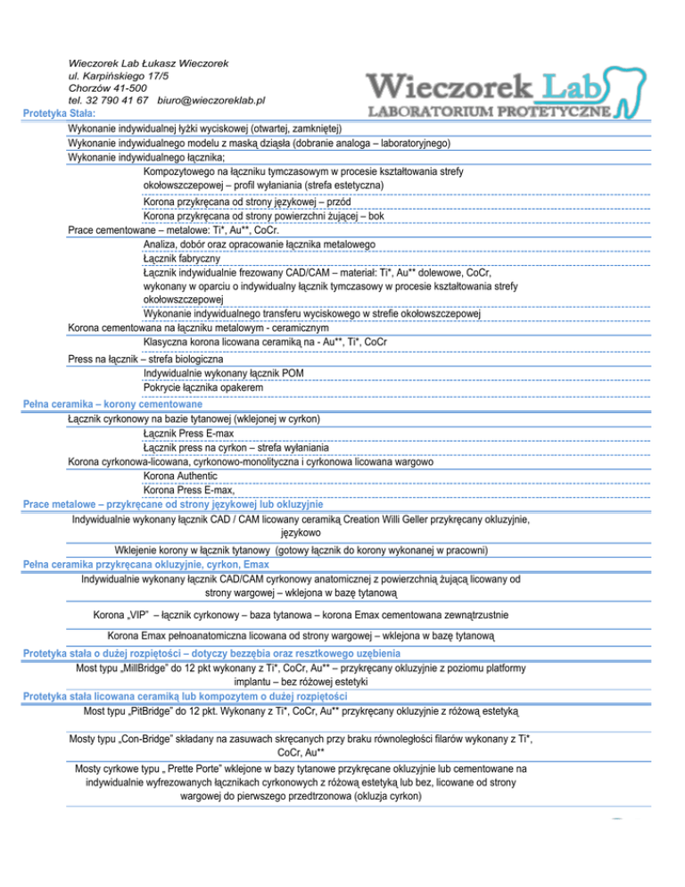 Wieczorek Lab Łukasz Wieczorek ul. Karpińskiego 17/5 Chorzów 41-500 tel. 32 790 41 67 [email protected] Protetyka Stała: Wykonanie indywidualnej łyżki wyciskowej (otwartej, zamkniętej) Wykonanie indywidualnego modelu z maską dziąsła (dobranie analoga – laboratoryjnego) Wykonanie indywidualnego łącznika; Kompozytowego na łączniku tymczasowym w procesie kształtowania strefy okołowszczepowej – profil wyłaniania (strefa estetyczna) Korona przykręcana od strony językowej – przód Korona przykręcana od strony powierzchni żującej – bok Prace cementowane – metalowe: Ti*, Au**, CoCr. Analiza, dobór oraz opracowanie łącznika metalowego Łącznik fabryczny Łącznik indywidualnie frezowany CAD/CAM – materiał: Ti*, Au** dolewowe, CoCr, wykonany w oparciu o indywidualny łącznik tymczasowy w procesie kształtowania strefy okołowszczepowej Wykonanie indywidualnego transferu wyciskowego w strefie okołowszczepowej Korona cementowana na łączniku metalowym - ceramicznym Klasyczna korona licowana ceramiką na - Au**, Ti*, CoCr Press na łącznik – strefa biologiczna Indywidualnie wykonany łącznik POM Pokrycie łącznika opakerem Pełna ceramika – korony cementowane Łącznik cyrkonowy na bazie tytanowej (wklejonej w cyrkon) Łącznik Press E-max Łącznik press na cyrkon – strefa wyłaniania Korona cyrkonowa-licowana, cyrkonowo-monolityczna i cyrkonowa licowana wargowo Korona Authentic Korona Press E-max, Prace metalowe – przykręcane od strony językowej lub okluzyjnie Indywidualnie wykonany łącznik CAD / CAM licowany ceramiką Creation Willi Geller przykręcany okluzyjnie, językowo Wklejenie korony w łącznik tytanowy (gotowy łącznik do korony wykonanej w pracowni) Pełna ceramika przykręcana okluzyjnie, cyrkon, Emax Indywidualnie wykonany łącznik CAD/CAM cyrkonowy anatomicznej z powierzchnią żującą licowany od strony wargowej – wklejona w bazę tytanową Korona „VIP” – łącznik cyrkonowy – baza tytanowa – korona Emax cementowana zewnątrzustnie Korona Emax pełnoanatomiczna licowana od strony wargowej – wklejona w bazę tytanową Protetyka stała o dużej rozpiętości – dotyczy bezzębia oraz resztkowego uzębienia Most typu „MillBridge” do 12 pkt wykonany z Ti*, CoCr, Au** – przykręcany okluzyjnie z poziomu platformy implantu – bez różowej estetyki Protetyka stała licowana ceramiką lub kompozytem o dużej rozpiętości Most typu „PitBridge” do 12 pkt. Wykonany z Ti*, CoCr, Au** przykręcany okluzyjnie z różową estetyką Mosty typu „Con-Bridge” składany na zasuwach skręcanych przy braku równoległości filarów wykonany z Ti*, CoCr, Au** Mosty cyrkowe typu „ Prette Porte” wklejone w bazy tytanowe przykręcane okluzyjnie lub cementowane na indywidualnie wyfrezowanych łącznikach cyrkonowych z różową estetyką lub bez, licowane od strony wargowej do pierwszego przedtrzonowa (okluzja cyrkon) Prace CAD/CAM Most do 12 pkt „Prette Porte” na przykręcanych okluzyjnie bazach tytanowych bez różowej estetyki Most do 12 pkt „Prette Porte” na przykręcanych okluzyjnie bazach tytanowych z różową estetyką Most do 12 pkt. Cyrkonowy cementowany na indywidualnych łącznikach cyrkonowych Most do 14 pkt. Składany na zasuwach cyrkonowych przy braku równoległości Wykonanie indywidualnej protezy całkowitej do określenia wymiaru pionowego, czynnościowego oraz estetyki jako baza do mostu na implanatach Prowizorium do 12 pkt na łącznikach tytanowych wzmocnione włóknem szklanym lub szkieletem metalowym licowany akrylem lub kompozytem Wykonanie klucza z Pattern Resin od 1 do 8 pkt. Wykonanie szablonu chirurgicznego na podstawie OPG – lub tomografii 3D 1 ząb + tuleja pilot Bohrem + materiał 2 zęby + tuleja pilot Bohrem + materiał Bezzębie na podstawie protetyki całkowitej Bezzębie na podstawie tomografii 3D Tuleje bezpośrednio w materiale termoplastycznym Protetyka ruchoma na implantach Protetyka w przypadku bezzębia żuchwy typu OVD – Żuchwa Belka na dwóch implantach typu Preci Horix z własną resilencją Belka na dwóch implantach typu Preci Horix ekstensyjna Belka na czterech implantach ekstensyjna – proteza hybrydowa Belka indywidualnie frezowana na elementach retencyjnych typu zatrzask, zasuwa, rygiel, Belka przy braku równoległości proteza hybrydowa Lokator Kulko zatrzask Teleskop – łącznik, czapka galwano retencja Syn-Cone-Ankylos Proteza hybrydowa Proteza z zębami standard Mifam Proteza z zębami Ivoclar Proteza z zębami Antaris Proteza z zębami Michał Anioł Merz Pracujemy na systemach: Ankylos, Xive ,friadent, Nobel, Semados, Camlog, Branemark, Dio, Dentium, Zimmer. AB ,Thomen, Osteoplant, Neoss, Sky-Implat Straumann -Bone level Soft tissue oraz inne.