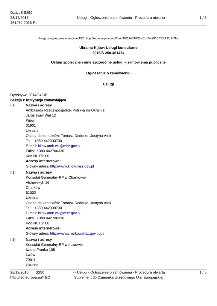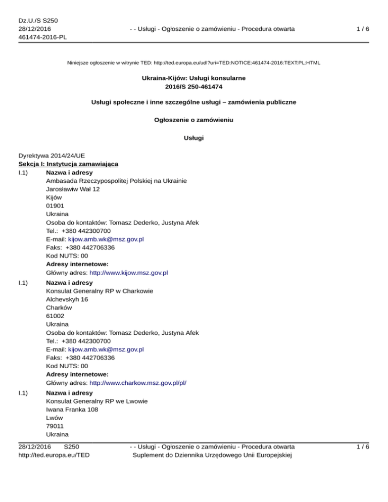 Dz.U./S S250 28/12/2016 461474-2016-PL - - Usługi - Ogłoszenie o zamówieniu - Procedura otwarta 1/6 Niniejsze ogłoszenie w witrynie TED: http://ted.europa.eu/udl?uri=TED:NOTICE:461474-2016:TEXT:PL:HTML Ukraina-Kijów: Usługi konsularne 2016/S 250-461474 Usługi społeczne i inne szczególne usługi – zamówienia publiczne Ogłoszenie o zamówieniu Usługi Dyrektywa 2014/24/UE Sekcja I: Instytucja zamawiająca I.1) Nazwa i adresy Ambasada Rzeczypospolitej Polskiej na Ukrainie Jarosławiw Wał 12 Kijów 01901 Ukraina Osoba do kontaktów: Tomasz Dederko, Justyna Afek Tel.: +380 442300700 E-mail: [email protected] Faks: +380 442706336 Kod NUTS: 00 Adresy internetowe: Główny adres: http://www.kijow.msz.gov.pl I.1) Nazwa i adresy Konsulat Generalny RP w Charkowie Alchevskyh 16 Charków 61002 Ukraina Osoba do kontaktów: Tomasz Dederko, Justyna Afek Tel.: +380 442300700 E-mail: [email protected] Faks: +380 442706336 Kod NUTS: 00 Adresy internetowe: Główny adres: http://www.charkow.msz.gov.pl/pl/ I.1) Nazwa i adresy Konsulat Generalny RP we Lwowie Iwana Franka 108 Lwów 79011 Ukraina 28/12/2016 S250 http://ted.europa.eu/TED - - Usługi - Ogłoszenie o zamówieniu - Procedura otwarta Suplement do Dziennika Urzędowego Unii Europejskiej 1/6 Dz.U./S S250 28/12/2016 461474-2016-PL - - Usługi - Ogłoszenie o zamówieniu - Procedura otwarta 2/6 Osoba do kontaktów: Tomasz Dederko, Justyna Afek Tel.: +380 442300700 E-mail: [email protected] Faks: +380 442706336 Kod NUTS: 00 Adresy internetowe: Główny adres: http://lwow.msz.gov.pl/pl/ I.1) Nazwa i adresy Konsulat Generalny RP w Łucku Dubniwska 22b Łuck 43-010 Ukraina Osoba do kontaktów: Tomasz Dederko, Justyna Afek Tel.: +380 442300700 E-mail: [email protected] Faks: +380 442706336 Kod NUTS: 00 Adresy internetowe: Główny adres: http://luck.msz.gov.pl/pl/ I.1) Nazwa i adresy Konsulat Generalny RP w Odessie Uspenska 2/1 Odessa 65014 Ukraina Osoba do kontaktów: Tomasz Dederko, Justyna Afek Tel.: +380 442300700 E-mail: [email protected] Faks: +380 442706336 Kod NUTS: 00 Adresy internetowe: Główny adres: http://odessa.msz.gov.pl/pl/ I.1) Nazwa i adresy Konsulat Generalny RP w Winnicy ul. Owodowa 51 Winnica 21050 Ukraina Osoba do kontaktów: Tomasz Dederko, Justyna Afek Tel.: +380 442300700 E-mail: [email protected] Faks: +380 442706336 Kod NUTS: 00 Adresy internetowe: 28/12/2016 S250 http://ted.europa.eu/TED - - Usługi - Ogłoszenie o zamówieniu - Procedura otwarta Suplement do Dziennika Urzędowego Unii Europejskiej 2/6 Dz.U./S S250 28/12/2016 461474-2016-PL - - Usługi - Ogłoszenie o zamówieniu - Procedura otwarta 3/6 Główny adres: http://winnica.msz.gov.pl/pl/ I.2) Wspólne zamówienie W zamówieniu stosowane jest wspólne udzielanie zamówień I.3) Komunikacja Nieograniczony, pełny i bezpośredni dostęp do dokumentów zamówienia można uzyskać bezpłatnie pod adresem: http://www.kijow.msz.gov.pl Więcej informacji można uzyskać pod adresem podanym powyżej Oferty lub wnioski o dopuszczenie do udziału w postępowaniu należy przesyłać na następujący adres: Ambasada Rzeczypospolitej Polskiej na Ukrainie Jarosławiw Wał 12 Kijów 01901 Ukraina Tel.: +380 442300700 E-mail: [email protected] Faks: +380 442706336 Kod NUTS: 00 Adresy internetowe: Główny adres: http://www.kijow.msz.gov.pl I.4) Rodzaj instytucji zamawiającej Inny rodzaj: misja dyplomatyczno konsularna I.5) Główny przedmiot działalności Inna działalność: usługi konsularne Sekcja II: Przedmiot II.1) Wielkość lub zakres zamówienia II.1.1) Nazwa: Usługi przyjmowania wniosków wizowych oraz wniosków o zezwolenie uprawniające do małego ruchu granicznego na rzecz polskich placówek zagranicznych na Ukrainie. Numer referencyjny: AMB.KIJ.741.1.2016 II.1.2) Główny kod CPV 75211110 II.1.3) Rodzaj zamówienia Usługi II.1.4) Krótki opis: Przedmiotem zamówienia jest 1) świadczenie usług przyjmowania wniosków wizowych w rozumieniu art. 43 Wspólnotowego Kodeksu Wizowego, w tym pobieranie od wnioskodawców i dostarczanie przedstawicielstwu dyplomatycznemu i polskim urzędom konsularnym danych biometrycznych niezbędnych do wydania wiz Schengen oraz wniosków na wizy krajowe, 2) świadczenie usług przyjmowania wniosków o zezwolenie uprawniające do przekraczania granicy w ramach małego ruchu granicznego (dalej uprawniające do MRG). II.1.5) Szacunkowa całkowita wartość II.1.6) Informacje o częściach 28/12/2016 S250 http://ted.europa.eu/TED - - Usługi - Ogłoszenie o zamówieniu - Procedura otwarta Suplement do Dziennika Urzędowego Unii Europejskiej 3/6 Dz.U./S S250 28/12/2016 461474-2016-PL - - Usługi - Ogłoszenie o zamówieniu - Procedura otwarta 4/6 To zamówienie podzielone jest na części: nie II.2) Opis II.2.1) Nazwa: II.2.2) Dodatkowy kod lub kody CPV II.2.3) Miejsce świadczenia usług Kod NUTS: 00 Główne miejsce lub lokalizacja realizacji: Terytorium Ukrainy. II.2.4) Opis zamówienia: Przedmiotem zamówienia jest: 1) świadczenie usług przyjmowania wniosków wizowych w rozumieniu art. 43 Wspólnotowego Kodeksu Wizowego, w tym pobieranie od wnioskodawców i dostarczanie przedstawicielstwu dyplomatycznemu i polskim urzędom konsularnym danych biometrycznych niezbędnych do wydania wiz Schengen oraz wniosków na wizy krajowe na rzecz Zamawiającego – Ambasady RP na Ukrainie z siedzibą w Kijowie oraz na rzecz KG RP w Charkowie, KG RP we Lwowie, KG RP w Łucku, KG RP w Odessie i KG RP w Winnicy, których maksymalną liczbę szacuje się na nie więcej niż 2 159 271 wniosków, 2) świadczenie usług przyjmowania wniosków o zezwolenie uprawniające do przekraczania granicy w ramach małego ruchu granicznego (dalej uprawniające do MRG) na rzecz KG RP we Lwowie oraz KG RP w Łucku, których maksymalną liczbę szacuje się na nie więcej niż 95 616 wniosków. II.2.6) Szacunkowa wartość II.2.7) Okres obowiązywania zamówienia lub umowy ramowej Okres w miesiącach: 26 II.2.13) Informacje o funduszach Unii Europejskiej Zamówi