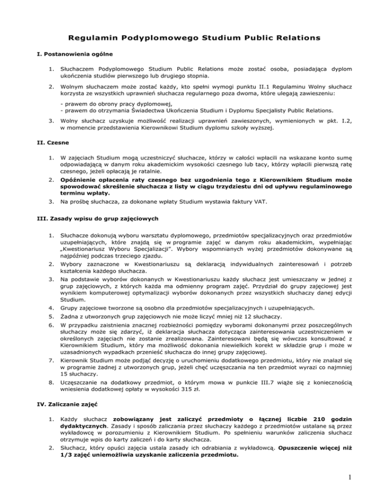 Regulamin Podyplomowego Studium Public Relations I. Postanowienia ogólne 1. Słuchaczem Podyplomowego Studium Public Relations może zostać osoba, posiadająca dyplom ukończenia studiów pierwszego lub drugiego stopnia. 2. Wolnym słuchaczem może zostać każdy, kto spełni wymogi punktu II.1 Regulaminu Wolny słuchacz korzysta ze wszystkich uprawnień słuchacza regularnego poza dwoma, które ulegają zawieszeniu: - prawem do obrony pracy dyplomowej, - prawem do otrzymania Świadectwa Ukończenia Studium i Dyplomu Specjalisty Public Relations. 3. Wolny słuchacz uzyskuje możliwość realizacji uprawnień zawieszonych, wymienionych w pkt. I.2, w momencie przedstawienia Kierownikowi Studium dyplomu szkoły wyższej. II. Czesne 1. W zajęciach Studium mogą uczestniczyć słuchacze, którzy w całości wpłacili na wskazane konto sumę odpowiadającą w danym roku akademickim wysokości czesnego lub tacy, którzy wpłacili pierwszą ratę czesnego, jeżeli opłacają je ratalnie. 2. Opóźnienie opłacenia raty czesnego bez uzgodnienia tego z Kierownikiem Studium może spowodować skreślenie słuchacza z listy w ciągu trzydziestu dni od upływu regulaminowego terminu wpłaty. 3. Na prośbę słuchacza, za dokonane wpłaty Studium wystawia faktury VAT. III. Zasady wpisu do grup zajęciowych 1. Słuchacze dokonują wyboru warsztatu dyplomowego, przedmiotów specjalizacyjnych oraz przedmiotów uzupełniających, które znajdą się w programie zajęć w danym roku akademickim, wypełniając „Kwestionariusz Wyboru Specjalizacji”. Wybory wspomnianych wyżej przedmiotów dokonywane są najpóźniej podczas trzeciego zjazdu. 2. Wybory zaznaczone w Kwestionariuszu są deklaracją indywidualnych zainteresowań i potrzeb kształcenia każdego słuchacza. 3. Na podstawie wyborów dokonanych w Kwestionariuszu każdy słuchacz jest umieszczany w jednej z grup zajęciowych, z których każda ma odmienny program zajęć. Przydział do grupy zajęciowej jest wynikiem komputerowej optymalizacji wyborów dokonanych przez wszystkich słuchaczy danej edycji Studium. 4. Grupy zajęciowe tworzone są osobno dla przedmiotów specjalizacyjnych i uzupełniających. 5. Żadna z utworzonych grup zajęciowych nie może liczyć mniej niż 12 słuchaczy. 6. W przypadku zaistnienia znacznej rozbieżności pomiędzy wyborami dokonanymi przez poszczególnych słuchaczy może się zdarzyć, iż deklaracja słuchacza dotycząca zainteresowania uczestniczeniem w określonych zajęciach nie zostanie zrealizowana. Zainteresowani będą się wówczas konsultować z Kierownikiem Studium, który ma możliwość dokonania niewielkich korekt w składzie grup i może w uzasadnionych wypadkach przenieść słuchacza do innej grupy zajęciowej. 7. Kierownik Studium może podjąć decyzję o uruchomieniu dodatkowego przedmiotu, który nie znalazł się w programie żadnej z utworzonych grup, jeżeli chęć uczęszczania na ten przedmiot wyrazi co najmniej 15 słuchaczy. 8. Uczęszczanie na dodatkowy przedmiot, o którym mowa w punkcie III.7 wiąże się z koniecznością wniesienia dodatkowej opłaty w wysokości 315 zł. IV. Zaliczanie zajęć 1. Każdy słuchacz zobowiązany jest zaliczyć przedmioty o łącznej liczbie 210 godzin dydaktycznych. Zasady i sposób zaliczania przez słuchaczy każdego z przedmiotów ustalane są przez wykładowcę w porozumieniu z Kierownikiem Studium. Po spełnieniu warunków zaliczenia słuchacz otrzymuje wpis do karty zaliczeń i do karty słuchacza. 2. Słuchacz, który opuści zajęcia ustala zasady ich odrabiania z wykładowcą. Opuszczenie więcej niż 1/3 zajęć uniemożliwia uzyskanie zaliczenia przedmiotu. 1 3. W wyjątkowych wypadkach słuchaczowi, który opuścił więcej niż 1/3 zajęć lub w ogóle nie uczęszczał na nie, Kierownik Studium może zezwolić na zaliczanie zajęć lub sam zaliczyć inne zajęcia, jeśli istnieje merytoryczna podstawa do podjęcia takiej decyzji. Podstawą jest posiadanie przez słuchacza formalnie udokumentowanej wiedzy lub umiejętności praktycznych z zakresu zaliczanego przedmiotu, a nie losowa i niezawiniona przyczyna nieobecności na zajęciach. 4. Słuchaczowi, który opuścił zajęcia lub nie uzyskał zaliczenia z jednego lub większej liczby przedmiotów, Kierownik Studium może udzielić zezwolenia na uczęszczanie (za opłatą odpowiedniej części czesnego) na wybrane zajęcia w następnej edycji Studium, celem uzyskania zaliczeń koniecznych do przystąpienia do obrony pracy dyplomowej. 5. Słuchacz, który przerwał studia podyplomowe, może je wznowić. Decyzję o wznowieniu podejmuje Kierownik Studium. 6. Terminy składania prac zaliczeniowych z poszczególnych przedmiotów są indywidualnie ustalane przez wykładowców ze słuchaczami. V. Warunki ukończenia Studium i uzyskania dyplomu 1. Świadectwo Ukończenia Podyplomowego Studium Public Relations i Dyplom Specjalisty Public Relations mogą otrzymać tylko słuchacze, którzy przedstawili dyplom ukończenia studiów wyższych (magisterskich lub zawodowych) i obronili pracę dyplomową. Pozostali otrzymują zaświadczenie o uczęszczaniu na zajęcia oraz kartę słuchacza z uzyskanymi zaliczeniami przedmiotowymi. 2. Świadectwo ukończenia Studium Podyplomowego wydaje Instytut Filozofii i Socjologii, Polskiej Akademii Nauk, zgodnie z przepisami obowiązującej Ustawy o Szkolnictwie Wyższym. Stwierdza ono fakt uczestniczenia przez absolwenta Studium w zajęciach umożliwiających zdobycie specjalistycznej wiedzy i stosownych umiejętności zawodowych. 3. Dyplom Specjalisty Public Relations uzyskuje słuchacz, który z wynikiem pozytywnym obronił pracę dyplomową. 4. Dyplom wydawany jest przez Podyplomowe Studium Public Relations i poświadczony przez Instytut Filozofii i Socjologii Polskiej Akademii Nauk. Stwierdza on posiadanie przez dyplomanta nie tylko profesjonalnej wiedzy i umiejętności, lecz także walorów etyczno-moralnych koniecznych dla właściwego wykonywania za