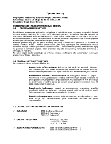 Opis techniczny Do projektu rozbudowy budynku Urzędu Gminy w Łowiczu Lokalizacja: Łowicz ul. Długa 12 dz. nr ewid. 2124 Inwestor : Urząd Gminy Łowicz PRZEZNACZENIE I PROGRAM UśYTKOWY OBIEKTU 1.1 PRZEZNACZENIE BUDYNKU Przedmiotem opracowania jest projekt rozbudowy Urzędu Gminy wraz ze zmiana konstrukcji dachu i przystosowaniem budynku do potrzeb osób niepełnosprawnych. Rozbudowa budynku pozwoli na stworzenie efektywnej bryły architektonicznej , która będzie nawiązywała do otaczającej zabudowy. Rozbudowa budynku pozwoli na usprawnienie komunikacji wewnętrznej budynku jak równieŜ poprawi komfort pracy w budynku, oraz warunki bezpieczeństwa p.poŜ. Budynek przeznaczony jest do pracy biurowej związanej z administracja publiczną jak równieŜ do obsługi klientów. Część parteru przeznaczono jako salę operacyjną dla umieszczenia dwóch stanowisk obsługi klientów jako okienka stanowiskowe. Powierzchnie uŜytkowe zlokalizowane będą na parterze i pierwszym piętrze. Dach projektuje się jako dwuspadowy konstrukcji drewnianej , istniejący do rozbiórki. Na tylnej części działki projektuje się wykonać miejsca parkingowe dla samochodów osobowych pracowników Urzędu i petentów. 1.2 PROGRAM UśYTKOWY BUDYNKU Na program uŜytkowy budynku składają się: Przestrzenie ogólnodostępne, którymi są hall wejściowy do części biurowej, sala informacyjna, oraz układ komunikacyjny wykończone w sposób docelowy. Przewidziane dla przebywania do 2 pracowników oraz 4 interesantów jednocześnie Przestrzenie biurowe i konferencyjne na kondygnacji parteru i I piętra . Przestrzenie te będą przeznaczone według indywidualnych potrzeb inwestora na prace poszczególnych jednostek organizacyjnych. W przestrzeniach tych przewiduje się przebywanie w kaŜdym pokoju po jednym stałym pracowniku oraz do max. 10 osób przebywających czasowo. Przestrzenie techniczne, którymi są pomieszczenia zawierające wszelkie urządzenia techniczne, związane z dostawą energii elektrycznej, cieplnej, wody, świeŜego powietrza zlokalizowanych w piwnicy budynku. Przestrzenie pomocnicze pomieszczenia magazynowe, zespoły sanitarne i inne, które mogą być zaklasyfikowane jako uŜytkowane wspólnie lub przez uŜytkowników. 1.3 CHARAKTERYSTYCZNE PARAMETRY TECHNICZNE KUBATURA - 1931 ,2m3 (projektowana) - 1775,5m3 (istniejąca ) - 3706,7m3 (całkowita) GABARYTY BUDYNKU – - ZESTAWIENIE POWIERZCHNI – - WYSOKOŚĆ - 10,740m SZEROKOŚĆ – 13,63m DŁUGOŚĆ - 28,28m ILOŚĆ KONDYGNACJI PODZIEMNYCH - 1 ILOŚĆ KONDYGNACJI NADZIEMNYCH - 2 - POWIERZCHNIA POWIERZCHNIA POWIERZCHNIA POWIERZCHNIA POWIERZCHNIA ZABUDOWY BUDYNKU PROJEKTOWANA – 115,50m2 ZABUDOWY SCHODÓW I PODJAZDU – 56,82m2 ZABUDOWY CAŁKOWITA – 317,2m2+56,82m2 UśYTKOWA PROJEKTOWANA – 202,10m2 UśYTKOWA CAŁKOWITA – 518,90m2 2. FORMA I FUNKCJA OBIEKTU 2.1 FORMA ARCHITEKTONICZNA Przedstawiony projekt przewiduje wystawienie zwartego w bryle budynku nie przekraczającego wysokości 12,0m z funkcją administracyjną i biurową – w parterze przewiduje się salę operacyjna obsługi klientów wraz z pomieszczeniami biurowymi do pracy, a na piętrze salę konferencyjną i pomieszczenia biurowe. Zewnętrzne fasady budynku przewidziano jako proste płaszczyzny z poziomymi boniami i gzymsem w części elewacji. Zewnętrzną strukturę ścian przewiduje się jako drobnoziarnisty tynk mineralny zacierany na gładko. Z uwagi na róŜne rzędne poziomów stropów okna w elewacji nie będą w jednej linij poziomej. Elewacja wejściowa od strony zachodniej częściowo przeszklona , główne wejście do budynku stanowi podcień opartą na trzech słupach okrągłych podpierających wyŜszą kondygnację. Budynek obsługiwany jest jedną główną klatką schodową umiejscowiona w projektowanej części rozbudowy druga klatka schodowa istniejąca pełnić będzie rolę pomocniczej. Elewacje frontową budynku usytuowano przy linij rozgraniczającej od strony zachodniej. Pozostałe obrysy budynku pozostają bez zmian. 2.2 FUNKCJA OBIEKTU W budynku przewidziano na parterze salę informacyjną obsługi klientów Urzędu Gminy wraz z pochylnią dla osób niepełnosprawnych usytuowaną na zewnątrz budynku. Na parterze rozmieszczono w najniŜszej części poziomu tej kondygnacji pomieszczenia biurowe o największym kontakcie z petentami. Na piętrze rozmieszczono sale konferencyjną oraz pomieszczenia biurowe. W kondygnacji podziemnej usytuowana jest archiwum oraz pomieszczenia techniczne i pomocnicze . 2.3 ROZWIĄZANIA BUDOWLANE OPIS ROZWIĄZAŃ MATERIAŁOWYCH Roboty rozbiórkowe: Ściany Istniejące ściany budynku naleŜy w części wyburzyć lub zamurować otwory. Rozbiórce ulegają ściany nad stropem nad pierwszym piętrem jako szczytowe murki ogniowe , część ścianek działowych na piętrze i piętrze . Rozkucia pod otwory drzwiowe lub okienne dotyczą obu kondygnacji starej części budynku. Rozbiórce podlega murowana część schodów zewnętrznych wraz z podestem i płyta schodową. Na piętrze rozbiórce podlega ściana do obecnej sali konferencyjnej jako wewnętrzna oraz zewnętrzna szczytowa w miejscu nowej komunikacji. Na parterze rozbiórce podlegają ścianki działowe w sanitariatach oraz poszerzenia ścian przy tylnym wyjściu wykonane jako osłona tablicy elektrycznej. W miejscach przekuć przez ściany naleŜy wykonać nadproŜa prefabrykowane z prefabrykowanych belek Ŝelbetowych 10x20cm o długości większej od otworu o min 25 cm. NadproŜa w ścianach zewnętrznych istniejącej części wykonać wg rysunków konstrukcyjnych. Po rozkuciu na właściwą szerokość otwory drzwiowego naleŜy obsadzić nadproŜe na właściwej wysokości i wymurować nad nim ścianę. Dach: W celu montaŜu nowej konstrukcji dachu naleŜy istniejąca konstrukcję dachu z płyty rozebrać wraz z istniejącym pokryciem z papy oraz kominami ponad dachem. Komin paleniskowy od kotłowni naleŜy rozebrać do wysokości stropu i zakończyć g