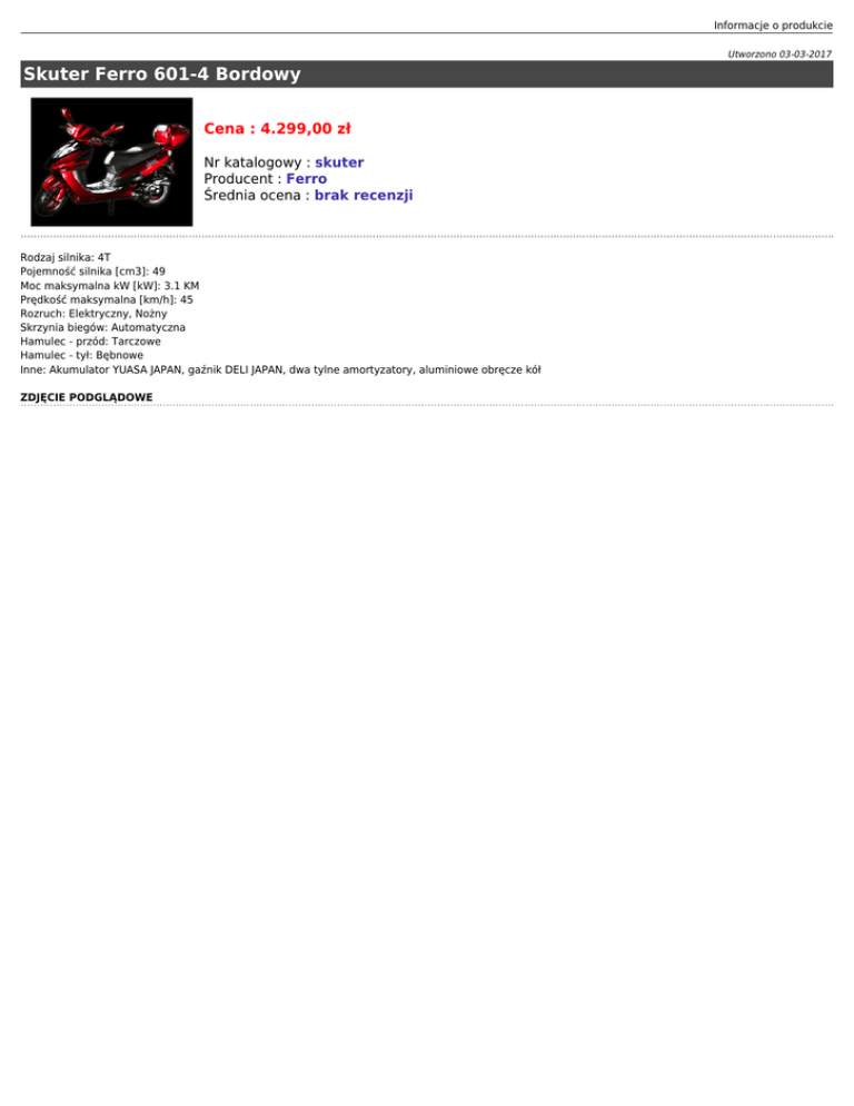 Informacje o produkcie Utworzono 03-03-2017 Skuter Ferro 601-4 Bordowy Cena : 4.299,00 zł Nr katalogowy : skuter Producent : Ferro Średnia ocena : brak recenzji Rodzaj silnika: 4T Pojemność silnika [cm3]: 49 Moc maksymalna kW [kW]: 3.1 KM Prędkość maksymalna [km/h]: 45 Rozruch: Elektryczny, Nożny Skrzynia biegów: Automatyczna Hamulec - przód: Tarczowe Hamulec - tył: Bębnowe Inne: Akumulator YUASA JAPAN, gaźnik DELI JAPAN, dwa tylne amortyzatory, aluminiowe obręcze kół ZDJĘCIE PODGLĄDOWE