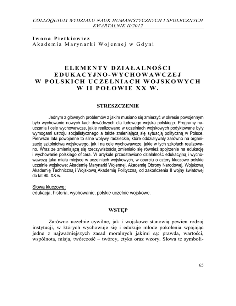 COLLOQUIUM WYDZIAŁU NAUK HUMANISTYCZNYCH I SPOŁECZNYCH KWARTALNIK II/2012 Iwona Pietkiewicz Akademia Marynarki Wojennej w Gdyni ELEMENTY DZIAŁALNOŚCI EDUKACYJNO-WYCHOWAWCZEJ W POLSKICH UCZELNIACH WOJSKOWYCH W II POŁOWIE XX W. STRESZCZENIE Jednym z głównych problemów z jakim musiano się zmierzyć w okresie powojennym było wychowanie nowych kadr dowódczych dla ludowego wojska polskiego. Programy nauczania i cele wychowawcze, jakie realizowano w uczelniach wojskowych podyktowane były wymogami ustroju socjalistycznego a także zmieniającą się sytuacją polityczną w Polsce. Pierwsze lata powojenne to silne wpływy radzieckie, które oddziaływały zarówno na organizację szkolnictwa wojskowego, jak i na cele wychowawcze, jakie w tych szkołach realizowano. Wraz ze zmieniającą się rzeczywistością zmieniało się również spojrzenie na edukację i wychowanie polskiego oficera. W artykule przedstawiono działalność edukacyjną i wychowawczą jaka miała miejsce w uczelniach wojskowych, w oparciu o cztery kluczowe polskie uczelnie wojskowe: Akademię Marynarki Wojennej, Akademię Obrony Narodowej, Wojskową Akademię Techniczną i Wojskową Akademię Polityczną, od zakończenia II wojny światowej do lat 90. XX w. Słowa kluczowe: edukacja, historia, wychowanie, polskie uczelnie wojskowe. WSTĘP Zarówno uczelnie cywilne, jak i wojskowe stanowią pewien rodzaj instytucji, w których wychowuje się i edukuje młode pokolenia wpajając jedne z najważniejszych zasad moralnych jakimi są: prawda, wartości, wspólnota, misja, twórczość – twórcy, etyka oraz wzory. Słowa te symboli- 65 Iwona Pietkiewicz zują uczelnie wyższe od średniowiecza do dzisiaj nie straciły na wartości1. W murach uczelni wyższych nie tylko edukuje się i kształci młode pokolenia, w trakcie trwania tych dwóch procesów młodzież poddawana jest również trzeciemu – wychowaniu. Wieloletnie badania dotyczące procesu wychowania nie doprowadziły do wyłonienia jednej definicji wychowania. Według M. Łobockiego wychowanie jest to działanie zamierzone, którego celem jest przygotowanie człowieka do samodzielnego życia i uczestnictwa w życiu społecznym. Jest to ogół działań rodzica, jak i wychowawcy mający na celu ukształtowanie psychiki człowieka pod względem intelektualnym, emocjonalnym i wolicjonalnym2. Na podstawie przytoczonej definicji doskonale uwidacznia się dwuaspektowe spojrzenie na proces wychowania. Wychowanie zatem można rozumieć w znaczeniu szerokim, gdzie przedmiotem wychowania jest całość psychiki człowieka, ogół procesów i właściwości psychicznych, zarówno intelektualnych, emocjonalnych, wolicjonalnych i działaniowych oraz w znaczeniu wąskim, gdzie przez pojęcie wychowanie rozumie się kształtowanie charakteru jednostki, jej postaw, przekonań i motywów działania. Wychowanie nie jest procesem kończącym się w określonym wieku człowieka. Procesowi wychowania i związanym z tym procesem zmianom osobowościowym, człowiek podlega przez całe życie co oznacza, że o wychowaniu możemy mówić również w stosunku do osób dorosłych. Za encyklopedią pedagogiczną można przytoczyć, iż wychowanie dorosłych jest to „(…) intencjonalne tworzenie określonych, odpowiednich do założonych zadań, sytuacji wychowawczych w celu oddziaływania na osobowość człowieka dorosłego oraz kierowanie bodźcami wpływającymi na jego dalszy rozwój”3. Niezależnie od czasów czy instytucji prowadzącej, wychowaniu dorosłych przyświecają określone cele oraz realizacja zadań zbliżających wychowanka-dorosłego do obowiązującego ideału wychowania. Przyporządkowane są temu określone treści i metody pracy, które mają pomóc w tworzeniu pożądanego ideału osobowościowego – osoby o określonych cechach osobowościowych. Wychowanie wojskowe to system wychowawczy składający się z zespołu elementów obejmujących cele, treści, zasady pedagogiczne oraz formy, metody i środki działania przełożonych, i podwładnych, które powin- 1 Por. J. Woźnicki, Uczelnie akademickie jako instytucje życia publicznego, Fundacja Rektorów Polskich, Warszawa 2007, s. 21. 2 Por. M. Łobocki, Teoria wychowania, Impuls, Kraków 2008, s. 32. 3 Encyklopedia pedagogiczna XXI, pod red. T. Pilcha, t. VII, Żak, Warszawa 2008, s. 348. 66 COLLOQUIUM WNHiS Elementy działalności edukacyjno-wychowawczej w polskich uczelniach wojskowych… ny zapewnić skuteczną realizację zadań stojących przed wojskowymi uczelniami i jednostkami w określonym czasie ich funkcjonowania4. Zmieniająca się rzeczywistość społeczno-polityczna w Polsce po zakończeniu II wojny światowej spowodowała zmiany w priorytetach życiowych obywateli oraz w ideale wychowawczym obywatela polskiego. Jedne cechy uległy dewaluacji a inne zyskały na znaczeniu, nie mniej można przytoczyć, takie które stanowią o wzorze osobowym żołnierza i powinny być wykreowane w procesie wychowania wojskowego niezależnie od sytuacji politycznej państwa. Bez wątpienia można tu wymienić: − prawdomówność – umiłowanie prawdy, jako wartości fundamentalnej; − sprawiedliwość – poszanowanie uprawnień drugiego człowieka i poszczególnych społeczności do określonych dóbr osobowych i materialno-rzeczowych; − odpowiedzialność – umiejętność wzięcia na siebie obowiązku dbania i troszczenia się o innych oraz wartości trwałe związane z dobrem ojczyzny i narodu; − poświęcenie – umiejętność zrzeczenia się praw własnych na rzecz ogółu lub innej osoby, uznanie czyichś potrzeb za ważniejsze od własnych; − patriotyzm – miłość do ojczyzny, nosząca znamiona miłości ofiarnej, gotowej do najwyższego poświęcenia, niejednokrotnie do czynów heroicznych; − sumienność – dokładne wykonywanie określonych czynności, osobiste zaangażowanie; − wytrwałość – przezwyciężenie niedogodności oraz zdolności trwania do końca na powierzonym
