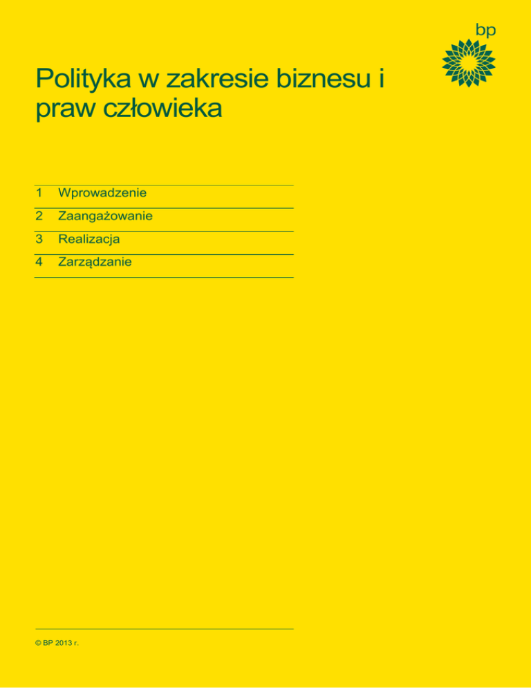 Polityka w zakresie biznesu i praw człowieka 1 Wprowadzenie 2 Zaangażowanie 3 Realizacja 4 Zarządzanie © BP 2013 r. Polityka w zakresie biznesu i praw człowieka 1. Wprowadzenie Zaopatrujemy świat w energię. Poszukujemy jej kluczowych źródeł, rozwijamy zasoby i wykorzystujemy je w procesie produkcji. Źródła te przetwarzamy na produkty, których wszyscy potrzebujemy. Cały świat potrzebuje coraz więcej energii, która przybiera różne formy. Jest ona i zawsze będzie kluczowym zasobem ludzkości i gwarantem postępu. Spodziewamy się wysokich wymagań w zakresie standardów, jakimi kieruje się nasza firma w swojej działalności. Dokładamy wszelkich starań, by być liderem bezpieczeństwa w naszej branży, światowej klasy operatorem z poczuciem obywatelskiej odpowiedzialności i znakomitym pracodawcą. Starannie rozważamy wpływ naszych decyzji, niezależnie od ich kalibru, na otaczający nas świat i ludzi. W tym także wpływ na prawa człowieka. Działania i operacje naszej firmy jako pracodawcy, inwestora, partnera, sąsiada i dostawcy energii mogą przynieść wiele korzyści zarówno indywidualnym osobom, jak i całym społeczeństwom czy społecznościom. do pracy w środowisku i w warunkach poszanowania praw i godności człowieka. 5. Przestrzegamy prawa swobody do zrzeszania się. Wszędzie tam, gdzie nasi pracownicy kolektywnie zadecydują, iż pragną być reprezentowani przez związki zawodowe lub rady pracownicze, będziemy współpracować w dobrej wierze z tymi organizacjami stosownie do odpowiednich krajowych ram prawnych. 6. Szanujemy prawa członków społeczności, na które wpływa nasza działalność. Dołożymy starań, by rozpoznać negatywne oddziaływania na prawa człowieka, zapobiegać im, łagodzić je i/lub minimalizować. 7. Postaramy się dokonywać zapisów kontraktowych w umowach z dostawcami zachęcając ich do przestrzegania zasad zawartych w niniejszej deklaracji. 3. Realizacja 1. Dotrzymamy naszego obowiązku poszanowania praw człowieka wdrażając stosowne punkty zasad przewodnich ONZ dotyczących biznesu i praw człowieka do procesów i polityki rządzących całą naszą działalnością biznesową. 2. Zaangażowanie 2. Będziemy pracować nad wprowadzeniem praw człowieka w stosownym zakresie do 1. Prowadzimy naszą działalność przy ocen oddziaływania na społeczeństwo i poszanowaniu praw i godności wszystkich środowisko. W procesach oceny wpływu i ludzi przestrzegając wszelkich wymogów rozwiązywania problemów związanych z prawnych. oddziaływaniem naszych operacji i relacji, 2. Szanujemy przyjęte na całym świecie będziemy - tam gdzie jest to możliwe i prawa człowieka zawarte w Powszechnej właściwe - konsultować się z osobami Deklaracji Praw Człowieka oraz Deklaracji potencjalnie dotkniętymi, z uwzględnieniem Międzynarodowej Organizacji Pracy ludności miejscowej przy poszanowaniu dotyczącej fundamentalnych zasad i praw w stosownym wymogów prawnych. pracy. 3. Jeśli BP zidentyfikuje przypadki wywołania 3. Zgodnie z zasadami przewodnimi ONZ lub bezpośredniego przyczynienia się do dotyczącymi biznesu i praw człowieka, powstania negatywnego oddziaływania na uznajemy naszą odpowiedzialność w prawa człowieka innych osób, nasza firma zakresie poszanowania praw człowieka i winna wdrożyć stosowne procesy unikania współudziału w ich łamaniu. zabezpieczające bądź naprawcze. 4. Każda osobę pracującą dla BP traktujemy 4. Nadal zamierzamy pełnić konstruktywną i uczciwie, nikogo nie dyskryminując. Nasza przodującą rolę w inicjatywach związanych załoga oraz personel agencyjny mają prawo z prawami człowieka angażując wszystkie grupy interesów z uwzględnieniem Polityka w zakresie biznesu i praw człowieka 1 dobrowolnych zasad dotyczących bezpieczeństwa i praw człowieka. Wierzymy, iż zaangażowanie wszystkich grup interesów to wydajny sposób promowania rozsądnych standardów pozytywnych zmian w praktykach odnośnie praw człowieka na poziomie operacyjnym. 5. Dopilnujemy, by nasze relacje z rządami, organami nadzorującymi i władzami publicznymi pozostawały w zgodzie ze zobowiązaniami w zakresie praw człowieka określonymi w niniejszej polityce. 6. W przypadku konfliktu pomiędzy wymogami prawnymi a niniejszą deklaracją polityki firma winna dokładać starań, by zawsze stosować najbardziej rygorystyczny standard, jak ustalono w zasadach przewodnich ONZ dotyczących biznesu i praw człowieka, bez łamania krajowego prawa. 4. Zarządzanie 1. Niniejsza deklaracja polityki obowiązuje każdego pracownika i członka zarządu w każdej jednostce stanowiącej własność BP oraz we wszystkich podmiotach joint ventures w możliwym i uzasadnionym zakresie stosownym do wielkości udziału BP. W przypadkach, kiedy BP nie posiada pełnej kontroli nad spółką joint venture, dołożymy rozsądnych starań, by zarówno sama spółka jak i jej partnerzy przestrzegali podobnych reguł. 2. Zgodnie z zasadami niniejszej polityki BP winna rejestrować i raportować wewnętrznie wszystkie zasadne negatywne oddziaływania na prawa człowieka. 3. BP winna również corocznie informować udziałowców o realizacji polityki nakreślonej w niniejszej deklaracji. 2 Polityka w zakresie biznesu i praw człowieka