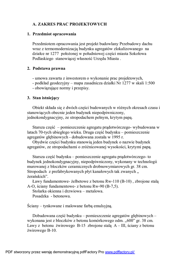 A. ZAKRES PRAC PROJEKTOWYCH 1. Przedmiot opracowania Przedmiotem opracowania jest projekt budowlany Przebudowy dachu wraz z termomodernizacją budynku agregatów zlokalizowanego na działce nr 1277 położonej w południowej części miasta Sokołowa Podlaskiego stanowiącej własność Urzędu Miasta . 2. Podstawa prawna - umowa zawarta z inwestorem o wykonanie prac projektowych, - podkład geodezyjny – mapa zasadnicza działki Nr 1277 w skali 1:500 - obowiązujące normy i przepisy. 3. Stan istniejący Obiekt składa się z dwóch części budowanych w różnych okresach czasu i stanowiących obecnie jeden budynek niepodpiwniczony, jednokondygnacyjny, ze stropodachem pełnym, krytym papą. Starsza część – pomieszczenie agregatu prądotwórczego- wybudowana w latach 70-tych ubiegłego wieku. Druga część budynku – pomieszczenie agregatów głębinowych - dobudowana została w 1995 r. Obydwie części budynku stanowią jeden budynek o nazwie budynek agregatów, ze stropodachami o zróżnicowanej wysokości, krytymi papą. Starsza część budynku – pomieszczenie agregatu prądotwórczego- to budynek jednokondygnacyjny, niepodpiwniczony, wykonany w technologii murowanej z bloczków ceramicznych drobnowymiarowych gr. 38 cm. Stropodach z prefabrykowanych płyt kanałowych tak zwanych „ żerańskich”. Ławy fundamentowe- żelbetowe z betonu Rw-110 (B-10) , zbrojone stalą A-O, ściany fundamentowe- z betonu Rw-90 (B-7,5). Stolarka okienna i drzwiowa – metalowa. Posadzka - betonowa. Ściany – tynkowane i malowane farbą emulsyjną. Dobudowana część budynku – pomieszczenie agregatów głębinowych – wykonana jest z bloczków z betonu komórkowego odm. „600” gr. 38 cm. Lawy z betonu żwirowego B-15 zbrojone stalą A – III, ściany z betonu żwirowego B-10. PDF stworzony przez wersję demonstracyjną pdfFactory Pro www.pdffactory.pl/ Stropodach z prefabrykowanych płyt kanałowych. Stolarka okienna i drzwiowa – metalowa. Posadzka – betonowa. Zróżnicowane wysokościowo stropodachy budynku nie posiadają odpowiednich spadków powodując zastoiny wody, co przy złym stanie technicznym pokrycia dachu papą powoduje liczne przecieki wody przez strop. Różne wysokości stropodachów w okresie zimy są przyczyną zalegania śniegu, na dachach a w konsekwencji dużych przecieków wody przez strop podczas rozpuszczania się śniegu. Ściany zewnętrzne budynku z elementów drobnowymiarowych ceramicznych gr. 38 cm./ część stara/ i z boczków z betonu komórkowego gr.38 cm / część dobudowana/, otynkowane, nie spełniają wymogów normy cieplnej i wymagają docieplenia. Stolarka okienna metalowa w obu częściach budynku nieszczelna, skorodowana, wymaga wymiany. 4. Ocena stanu technicznego obiektu którego dach przewidziany jest do przebudowy. 4.1. Podstawa sporządzenia oceny: - wizja lokalna, oględziny, pomiary widocznych elementów konstrukcyjnych, dokumentacja fotograficzna , informacje o remontach zebrane od użytkownika budynku, - dokumentacja projektowa archiwalna budynku, - obowiązujące przepisy, rozporządzenia budowlane i wydawnictwa fachowe. 4.2. Przedmiot, zakres i cel opracowania: Przedmiotem opracowania jest ocena stanu technicznego istniejącego budynku pod kątem planowanej przebudowy dachu oraz wykonania termomodernizacji stropów i ścian. Obiekt składa się z dwóch części budowanych w różnych okresach czasu i stanowiących obecnie jeden budynek niepodpiwniczony, jednokondygnacyjny, ze stropodachem pełnym, krytym papą. 4.3. Dane techniczne obiektu. : PDF stworzony przez wersję demonstracyjną pdfFactory Pro www.pdffactory.pl/ - powierzchnia zabudowy - 102,5 m2 - powierzchnia użytkowa - 71,60 m2 - kubatura - 542,60 m2 Część obiektu – pomieszczenie agregatu prądotwórczego- jest najstarszą częścią budynku wybudowaną w latach 70-tych ubiegłego wieku. Druga część budynku – pomieszczenie agregatów głębinowych - dobudowana została wg dokumentacji z 1995 r. Obydwie części budynku stanowią jeden budynek o nazwie budynek agregatów, ze stropodachami o zróżnicowanej wysokości, krytymi papą. 4.4. Dane techniczno – materiałowe Pierwotna – stara część budynku – pomieszczenie agregatu prądotwórczego- to budynek jednokondygnacyjny, niepodpiwniczony, wykonany w technologii murowanej z bloczków ceramicznych drobnowymiarowych gr. 38 cm. Stropodach z prefabrykowanych płyt kanałowych tak zwanych „ żerańskich”. Ławy fundamentowe- żelbetowe z betonu Rw-110 (B-10) , zbrojone stalą A-O, ściany fundamentowe- z betonu Rw-90 (B-7,5). Stolarka okienna i drzwiowa – metalowa. Posadzka - betonowa. Ściany – tynkowane i malowane farbą emulsyjną. Dobudowana część budynku – pomieszczenie agregatów głębinowych – wykonana jest z bloczków z betonu komórkowego odm. „600” gr. 38 cm. Ławy z betonu żwirowego B-15 zbrojone stalą A – III, ściany z betonu żwirowego B-10. Stropodach z prefabrykowanych płyt kanałowych. Stolarka okienna i drzwiowa – metalowa. Posadzka – betonowa. PDF stworzony przez wersję demonstracyjną pdfFactory Pro www.pdffactory.pl/ 4.5. Ocena stanu technicznego budynku Stan techniczny budynku od zewnątrz: teren wokół budynku płaski, z opaską betonową odprowadzającą wody opadowe od budynku, - cokół betonowy o wys.15 cm nad poziomem terenu, - ściany zewnętrzne budynku z elementów drobnowymiarowych ceramicznych gr. 38 cm./ część stara/ i z boczków z betonu komórkowego gr.38 cm / część dobudowana/, otynkowane, nie spełniają wymogów normy cieplnej i wymagają docieplenia. - elewacje – dawno nie remontowane- pojawiły się niegrożne spękania i lokalne odparzenia tynku, poziome spękania tynku – w poziomie gzymsu i stropu – typowe dla stropodachów niewentylowanych – spowodowane ruchami termicznymi na styku pomieszczeń ogrzewanych z przemarzającym fragmentem ściany nad stropem w zimie a latem między stropem a nagrzewającą się betono