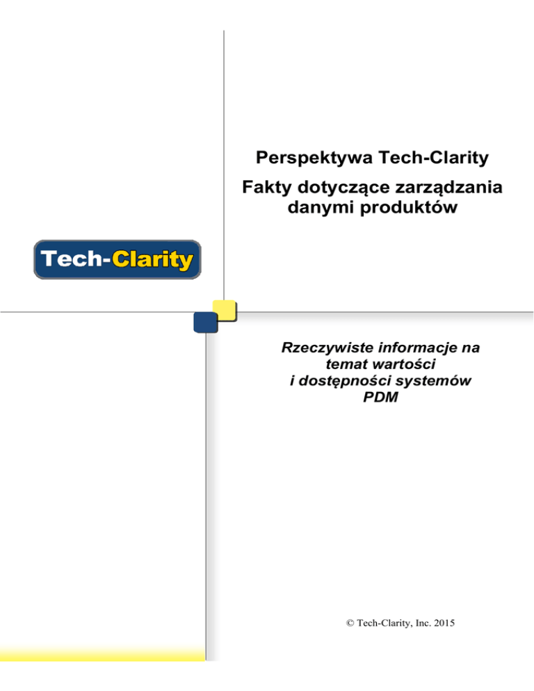 Perspektywa Tech-Clarity Fakty dotyczące zarządzania danymi produktów Rzeczywiste informacje na temat wartości i dostępności systemów PDM © Tech-Clarity, Inc. 2015 Spis treści Wprowadzenie ..................................................................................................... 3 Korzyści płynące z wydajnego zarządzania danymi ........................................... 4 Wyzwania związane z projektowaniem i czynniki wpływu................................... 6 Identyfikowanie najbardziej wydajnych przedsiębiorstw ..................................... 8 Ocena podejścia do zarządzania danymi ............................................................ 9 Dlaczego nie wszyscy używają systemów PDM? ............................................. 11 Mit: „Nie projektujemy w 3D” ............................................................................. 12 Systemy PDM — mity dotyczące czasu i kosztów ............................................ 14 Mit: „Firma jest zbyt mała, aby używać systemu PDM” ..................................... 15 Mit: „Wszystko albo nic” ..................................................................................... 16 Mit: „Systemy PDM służą tylko do zarządzania plikami CAD” .......................... 18 Mit: „Systemy PDM to narzędzia tylko dla inżynierów”...................................... 19 Wnioski .............................................................................................................. 20 Zalecenia ........................................................................................................... 21 Informacje o autorze .......................................................................................... 22 Informacje o badaniu ......................................................................................... 22 2 © Tech-Clarity, Inc. 2015 Wprowadzenie Zarządzanie danymi produktu (Product Data Management — PDM) pomaga firmom usprawnić kontrolę, dostęp i współużytkowanie newralgicznych plików i informacji produktowych. Jednak ważniejsze niż to, jak dokładnie działają systemy PDM, są korzyści, jakie płyną z ich stosowania. Raport firmy Tech-Clarity pt. The Business Value of Product Data Management (Wartość biznesowa zarządzania danymi produktu) dowodzi, że firmy uzyskują strategiczne korzyści biznesowe w wyniku zastosowania systemów PDM. Obejmuje to między innymi: skrócenie czasu wprowadzania produktów na rynek, podniesienie jakości produktów, rozszerzenie zakresu innowacji, ulepszenie wydajności, redukcję kosztów produktów i inne. Z kolei wyniki ankiety pt. Best Practices for Managing Design Data (Sprawdzone procedury zarządzania danymi projektowymi) wykazują, że usprawnienia operacyjne wynikające z zastosowania systemów PDM „prowadzą do większej rentowności produktów oraz wydajności biznesowej”. To, że systemy PDM są wartościowe, nie podlega dyskusji. Jednak nie wszystkie przedsiębiorstwa zarządzają danymi. Dlaczego? W wynikach ankiety podano wiele przyczyn, a niektóre z nich mogą wydać się zaskakujące. Główną przyczyną zdecydowanie nie jest brak potrzeby stosowania takich systemów. Wyniki badania wykazują, że zaledwie 8 procent firm, które nie używają systemów PDM, decyduje tak dlatego, że nie mają żadnych problemów związanych z zarządzaniem danymi (rys. 6). Tylko 8 procent firm, które nie używają systemów PDM, decyduje tak dlatego, że nie mają żadnych problemów związanych z zarządzaniem danymi. Co więc powoduje, że tak istotne narzędzie nie jest powszechnie stosowane? Bardzo często użytkownicy nie zdają sobie sprawy z tego, jak działają systemy PDM. Wyniki badania wykazują na przykład, ze około jedna czwarta użytkowników, którzy nie stosują systemów PDM, nie zdaje sobie sprawy z korzyści, jakie płyną z ich zastosowania (24%) i/lub nie wiedzą, czym są systemy PDM (21%). Istnieją również inne nieporozumienia. Na przykład niektórzy błędnie sądzą, że firmy, które korzystają przede wszystkim z narzędzi CAD 2D i dokumentacji biurowej, nie mogą liczyć na żadne korzyści po wprowadzeniu systemu PDM. Istnieje wiele błędnych informacji dotyczących tego, kto powinien używać systemów PDM oraz trudności z ich wdrożeniem. Implementowanie tych systemów może czasem faktycznie wiązać się ze znaczną ilością czasu i sporymi kosztami, ale niekoniecznie. Inni uważają, że korzyści płynące z zastosowania systemów PDM dotyczą tylko dużych firm, albo że systemy te można stosować tylko w działach inżynieryjnych. Istnieje jak widać wiele mitów, które wymagają wyjaśnienia — a do tego niezbędne są fakty. 3 © Tech-Clarity, Inc. 2015 Czas, aby firmy przestały wierzyć w plotki o systemach PDM i poznały fakty, co z kolei pozwoli im rozpocząć poprawę działalności. Aby zgromadzić wiarygodne dane i sprowokować praktyczne dyskusje, firma TechClarity przeprowadziła wśród ponad 2500 firm ankietę dotyczącą ich doświadczeń z zarządzaniem danymi. Czas, aby firmy przestały wierzyć w plotki o systemach PDM i poznały fakty, co pozwoli im z kolei rozpocząć poprawę działalności. W przeciwnym razie pozostaje zrezygnować z zarządzania danymi (lub zarządzać nimi ręcznie), co jest w najlepszym razie rozwiązaniem nieefektywnym, a w najgorszym — wysoce ryzykownym. Jak wyjaśniono w raporcie The Basics of Managing CAD (Podstawy zarządzania systemami CAD) „niektóre firmy zauważają ograniczenia i czynniki ryzyka związane z ręcznym podejściem do zarządzania danymi, lecz inne są dosłownie o krok od konieczności uczenia się na własnych błędach”. Korzyści płynące z wydajnego zarządzania danymi Przed rozpoczęciem dyskusji na temat mitów dotyczących systemów PDM warto zapoznać się z korzyściami, jakie płyną z ich stosowania. Systemy PDM wg firmy TechClarity (rys. 1) realizują trz