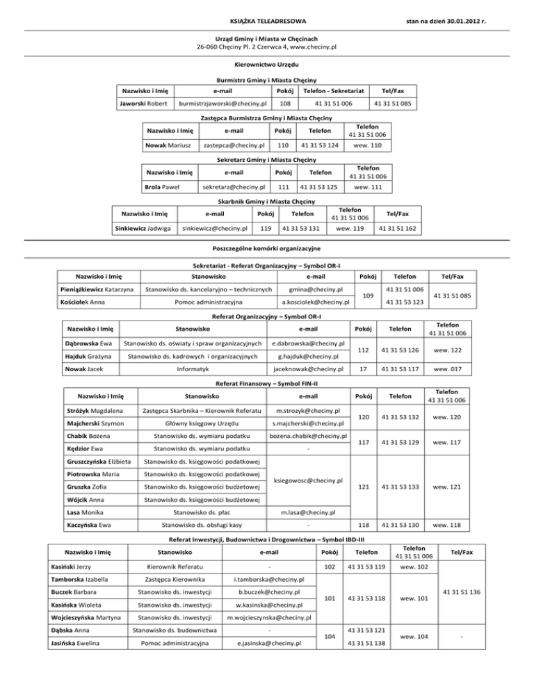 KSIĄŻKA TELEADRESOWA stan na dzień 30.01.2012 r. Urząd Gminy i Miasta w Chęcinach 26-060 Chęciny Pl. 2 Czerwca 4, www.checiny.pl Kierownictwo Urzędu Burmistrz Gminy i Miasta Chęciny Nazwisko i Imię e-mail Pokój Telefon - Sekretariat Tel/Fax Jaworski Robert [email protected] 108 41 31 51 006 41 31 51 085 Zastępca Burmistrza Gminy i Miasta Chęciny Nazwisko i Imię e-mail Pokój Telefon Telefon 41 31 51 006 Nowak Mariusz [email protected] 110 41 31 53 124 wew. 110 Sekretarz Gminy i Miasta Chęciny e-mail Pokój Telefon Telefon 41 31 51 006 [email protected] 111 41 31 53 125 wew. 111 Nazwisko i Imię Brola Paweł Skarbnik Gminy i Miasta Chęciny Nazwisko i Imię e-mail Pokój Telefon Telefon 41 31 51 006 Tel/Fax Sinkiewicz Jadwiga [email protected] 119 41 31 53 131 wew. 119 41 31 51 162 Poszczególne komórki organizacyjne Sekretariat - Referat Organizacyjny – Symbol OR-I Nazwisko i Imię Stanowisko e-mail Pieniążkiewicz Katarzyna Stanowisko ds. kancelaryjno – technicznych [email protected] Pomoc administracyjna [email protected] Kościołek Anna Pokój Telefon Tel/Fax 41 31 51 006 109 41 31 51 085 41 31 53 123 Referat Organizacyjny – Symbol OR-I Nazwisko i Imię Stanowisko e-mail Dąbrowska Ewa Stanowisko ds. oświaty i spraw organizacyjnych [email protected] Hajduk Grażyna Stanowisko ds. kadrowych i organizacyjnych [email protected] Informatyk [email protected] Nowak Jacek Pokój Telefon Telefon 41 31 51 006 112 41 31 53 126 wew. 122 17 41 31 53 117 wew. 017 Pokój Telefon Telefon 41 31 51 006 120 41 31 53 132 wew. 120 117 41 31 53 129 wew. 117 121 41 31 53 133 wew. 121 118 41 31 53 130 wew. 118 Referat Finansowy – Symbol FIN-II Nazwisko i Imię Stanowisko e-mail Stróżyk Magdalena Zastępca Skarbnika – Kierownik Referatu [email protected] Majcherski Szymon Główny księgowy Urzędu [email protected] Chabik Bożena Stanowisko ds. wymiaru podatku [email protected] Kędzior Ewa Stanowisko ds. wymiaru podatku - Gruszczyńska Elżbieta Stanowisko ds. księgowości podatkowej Piotrowska Maria Stanowisko ds. księgowości podatkowej Gruszka Zofia Stanowisko ds. księgowości budżetowej Wójcik Anna Stanowisko ds. księgowości budżetowej Lasa Monika Stanowisko ds. płac [email protected] Stanowisko ds. obsługi kasy - Kaczyńska Ewa [email protected] Referat Inwestycji, Budownictwa i Drogownictwa – Symbol IBD-III Stanowisko e-mail Pokój Telefon Telefon 41 31 51 006 Kasiński Jerzy Kierownik Referatu - 102 41 31 53 119 wew. 102 Tamborska Izabella Zastępca Kierownika [email protected] 101 41 31 53 118 wew. 101 Nazwisko i Imię Buczek Barbara Stanowisko ds. inwestycji [email protected] Kasińska Wioleta Stanowisko ds. inwestycji [email protected] Wojcieszyńska Martyna Stanowisko ds. inwestycji [email protected] Stanowisko ds. budownictwa - Pomoc administracyjna [email protected] Dąbska Anna Jasińska Ewelina 104 41 31 53 121 41 31 51 138 wew. 104 Tel/Fax 41 31 51 136 - Referat Funduszy Pomocowych i Promocji – Symbol FPP-IV Stanowisko e-mail Pokój Telefon Telefon 41 31 51 006 Olejarz Krzysztof Kierownik Referatu [email protected] 14 41 31 53 116 wew. 014 Janusz Renata Zastępca Kierownika [email protected] Stanowisko ds. sportu oraz rozwiązywania problemów uzależnień [email protected] 6 41 31 53 112 wew. 005 13 41 31 53 115 wew. 013 Nazwisko i Imię Piotrowska Monika Łysak Joanna Stanowisko ds. pozyskiwania środków [email protected] Wrońska Anna Stanowisko ds. pozyskiwania środków [email protected] Redakcja miesięcznika „Wiadomości Chęcińskie” Referat Funduszy Pomocowych i Promocji – Symbol FPP-IV Telefon Nazwisko i Imię Stanowisko e-mail Pokój Telefon 41 31 51 006 Janusz Renata Olech Agnieszka Redaktor Naczelny [email protected] Dziennikarka [email protected] 6 41 31 53 112 wew. 005 Centrum Informacji Turystycznej i Historycznej Gminy Chęciny „Niemczówka” ul. Małogoska 7 Zamek Królewski w Chęcinach e-mail: [email protected] Centrum jest częścią Referatu Funduszy Pomocowych i Promocji – Symbol FPP-IV Nazwisko i Imię Stanowisko e-mail Kasiński Krzysztof Stanowisko ds. obsługi Punktu Informacji Turystycznej [email protected] Telefon Kowalski Dominik Stanowisko ds. obsługi Punktu Informacji Turystycznej [email protected] Kubicki Krzysztof Stanowisko ds. obsługi Punktu Informacji Turystycznej [email protected] 41 31 51 829 Referat Gospodarki Nieruchomościami, Ochrony Środowiska i Rolnictwa – Symbol GNOŚR-V Nazwisko i Imię Stanowisko e-mail Kurczyńska Zuzanna Kierownik Referatu [email protected] Mochocka Joanna Zastępca Kierownika [email protected] Gątkowska Anna Stanowisko ds. gospodarki nieruchomościami [email protected] Stanowisko ds. ochrony środowiska [email protected] Jokisz Ewa Pokój Telefon Telefon 41 31 51 006 114 41 31 53 128 wew. 114 113 41 31 53 127 wew. 113 Urząd Stanu Cywilnego – Symbol USC-VI i ewidencja ludności – Symbol SO-VI Nazwisko i Imię Stanowisko e-mail Szewczyk Henryk Kierownik Urzędu Stanu Cywilnego [email protected] Mochocka Joanna Zastępca Kierownika Urzędu Stanu Cywilnego [email protected] Woźniak Mirosława Stanowisko ds. ewidencji ludności i spraw obronnych [email protected] Podsiadło Grażyna Stanowisko do spraw obywatelskich, bezpieczeństwa i zarządzania kryzysowego oraz obrony cywilnej [email protected] Pokój Telefon Telefon 41 31 51 006 2 41 31 53 111 wew. 002 1 41 31 53 110 wew. 001 Biuro Rady Miejskiej i działalność gospodarcza – Symbol BRM-VII Nazwisko i Imię Stanowisko e-mail Nowak Teodozja Kierownik Biura Rady Miejskiej Maliszewska Anna Stanowisko ds. działalności gospodarczej Pokój Tel/Fax Telefon 41 31 51 006 Telefon 12 41 31 51 202 wew. 012 41 31 53 114 [email protected] [email protected] Gminna Komisja Rozwiązywania Problemów Alkoholowych – Symbol GKRPA-VIII Nazwisko i Imię Stanowisko e-mail Pokój Telefon Telefon 41 31 51 006 Piotrowska Monika Stanowisko ds. sportu oraz rozwiązywania problemów uzależnień [email protected] 6 41 31 53 112 w