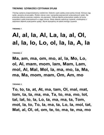 TRENING SZYBKOŚCI CZYTANIA SYLAB Trening czytania przeprowadzamy codziennie. Dziecko czyta sylaby przez jedną minutę. Kończy ciąg sylab, zaczyna od początku. Rodzic mierzy czas i sprawdza poprawność przeczytanych sylab. Nie przerywa dziecku podczas czytania, nie poprawia. Odlicza błędnie przeczytane sylaby od sumy wszystkich sylab przeczytanych w ciągu minuty. Kiedy dziecko zakończy czytanie, analizujemy z dzieckiem błędnie przeczytane sylaby. Wynik wpisujemy do tabeli treningu czytania. TRENING 1 Al, al, la, Al, La, la, al, Ol, al, la, lo, Lo, ol, la, la, A, la TRENING 2 Ma, am, ma, om, mo, al, la, Mo, Lo, ol, Al, mam, mom, lam, Mam, Lam, mol, Al, Mal, Mol, la, ma, mo, la, Ma, ma, Ma, mom, mam, Om, Am, mo TRENING 3 To, to, ta, at, At, ma, tam, Ol, mal, mat, tom, ta, ta, ma, ma, Ta, to, ma, mo, lot, tal, lat, lo, la, Lo, ta, ma, ma, ta, Tom, mot, la, to, To, la, ma, ta, Lo, la, mol, tat, Mat, al, Ol, ot, om, te, to, ma, te, ma, mo TRENING 4 Im, im, mi, Ti, Tim, tam, ti, ti, it, lot, til, mil, am, it, ot, mit, tit, tot, al, om, ma, ta, Ma, ti, lot, li, la, lal, lil, ta, mal, mat, Tim, Im, il, mi, la, li, mo, lit, to, Ol, tam, at, mam, mat, lat, ma, mi, mim, to, mi, mek TRENING 5 Et, el, te, to, im, me, Em, am, im, El, la, la, le, mi, le, et, me, ta, mi, le, i, le, Em, ma, Te, mat, tit, tet, ot, tot, met, Em, lat, mit, lot, il, el, Em, mi, mam, tam, im, Tim, met, mal, Em, me, mim, me, mo TRENING 6 Ka, ko, ke, ki, Ko, Ka, Ki, Ke, ek, ok, ek, mak, kam, kot, tok, Ka, ma, ma, ta, mat, ka, tat, ko, kat, ko, tek, tik, tak, lal, ka, kal, ka, kil, ka, mle, ko, ka, ka, o, Ol, ka, O, lek, Lil, ka, Al, ka, kil, la, kot, ki, mot, ki, lot, ki, ma, ki, mat, ki, kol, ka, lok, lak, kit, kat, tak, tok TRENING 7 Ja, ja, jo, oj, je, ej, Jej, aj, maj, tej, te, jam, jak, ka, jak, ki, je, mi, ja, ja, ma, ma, jak, jaj, ko, Mo, ja, mo, je, al, El, ki, jek, le, jek, ka, jak, lej, le, je, Jo, la, Ka, ja, tek, tik, mam, mim, Ka, mi, la, ta, to, ja, ka, ja, jo, jaj, ko, ko, lej, ko, lej, ka, tej, mej, toj, jot, Kaj, tek TRENING 8 Ja, sa, Se, So, os, Si, si, ja, jo, oj, je, ej, sam, tas, sit, sok, kas, kos, jes, set, jas, mas, sam, los, so, li, Kot, lis, li, sek, list, talk, mis, sel, ast, ma, list, ki, mak, smak, sma, ki, so, ki, mi, ski, mas, ki, ta, sak, mla, ska, ko, si, To, sia, Mi, sia, Le, sio, o, sa, TRENING 9 Miś, da, Do, Ed, Ed, do, di, di, De, dom, taś, tam, do, mek, Mo, da, Di, A, dam, E, mil, ka, Ka mil, ka, Dol, do, la, la, da, mas, kot, ka, lid, dal, da, le, ko, ko, me, ta, sod, so, da, kod, kot, mis, ka, Kaś, ka, Miś, ka, ślad, oś, le, oś, li, do, da, do da, je, do, dam, kos, os, tej, lis, do, mek TRENING 10 Ra, Or, Ro, ar, er, re, wo, Wa, we, wi, iw, ow, aw, rat, ram, ra, ta, wo, da, wir, ta, ta, rak, ra, ki, wi, no, trak, tor, wi, ta, ro, la, Ma, rek, Da, rek, Do, ro, ta, We, ra, As, mle, ko, wios, ka, we, se, le, la, sek, las, ka, lal, ka, miś, E, wa, jem, do, ja, da, wa, ta, ślad, mas, ka, Ra, sa, wos, wosk, wi, wis, or, ka, mar, ka, la, to, tor, wat, śli, mak, maś, lak, rok, wo, rek, kos, wra, wrak, kram, krat, ki, kra, ta, rol, ki, ro, wer, des, ka, ko, rek TRENING 11 Ul, ul, Lu, mu, tu, ru, wu, ku, uk, ów, ór, wór, dwór, ul, le, ról, król, kró, lo, wa, pa, pi, po, pat, map, dar, mar, ku, le, kul, ki, ku, ra, pa, ra, sol, Po, la, Pol, dek, Pol, ska, pa, ka, Po, lak, pra, sa, kro, pla, pal, to, por, po, ra, Ra, dek, Re, mis, pa, da, wpa, da, jem, ku, je, ma, lu, je, maś, lak, śli, mak, Pol, duś, sól, mól, piór, wiór, pik, sik, ślad, mas, ka, Ra, sa, wos, wosk, wi, Do, ro, ta, kro, pel, ka, staw, wi, je, pi, je, ki, je, U, la, wek TRENING 12 Na, no, Ne, ni, an, on, In, en, ca, co, Ce, ci, Ac, oc, ic, ec, ma, mą, mę, da, do, dę, ta, to, tę, sa, są, sę, wa, wo, wu, wę, wą, in, ni, noc, nos, no, sek, cep, sęp, pac, tac, kac, kic, kuc, mą, ka, mę, ka, trą, ca, ką, sa, sęk, car, cą, pie, ką, drą, drę, pa, lę, so, lę, so, lą, da, ją, ma, ją, nio, są, wi, si, duś, jem, klej, smar, nie, tak, lok, smak, nos, ki, cum, cu, ma, li, na, lin, los, da, ta, lek, cja, sta, ra, Pol, ska, por, wiór, król, mól, mur, ślad, miś, rak, rol, nik, nikt, nie, ma, Mo, je, des, ka, mrą, krę, ci, trą, ca, tar, ka, druk, dru, ku, je, na, cie, ra, ro, sa, wod, nik, da, le, ko, lek, le, ki, rol, ki, śrut TRENING 13 Ła, ba, ło, Ga, łe, Ge, gę, gą, ba, ab, og, oł, eł, ęł, ał, Bi, gi, ig, ib, ub, ół, wół, stół, gęś, gąs, ka, trąb, ka, trą, bi, ba, ba, bam, bum, bim, but, bat, bas, bus, gam, gram, gó, ry, łeb, łap, mim, miał, bal, bi, let, ba, let, gar, gar, nek, Gie, nek, gier, mek, gó, ral, gó, ral, ka, gór, nik, be, ret, bra, ma, a, u, to, bus, sa, mo, lot, po, ciąg, pia, sek, pies, pie, sek, ser, bąk, rąk, rę, ka, rę, ce, drwa, ła, wa, łaj, ba, dwaj, kraj, graj, gra, jek, daj, baj, ka, wid, mo, ra, nek, sła, wa, wia, dro, pis, klę; sma, ru, je, sma , ro, wał, sam ro wa, ła, go, tu, je, go, to, wał, gą, sior, sęp, so, wa, wró, bel, brat, bruk, mruk, łoś, ktoś, coś, ko, mu, brał, łap, łup, pół, wół, gi, ta, ra, bę, ben TRENING 14 Za, zo, zu, ze, ez, óz, zi, zie, zio, ziu, zew, koń, słoń, dłoń, ćma, bo, cian, ko, nik, skroń, nać, bab. cia, Fa, fo, af, fi, Fe, fa, la, film, ful, for, ma, fi, lar, mu, za, my, mu, zy, ka, lam, pa, za, pa, li, ła, za, sło, ni, ła, Zu, zan, na, Ze, nek, ćwierć, ża, ba, żubr, że, by, ry, ba, Re, kin, del, fin, fo, ka, fa, bry, ka, ko, ra, le, skarb, traf, żubr, ży, ra, fa, źre, bak, źle, złość, kość, maść, wieść, wrak, bark, sen, zu, pa, pił, ka, siat, ków, ka, koź, lę, kóz, ka, ce, kin, Fran, cuz, Fran, cja, hak, hit, hut, krok, zi, ma, łoś, łapa, mał, pa, kur, księ, życ, Książ, ka, księż, na, sznur, szu, Ra, szczur, wiąz, grab, brzóz, mróz, król, róż, słóż, ży, cie, krąż, krąg, drąg, wiek, Hisz, pan, krop