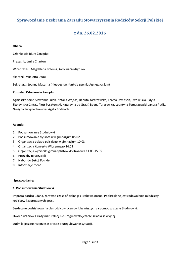 Sprawozdanie z zebrania Zarządu Stowarzyszenia Rodziców Sekcji Polskiej z dn. 26.02.2016 Obecni: Członkowie Biura Zarządu: Prezes: Ludmiła Charton Wiceprezesi: Magdalena Braems, Karolina Widzynska Skarbnik: Wioletta Daou Sekretarz : Joanna Materna (nieobecna), funkcje spelnia Agnieszka Saint Pozostali Członkowie Zarządu: Agnieszka Saint, Slawomir Sulek, Natalia Wojtas, Danuta Kostrzewska, Teresa Davidson, Ewa Jelska, Edyta Skorzynska-Cintas, Piotr Pyszkowski, Katarzyna de Graaf, Bogna Tarasewicz, Leontyna Tomaszewski, Janusz Petlic, Grażyna Swięciochowska, Agata Bodzioch Agenda: 1. 2. 3. 4. 5. 6. 7. 8. Podsumowanie Studniowki Podsumowanie dyskoteki w gimnazjum 05.02 Organizacja obiadu polskiego w gimnazjum 10.03 Organizacja Koncertu Wiosennego 24.03 Organizacja wycieczki gimnazjalistów do Krakowa 11.05-15.05 Potrzeby nauczycieli Nabor do Sekcji Polskiej Informacje rozne Sprawozdanie: 1. Podsumowanie Studniowki Impreza bardzo udana, zarowno czesc oficjalna jak i zabawa nocna. Podkreslone jest zadowolenie mlodziezy, rodzicow i zaproszonych gosci. Serdeczne podziekowania dla rodzicow uczniow klas nizszych za pomoc w czasie Studniowki. Dwoch uczniow z klasy maturalnej nie uregulowalo jeszcze skladki sekcyjnej. Ludmila jeszcze raz przesle prosbe o uregulowanie sytuacji. Page 1 sur 3 2. Podsumowanie dyskoteki w gimnazjum 05.02 Zabawa bardzo udana, gimnazjalisci zadowoleni; podziekowania dla rodzicow, ktorzy pomagali przy organizacji imprezy. 3. Organizacja obiadu polskiego w gimnazjum 10.03 Zaplanowany na czwartek 10 marca. Odpowiedzialni rodzice klas 6ème. Menu juz ustalone: • • • • zupa pomidorowa gulasz, pulpety w sosie pomidorowym, mizeria sernik, lody, soki owocowe niespodzianka - grzeski dla dzieci i nauczycieli 4. Organizacja Koncertu Wiosennego 24.03 Koncert muzyki fortepianowej, trzy utwory Chopina i jeden Paderewskiego. Zrobieniem programu zajmie sie Piotr Pyszkowski, drukowaniem, chetni rodzice; podzial do ustalenia w miare mozliwosci kazdego. Koncert zakonczy sie lampka szampana podana w amfiteatrze. Zaproponowani konferansjerzy: Matylda i Kajetan. Do zakupienia kubki, napoje bezalkoholowe oraz aperitify. Prosba o przygotowanie lekkiego poczestunku (koreczki, aperitify, ...). Ostateczne szczegoly do ustalenia na zebraniu przed koncertem (18 marca). 5. Organizacja wycieczki do Krakowa Bilety samolotowe zakupione, 34 uczestnikow, Program ustalony. Jako opiekunowie uczniom beda towarzyszyc : Pan Lipiec, Karolina Widzynska i Janusz Petlic. 6. Potrzeby nauczycieli Pani Tarkowska wystapila z prosba o pomoc w prowadzeniu prac administracyjnych. Rozwazana jest kwestia ewntualnego zaangazowania sekretarki. Na jakich warunkach? Jaki budzet? Sprawa do ponownego omowienia. Tymczasowo pomoc oferuje jedna mama. Page 2 sur 3 Lektury dla dzieci: zrobione zostana 2 listy Doodle, na ktore beda mogly wpisywac sie rodziny chetne oddac lub zakupic ksiazki dla Sekcji. Elektroniczna tablica dla gimnazjum- decyzja o zakupie z budzetu sekcji zatwierdzona. Ludmila zwroci sie z prosba o pomoc w dofinansowaniu do Klubu Miedzynarodowego. Komputer dla Pani Grazyny Swieciochowskiej moze byc ewentualnie zakupiony praz Ambasade RP. Ludmila wysyla do Ambasady RP wniosek z prosba o zakup komputera. Tymczasowo, propozycja przekazania komputera przez jednego z rodzicow. 7. Nabor do Sekcji Polskiej Nabor do Sekcji Polskiej na poziomie gimnazjum zaplanowany jest na czwartek 10 marca. Zebranie z rodzicami kandydatow bedzie mialo miejsce w tym samym czasie co testy dla dzieci. Testy dla kandydatow do sekcji polskiej na poziomie szkoly podstawowej maja sie odbyc 10 maja. Brakuje jeszcze dwoch chetnych. Na poziomie CP/CE1 sekcja moze przyjac maksymalnie 7 osob. Gdzie zamiescic ogloszenia o naborze do sekcji na poziomie szkoly podstawowej? Obecni na zebraniu proponuja : Kosciol Polski, sklep « Baltyk » w St Germain en Laye, zamieszczenie linkow na stronie internetowej « Poloniki », na facebooku Francja-Polska. Piotr doda profilowanie wyświetleń do naszego konta facebookowego/postu o rekrutacji (kobiety 25-35 lat, 15 km od Saint-Germain-en-Laye). Ludmila wysle informacje do wszystkich aktualnych rodzin z Sekcji z prosba o przekazywanie informacji o naborze do Sekcji na poziome szkoly podstawowej. 8.Informacje rozne Pomysl zakupienia maszyny do waty cukrowej - do rozwazenia przed Lycée en fête. Rodzice Sekcji Polskiej przy Liceum Montaigne, proponuja zwiedzenie sali merostwa VI dzielnicy , ewentualna sala na przyszla studniowke. Ambasada pozostaje najbardziej prestizowym miejscem dla polskich maturzystow. Następne spotkanie Zarządu odbędzie się w piatek 18 marca 2016r o godzinie 20.00. Prezes Sekretarz Ludmiła Charton Agnieszka Saint Page 3 sur 3