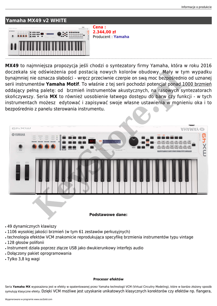 Informacje o produkcie Yamaha MX49 v2 WHITE Cena : 2.344,00 zł Producent : Yamaha K ey St or e. pl MX49 to najmniejsza propozycja jeśli chodzi o syntezatory firmy Yamaha, która w roku 2016 doczekała się odświeżenia pod postacią nowych kolorów obudowy. Mały w tym wypadku bynajmniej nie oznacza słabości - wręcz przeciwnie czerpie on swą moc bezpośrednio od uznanej serii instrumentów Yamaha Motif. To właśnie z tej serii pochodzi potencjał ponad 1000 brzmień oddający pełną paletę: od brzmień instrumentów akustycznych, na rasowych syntezatorach skończywszy. Seria MX to również uosobienie łatwego dostępu do barw czy funkcji - w tych instrumentach możesz edytować i zapisywać swoje własne ustawienia w mgnieniu oka i to bezpośrednio z panelu sterowania instrumentu. ● ● ● ● ● ● ● Podstawowe dane: 49 dynamicznych klawiszy 1106 wysokiej jakości brzmień (w tym 61 zestawów perkusyjnych) technologia efektów VCM znakomicie reprodukująca specyfikę brzmienia instrumentów typu vintage 128 głosów polifonii Instrument działa poprzez złącze USB jako dwukierunkowy interfejs audio Dołączony pakiet oprogramowania Tylko 3,8 kg wagi Procesor efektów Seria Yamaha MX wyposażona jest w efekty w opatentowanej przez Yamaha technologii VCM (Virtual Circuitry Modeling), które w bardzo złożony sposób symulują klasyczne efekty. Dzięki Wygenerowano w programie www.oscGold.com VCM możliwe jest uzyskanie unikatowych klasycznych korektorów czy efektów np. flangera, phasera i wielu innych. Łatwa edycja oraz tryb performance Seria Motif słynie z trybu pracy zwanego Performance który dla wielu jest źródłem inspiracji - również ten tryb został umieszczony w serii Yamaha MX. W łatwy sposób można łączyć dwa brzmienia używając przycisków Split (podział klawiatury na 2 części) oraz Layer (nakładanie na siebie brzmień znane też pod nazwą Dual). Dodatkowo każde brzmienie można zaprząc do pracy z wbudowanym arpeggiatorem oraz niezależną ścieżką perkusyjną, aby utworzyć własne, złożone brzmienie typu Performance , które zabrzmi niczym gra całego zespołu. Pokładowe 128 brzmień typu Performance są w pełni edytowalne przez użytkownika, natomiast domyślinie zostały osadzone przez firmę Yamaha w klimacie nowoczesnej muzyki klubowej. 16-partowy multitimbral i 128-głosowa polifonia Każde z brzmień typu Performance to nie tylko trzy opisane powyżej brzmienia, ale również wszystkie ustawienia dla kompletnego 16-częściowego podziału instrumentarium danego brzmienia Performance - z łatwością i płynnością poddasz indywidualnej ingerencji każdą pojedynczą składową. Dzięki 128 głosowej polifonii możesz zagrać wiele dźwięków naraz, nawet w najbardziej złożonych sekwencjach z Twojego oprogramowania DAW. Dzięki tym funkcjonalnościom MX jest świetnym i elastycznym elementem Twojego wyposażenia do gry na żywo. Dwukierunkowy interfejs USB Audio/MIDI or e. pl Yamaha MX49 to nie tylko kontrola nad aplikacjami DAW czy wtyczkami VST - to również wydajny interfejs audio. Wystarczy podłączyć go kablem USB do Twojego komputera, i już możesz usłyszeć wszystkie dźwięki z komputera na wyjściu słuchawkowym w MX. Możesz także odsłuchiwać własne ścieżki z twojego oprogramowania DAW, podłączając MX do zewnętrznych monitorów studyjnych lub sprzętu estradowego. Konwertery audio w MX zostały stworzone z myślą o profesjonalnych zastosowaniach, tak więc cały Twój materiał audio zabrzmi znacznie lepiej jeśli skorzystasz z Yamaha MX jako wyjścia audio. Interfejs MX działa w obu kierunkach, dlatego można nagrywać wewnętrzne brzmienia MX bezpośrednio na komputerze, bez konieczności korzystania z rozwiązań analogowych, dla możliwie jak najwyższej jakości. Zaawansowane opcje sterowania dla aplikacji VST oraz DAW Yamaha MX49 posiada na panelu sterowania solidne pokrętła oraz wytrzymałe przyciski do kontrolowania pokładowych brzmień, parametrów w twoim DAW oraz instrumentów VST. Niezwykle czytelny interfejs połączony jest ze zdalnym edytorem szablonów na Twoim komputerze, więc każdy z posiadanych przez Ciebie instrumentów VST, może być łatwo ustawiony i kontrolowany za pomocą MX. Znajdziemy tu także zaawansowane szablony integracyjne do użytku z różnego rodzaju programami DAW. Gdy używasz MX wraz z programem Cubase, jest tu nawet pokrętło AI, więc każdy parametr możesz kontrolować za pomocą dużego pokrętła poprzez najechanie myszką. Pełna kontrola nad Cubase nigdy nie była tak szybka. Załączony kompletny zestaw oprogramowania do produkcji muzycznej St Yamaha MX49 to jedyny sprzętowy syntezator w swoim przedziale cenowym, który dostarczany jest wraz kompletnym zestawem oprogramowania do produkcji muzycznej. Załączony Steinberg Cubase AI zawiera 48 ścieżek audio oraz 64 ścieżki MIDI, notację, wbudowane efekty VST, dzięki czemu możesz tworzyć kompletne produkcje, używając wyłącznie MX oraz AI. W komplecie znajduje się także Steinberg Prologue oraz emulator organów Yamaha YC-3B, a więc kilka niesamowicie brzmiących VST na początek.Ponadto, są tu edytory zdalnych szablonów dla ustawienia kontroli nad VST. Firma Yamaha nawiązała także współpracę z innymi firmami, aby zapewnić dostępność w pełni funkcjonalnych edytorów międzyplatformowych. ey Kompletny zestaw złącz analogowych i cyfrowych K Poza złaczem USB audio/MIDI, Yamaha MX49 posiada także złącze USB to Device, dzięki czemu możesz podłączyć pendrive celem magazynowania danych z MX na zewnętrznej pamięci, czy nawet dla odtwarzania plików wave bezpośrednio z pamięci USB. A jeżeli chcesz podłączyć do systemu tablet lub odtwarzacz MP3, podłącz go po prostu do wejścia AUX, za pomocą kabla mini jack stereo. Lekka konstrukcja oraz wysokiej jakości klawiatura Yamaha Podczas gdy prawie wszystkie konkurencyjne kontrolery klawiaturowe wyposażane są