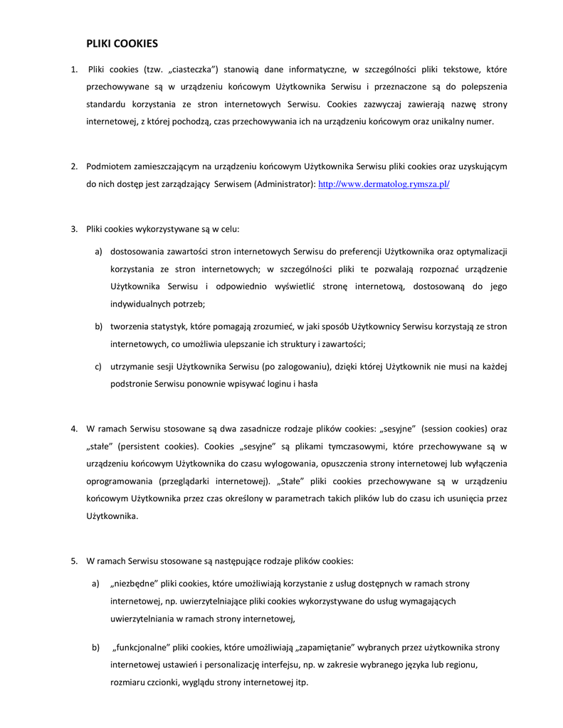 PLIKI COOKIES 1. Pliki cookies (tzw. „ciasteczka”) stanowią dane informatyczne, w szczególności pliki tekstowe, które przechowywane są w urządzeniu końcowym Użytkownika Serwisu i przeznaczone są do polepszenia standardu korzystania ze stron internetowych Serwisu. Cookies zazwyczaj zawierają nazwę strony internetowej, z której pochodzą, czas przechowywania ich na urządzeniu końcowym oraz unikalny numer. 2. Podmiotem zamieszczającym na urządzeniu końcowym Użytkownika Serwisu pliki cookies oraz uzyskującym do nich dostęp jest zarządzający Serwisem (Administrator): http://www.dermatolog.rymsza.pl/ 3. Pliki cookies wykorzystywane są w celu: a) dostosowania zawartości stron internetowych Serwisu do preferencji Użytkownika oraz optymalizacji korzystania ze stron internetowych; w szczególności pliki te pozwalają rozpoznać urządzenie Użytkownika Serwisu i odpowiednio wyświetlić stronę internetową, dostosowaną do jego indywidualnych potrzeb; b) tworzenia statystyk, które pomagają zrozumieć, w jaki sposób Użytkownicy Serwisu korzystają ze stron internetowych, co umożliwia ulepszanie ich struktury i zawartości; c) utrzymanie sesji Użytkownika Serwisu (po zalogowaniu), dzięki której Użytkownik nie musi na każdej podstronie Serwisu ponownie wpisywać loginu i hasła 4. W ramach Serwisu stosowane są dwa zasadnicze rodzaje plików cookies: „sesyjne” (session cookies) oraz „stałe” (persistent cookies). Cookies „sesyjne” są plikami tymczasowymi, które przechowywane są w urządzeniu końcowym Użytkownika do czasu wylogowania, opuszczenia strony internetowej lub wyłączenia oprogramowania (przeglądarki internetowej). „Stałe” pliki cookies przechowywane są w urządzeniu końcowym Użytkownika przez czas określony w parametrach takich plików lub do czasu ich usunięcia przez Użytkownika. 5. W ramach Serwisu stosowane są następujące rodzaje plików cookies: a) „niezbędne” pliki cookies, które umożliwiają korzystanie z usług dostępnych w ramach strony internetowej, np. uwierzytelniające pliki cookies wykorzystywane do usług wymagających uwierzytelniania w ramach strony internetowej, b) „funkcjonalne” pliki cookies, które umożliwiają „zapamiętanie” wybranych przez użytkownika strony internetowej ustawień i personalizację interfejsu, np. w zakresie wybranego języka lub regionu, rozmiaru czcionki, wyglądu strony internetowej itp. 6. Domyślne ustawienia oprogramowań służących do przeglądania stron internetowych (przeglądarek internetowych) dopuszczają najczęściej przechowywanie plików cookies w urządzeniu końcowym Użytkownika. Użytkownicy Serwisu mogą dokonać w każdym czasie zmiany ustawień swojej przeglądarki dotyczących plików cookies. Ustawienia te mogą zostać zmienione w szczególności w taki sposób, aby blokować automatyczną obsługę plików cookies w ustawieniach przeglądarki internetowej bądź informować o ich każdorazowym zamieszczeniu w urządzeniu Użytkownika Serwisu. 7. Poniżej Administrator opisuje, jak można zmienić ustawienia cookies w najpopularniejszych przeglądarkach internetowych: Internet Explorer: 1. Otwórz program Internet Explorer, klikając przycisk Start, a następnie klikając polecenie Internet Explorer. 2. Kliknij przycisk Narzędzia, a następnie kliknij polecenie Opcje internetowe. 3. Kliknij kartę Prywatność, a następnie w obszarze Ustawienia przesuń suwak do najwyższego położenia, aby zablokować wszystkie pliki cookies, lub do najniższego położenia, aby zezwolić na wszystkie pliki cookies, a następnie kliknij przycisk OK Chrome: 1. Kliknij menu Chrome na pasku narzędzi przeglądarki. 2. Wybierz Ustawienia. 3. Kliknij Pokaż ustawienia zaawansowane. 4. W sekcji „Prywatność” kliknij przycisk Ustawienia treści. 5. W sekcji „Pliki cookies” możesz zmienić ustawienia plików cookies Firefox: 1. Na górze okna Firefoksa naciśnij przycisk Firefox, (w systemie Windows XP kliknij menu Narzędzia) i wybierz Opcje. 2. Wybierz panel Prywatność. 3. Z menu rozwijanego elementu Program Firefox: wybierz opcję: będzie używał ustawień historii użytkownika. 4. Zaznacz Akceptuj ciasteczka, by włączyć, odznacz, by wyłączyć obsługę ciasteczek Opera: 1. Przejdź do zakładki Narzędzia w górnym menu Opery i z rozwijanego menu wybierz Preferencje. 2. W okienku, które się pojawi przejdź do zakładki Zaawansowane, z menu po lewej stronie wybierz Ciasteczka i zmień ustawienia plików cookies 8. Administrator informuje, że w razie problemów ze zmianą ustawień plików cookies, najlepiej skorzystać z informacji znajdujących się na stronie internetowej producenta danego programu. 9. Jakiekolwiek pytania dotyczące powyższej polityki prywatności prosimy kierować na adres: [email protected]