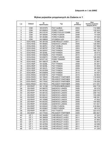 Załącznik nr 1 do SIWZ Wykaz pojazdów przypisanych do Zadania nr 1 L.p. Oddział Nr rejestracyjny Typ Rok produkcji 1 2 3 4 5 6 7 8 9 10 11 12 13 14 15 16 17 18 19 20 21 22 23 24 25 26 27 28 29 30 31 32 33 34 35 36 37 38 39 40 41 42 43 44 45 46 CSK CSK CSK CSK CSK CSK OOG-RAS OOG-RAS OOG-RAS OOG-RAS OOG-RAS OOG-RAS OOG-RAS OOG-RAS OOG-RAS OOG-RAS OOG-RDP OOG-RDP OOG-RDP OOG-RDP OOG-RDP OOG-RWD OOG-RWD OOG-RWD OOG-RWD OOG-RWD OS-RWP OS-RWP OS-RWP OS-RWP OS-RWP OS-RWP OS-RWP OS-RWP OS-RWP OS-RWP OS-RWP OS-RWP OS-RWP OT 1 OT 1 OT 1 OT 1 OT 1 OT 1 OT 1 WI 81975 WI 8065G WI 0151K WI 0650K WI 0648K WI 5985S WI 4810S WI 9808C WI 88761 WI 88767 WI 82437 WI 9246L WI 6582N WI 6507C WI 6713C WY 6857F WI 9248L WI 9249L WI 9247L WI 6576N WI 6580N WI 6581N WI 7652C WI 7681C WI 7763C WI 7781C WI 1410E WI 9827C WI 9818C WI 9812C WI 8041C WI 8034C WI 3056E WI 8033C WI 8028C WI 6504C WI 6506C WI 88771 WI 7753C WI 3849S WI 3850S WI 3943S WI 4251S WI 4276S WI 4279S WI 4280S FIAT ALBEA FORD C-MAX FORD FOCUS COMBI FORD FUSION FORD FUSION HYUNDAI ix35 CHEVROLET AVEO DAEWOO LANOS FIAT DOBLO FIAT DOBLO FIAT PANDA FIAT PANDA FIAT PANDA FORD FUSION FORD TRANSIT LUBLIN FIAT PANDA FIAT PANDA FIAT PANDA FIAT PANDA FIAT PANDA FIAT PANDA PEUGEOT PARTNER PEUGEOT PARTNER PEUGEOT PARTNER PEUGEOT PARTNER CITROEN BERLINGO DAEWOO LANOS DAEWOO LANOS DAEWOO LANOS DAEWOO LANOS DAEWOO LANOS DAEWOO LANOS DAEWOO LANOS DAEWOO LANOS FORD FUSION FORD FUSION FIAT PUNTO PEUGEOT PARTNER CHEVROLET AVEO CHEVROLET AVEO CHEVROLET AVEO CHEVROLET AVEO CHEVROLET AVEO CHEVROLET AVEO CHEVROLET AVEO 2003 2007 2008 2008 2008 2011 2011 2005 2003 2003 2003 2009 2010 2005 2005 1998 2009 2009 2009 2010 2010 2010 2005 2005 2005 2005 2005 2005 2005 2005 2005 2005 2005 2005 2005 2005 2005 2003 2005 2011 2011 2011 2011 2011 2011 2011 Stan licznika na koniec sierpnia 2014 r. 112 888 132 622 97 336 73 428 57 020 51 371 10 686 126 840 137 898 148 129 162 720 50 614 23 419 129 505 66 227 57 861 64 261 51 808 59 939 61 124 44 007 62 804 110 849 114 161 176 026 217 351 202 718 60 079 226 070 209 152 103 298 198 391 47 832 140 993 101 641 216 694 99 018 323 472 283 807 37 323 54 734 47 963 50 810 42 006 60 921 41 230 47 48 49 50 51 52 53 54 55 56 57 58 59 60 61 62 63 64 65 66 67 68 69 70 71 72 73 74 75 76 77 78 79 80 81 82 83 84 85 86 87 88 89 90 91 92 93 94 95 96 97 98 99 100 OT 1 OT 1 OT 1 OT 1 OT 1 OT 1 OT 1 OT 1 OT 1 OT 1 OT 1 OT 1 OT 1 OT 1 OT 1 OT 1 OT 1 OT 1 OT 1 OT 2 OT 2 OT 2 OT 2 OT 2 OT 2 OT 2 OT 2 OT 2 OT 2 OT 2 OT 2 OT 2 OT 2 OT 2 OT 2 OT 2 OT 2 OT 2 OT 2 OT 2 OT 2 OT 2 OT 2 OT 2 OT 2 OT 3 OT 3 OT 3 OT 3 OT 3 OT 3 OT 3 OT 3 OT 3 WI 4432S WI 85804 WI 83364 WI 9805C WI 1864E WI 83404 WI 7089N WI 4462S WI 4461S WI 4262K WI 4445K WI 4438K WI 83419 WI 8283C WI 84643 WI 6535C WI 4915A WI 4914A WI 6615C WI 4612S WI 4652S WI 4611S WI 4542S WI 4540S WI 4525S WI 4281S WI 5483A WI 1872E WI 1867E WI 3051E WI 1871E WI 88765 WI 6577N WI 3527S WI 6505C WI 4260K WI 4261K WI 4417K WI 4419K WI 84648 WI 1883E WI 3895K WI 6616C WI 3893F WI 6813C WI 4808S WI 4811S WI 4813S WI 4490S WI 4427S WI 82965 WI 83361 WI 85852 WI 88758 CHEVROLET AVEO DAEWOO LANOS DAEWOO LANOS DAEWOO LANOS DAEWOO LANOS DAEWOO LANOS FIAT PANDA FORD CONNECT FORD CONNECT FORD FUSION FORD FUSION FORD FUSION FORD TRANSIT FORD TRANSIT FORD TRANSIT FORD TRANSIT PEUGEOT PARTNER PEUGEOT PARTNER PEUGEOT PARTNER CHEVROLET AVEO CHEVROLET AVEO CHEVROLET AVEO CHEVROLET AVEO CHEVROLET AVEO CHEVROLET AVEO CHEVROLET AVEO DAEWOO LANOS DAEWOO LANOS DAEWOO LANOS DAEWOO LANOS DAEWOO LANOS FIAT DOBLO FIAT PANDA FORD CONNECT FORD FUSION FORD FUSION FORD FUSION FORD FUSION FORD FUSION FORD TRANSIT FORD TRANSIT FORD TRANSIT PEUGEOT PARTNER PEUGEOT PARTNER PEUGEOT PARTNER CHEVROLET AVEO CHEVROLET AVEO CHEVROLET AVEO CHEVROLET AVEO CHEVROLET AVEO DAEWOO LANOS DAEWOO LANOS DAEWOO LANOS FIAT DOBLO 2011 2003 2003 2005 2005 2003 2010 2011 2011 2008 2008 2008 2003 2003 2003 2005 2004 2004 2005 2011 2011 2011 2011 2011 2011 2011 2004 2005 2005 2005 2005 2003 2010 2011 2005 2008 2008 2008 2008 2003 2003 2008 2005 2005 2005 2011 2011 2011 2011 2011 2003 2003 2003 2003 35 754 333 550 214 605 94 350 119 578 340 671 46 081 103 073 104 503 112 887 143 305 133 892 140 557 395 323 425 538 299 202 242 122 203 228 168 611 54 939 103 852 68 992 63 639 70 267 82 600 76 915 238 324 233 949 259 056 182 017 79 562 168 134 108 705 126 488 149 532 204 455 190 549 184 310 175 853 120 710 374 804 247 027 234 341 250 007 228 947 65 016 71 309 65 255 82 537 69 596 229 325 281 399 237 128 154 300 101 102 103 104 105 106 107 108 109 110 111 112 113 114 115 116 117 118 119 120 121 122 123 124 125 126 127 128 129 130 131 132 133 134 135 136 137 138 139 140 141 142 143 144 145 146 147 148 149 150 151 OT 3 OT 3 OT 3 OT 3 OT 3 OT 3 OT 3 OT 3 OT 3 OT 3 OT 4 OT 4 OT 4 OT 4 OT 4 OT 4 OT 4 OT 4 OT 4 OT 4 OT 4 OT 4 OT 4 OT 4 OT 4 OT 4 OT 4 OT 4 OT 4 OT 4 OT 4 OT 4 OT 5 OT 5 OT 5 OT 5 OT 5 OT 5 OT 5 OT 5 OT 5 OT 5 OT 5 OT 5 OT 5 OT 5 OT 5 OT 5 OT 5 OT 5 OT 5 WI 88763 WI 6578N WI 3526S WI 6508C WI 4437K WI 4418K WI 84638 WI 3892K WI 4913A WI 7756C WI 4812S WI 4809S WI 4806S WI 4388S WI 4387S WI 4807S WI 84401 WI 84931 WI 3057E WI 9813C WI 1866E WI 88766 WI 6579N WI 3594S WI 4439K WI 4187K WI 4440K WI 83414 WI 83415 WY 6555F WI 7757C WI 7653C WI 3848S WI 3942S WI 3944S WI 4610S WI 3945S WI 4632S WI 85871 WI 9817C WI 1875E WI 1870E WI 1862E WI 3974S WI 4189K WI 4188K WI 4190K WI 4922C WI 3894K WI 7680C WI 7754C FIAT DOBLO FIAT PANDA FORD CONNECT FORD FUSION FORD FUSION FORD FUSION FORD TRANSIT FORD TRANSIT PEUGEOT PARTNER PEUGEOT PARTNER CHEVROLET AVEO CHEVROLET AVEO CHEVROLET AVEO CHEVROLET AVEO CHEVROLET AVEO CHEVROLET AVEO DAEWOO LANOS DAEWOO LANOS DAEWOO LANOS DAEWOO LANOS DAEWOO LANOS FIAT DOBLO FIAT PANDA FORD CONNECT FORD FUSION FORD FUSION FORD FUSION FORD TRANSIT FORD TRANSIT FORD TRANSIT PEUGEOT PARTNER PEUGEOT PARTNER CHEVROLET AVEO CHEVROLET AVEO CHEVROLET AVEO CHEVROLET AVEO CHEVROLET AVEO CHEVROLET AVEO DAEWOO LANOS DAEWOO LANOS DAEWOO LANOS DAEWOO 