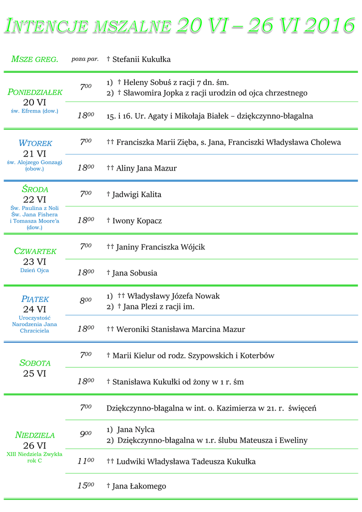 MSZE GREG. PONIEDZIAŁEK 20 VI poza par. 700 św. Efrema (dow.) 1800 WTOREK 21 VI 700 † Stefanii Kukułka 1) † Heleny Sobuś z racji 7 dn. śm. 2) † Sławomira Jopka z racji urodzin od ojca chrzestnego 15. i 16. Ur. Agaty i Mikołaja Białek – dziękczynno-błagalna †† Franciszka Marii Zięba, s. Jana, Franciszki Władysława Cholewa św. Alojzego Gonzagi (obow.) 1800 ŚRODA 22 VI 700 † Jadwigi Kalita Św. Paulina z Noli Św. Jana Fishera i Tomasza Moore’a (dow.) 1800 † Iwony Kopacz CZWARTEK 23 VI 700 Dzień Ojca 1800 PIĄTEK 24 VI 800 Uroczystość Narodzenia Jana Chrzciciela SOBOTA 25 VI NIEDZIELA 26 VI XIII Niedziela Zwykła rok C 1800 700 1800 †† Aliny Jana Mazur †† Janiny Franciszka Wójcik † Jana Sobusia 1) †† Władysławy Józefa Nowak 2) † Jana Plezi z racji im. †† Weroniki Stanisława Marcina Mazur † Marii Kielur od rodz. Szypowskich i Koterbów † Stanisława Kukułki od żony w 1 r. śm 700 Dziękczynno-błagalna w int. o. Kazimierza w 21. r. święceń 900 1) Jana Nylca 2) Dziękczynno-błagalna w 1.r. ślubu Mateusza i Eweliny 1100 †† Ludwiki Władysława Tadeusza Kukułka 1500 † Jana Łakomego