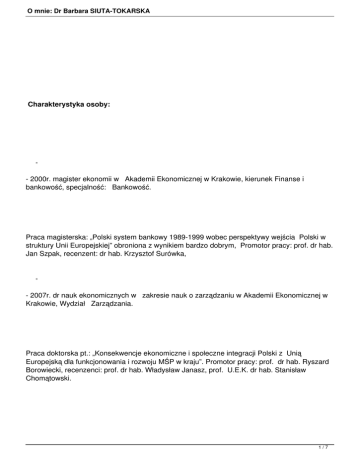 O mnie: Dr Barbara SIUTA-TOKARSKA Charakterystyka osoby: - 2000r. magister ekonomii w Akademii Ekonomicznej w Krakowie, kierunek Finanse i bankowość, specjalność: Bankowość. Praca magisterska: „Polski system bankowy 1989-1999 wobec perspektywy wejścia Polski w struktury Unii Europejskiej” obroniona z wynikiem bardzo dobrym, Promotor pracy: prof. dr hab. Jan Szpak, recenzent: dr hab. Krzysztof Surówka, - 2007r. dr nauk ekonomicznych w zakresie nauk o zarządzaniu w Akademii Ekonomicznej w Krakowie, Wydział Zarządzania. Praca doktorska pt.: „Konsekwencje ekonomiczne i społeczne integracji Polski z Unią Europejską dla funkcjonowania i rozwoju MŚP w kraju”. Promotor pracy: prof. dr hab. Ryszard Borowiecki, recenzenci: prof. dr hab. Władysław Janasz, prof. U.E.K. dr hab. Stanisław Chomątowski. 1/7 O mnie: Dr Barbara SIUTA-TOKARSKA Zainteresowania naukowe: - funkcjonowanie i rozwój małych i średnich przedsiębiorstw, - przedsiębiorczość – ujęcie teoretyczne i praktyczne, - bezpośrednie inwestycje zagraniczne, - zarządzanie finansami przedsiębiorstw, - analiza i diagnostyka ekonomiczna przedsiębiorstw, - finanse przedsiębiorstw, - programowanie rozwoju przedsiębiorstw, - 2/7 O mnie: Dr Barbara SIUTA-TOKARSKA - ekonomika i zarządzanie przedsiębiorstwem. Wykłady i ćwiczenia na studiach dziennych, zaocznych i wieczorowych I i II-ego stopnia - małe i średnie przedsiębiorstwa w gospodarce, - analiza i diagnostyka ekonomiczna przedsiębiorstw, - zarządzanie finansami przedsiębiorstw, - finanse przedsiębiorstw, - ekonomika i zarządzanie przedsiębiorstwem, - programowanie rozwoju przedsiębiorstw. 3/7 O mnie: Dr Barbara SIUTA-TOKARSKA Tematyka seminariów - MŚP w Polsce i na świecie, - przedsiębiorczość a funkcjonowanie przedsiębiorstw, - Bezpośrednie Inwestycje Zagraniczne, - ocena kondycji finansowej przedsiębiorstw, - analiza sytuacji przedsiębiorstwa, - Handel zagraniczny, - Procesy globalizacji i internacjonalizacji przedsiębiorstw, 4/7 O mnie: Dr Barbara SIUTA-TOKARSKA - inne, wg indywidualnych ustaleń. Inni o mnie: Nauka Polska – Ludzie Nauki Osiągnięcia Nagrody i wyróżnienia: - 5/7 O mnie: Dr Barbara SIUTA-TOKARSKA - 1997-2000 stypendium naukowe bardzo dobre wyniki w nauce, (studenckie) Akademii Ekonomicznej w Krakowie za - październik 2004r. - Nagroda Rektora Akademii Ekonomicznej w Krakowie - Indywidualna II stopnia za osiągnięcia w dziedzinie naukowej, - 2005-2006 stypendium naukowe – doktorskie Akademii Ekonomicznej w Krakowie, - grudzień 2007r. – Nagroda Rektora Uniwersytetu Ekonomicznego w Krakowie za osiągnięcia w pracy zawodowej, - sierpień 2008r.- Nagroda Rektora Uniwersytetu Ekonomicznego w Krakowie - indywidualna II-ego stopnia za osiągnięcia w dziedzinie naukowej, - sierpień 2008r. - Nagroda Rektora Uniwersytetu Ekonomicznego w Krakowie - zespołowa I stopnia za osiągnięcia w dziedzinie naukowej, - październik 2009r. – Nagroda Rektora Uniwersytetu Ekonomicznego w Krakowie indywidualna II stopnia za osiągnięcia w dziedzinie naukowej, - październik 2009r. – Nagroda Rektora Uniwersytetu Ekonomicznego w Krakowie zespołowa pierwszego stopnia za osiągnięcia w dziedzinie naukowej 6/7 O mnie: Dr Barbara SIUTA-TOKARSKA Wykłady gościnnie: - 11-14.III.2007r. Uniwersytet Ekonomiczny w Sankt Petersburgu nt.: ”SMEs in the contemporary Word”, - 16-20.VII.2007r. udział w I Letniej Szkole w Mesynie zorganizowanej przez Uniwersytet w Mesynie wraz z Uniwersytetem Sorbona w Paryżu nt: „Droit sociall Droits sociaux et Mondialisation” wraz z wykładem nt.: „Processus de la globalisation et les possibilités de fonctionnement et de développement des PME basés sur l’exemple de pays de l’Union Européenne’’, - 12.IX.2007 wykład dla studentów z Grenoble w Uniwersytecie Ekonomicznym w Krakowie na temat: „Entrepreneurship and SMEs in Poland”. 7/7