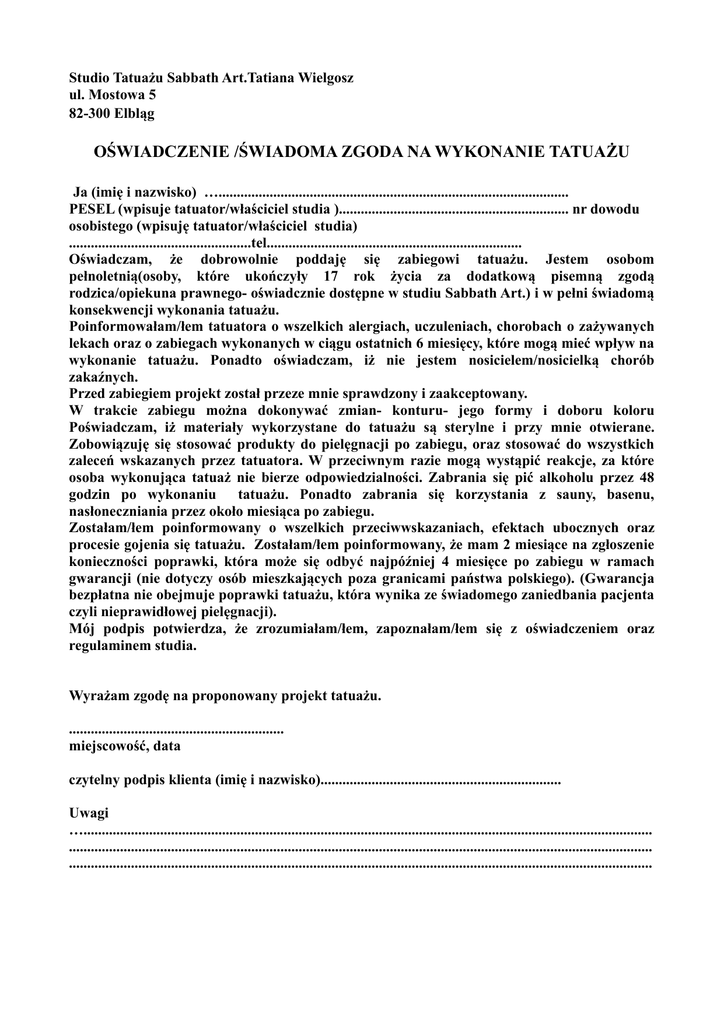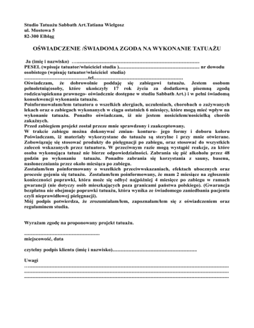 Studio Tatuażu Sabbath Art.Tatiana Wielgosz ul. Mostowa 5 82-300 Elbląg OŚWIADCZENIE /ŚWIADOMA ZGODA NA WYKONANIE TATUAŻU Ja (imię i nazwisko) …................................................................................................ PESEL (wpisuje tatuator/właściciel studia )............................................................... nr dowodu osobistego (wpisuję tatuator/właściciel studia) ..................................................tel...................................................................... Oświadczam, że dobrowolnie poddaję się zabiegowi tatuażu. Jestem osobom pełnoletnią(osoby, które ukończyły 17 rok życia za dodatkową pisemną zgodą rodzica/opiekuna prawnego- oświadcznie dostępne w studiu Sabbath Art.) i w pełni świadomą konsekwencji wykonania tatuażu. Poinformowałam/łem tatuatora o wszelkich alergiach, uczuleniach, chorobach o zażywanych lekach oraz o zabiegach wykonanych w ciągu ostatnich 6 miesięcy, które mogą mieć wpływ na wykonanie tatuażu. Ponadto oświadczam, iż nie jestem nosicielem/nosicielką chorób zakaźnych. Przed zabiegiem projekt został przeze mnie sprawdzony i zaakceptowany. W trakcie zabiegu można dokonywać zmian- konturu- jego formy i doboru koloru Poświadczam, iż materiały wykorzystane do tatuażu są sterylne i przy mnie otwierane. Zobowiązuję się stosować produkty do pielęgnacji po zabiegu, oraz stosować do wszystkich zaleceń wskazanych przez tatuatora. W przeciwnym razie mogą wystąpić reakcje, za które osoba wykonująca tatuaż nie bierze odpowiedzialności. Zabrania się pić alkoholu przez 48 godzin po wykonaniu tatuażu. Ponadto zabrania się korzystania z sauny, basenu, nasłoneczniania przez około miesiąca po zabiegu. Zostałam/łem poinformowany o wszelkich przeciwwskazaniach, efektach ubocznych oraz procesie gojenia się tatuażu. Zostałam/łem poinformowany, że mam 2 miesiące na zgłoszenie konieczności poprawki, która może się odbyć najpóźniej 4 miesięce po zabiegu w ramach gwarancji (nie dotyczy osób mieszkających poza granicami państwa polskiego). (Gwarancja bezpłatna nie obejmuje poprawki tatuażu, która wynika ze świadomego zaniedbania pacjenta czyli nieprawidłowej pielęgnacji). Mój podpis potwierdza, że zrozumiałam/łem, zapoznałam/łem się z oświadczeniem oraz regulaminem studia. Wyrażam zgodę na proponowany projekt tatuażu. ........................................................... miejscowość, data czytelny podpis klienta (imię i nazwisko).................................................................. Uwagi …............................................................................................................................................................ ................................................................................................................................................................ ................................................................................................................................................................