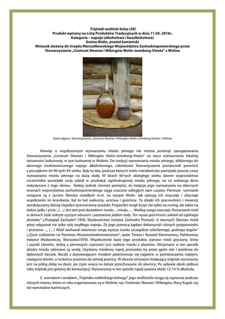 Trójniak woliński leśny (38) Produkt wpisany na Listę Produktów Tradycyjnych w dniu 11.05. 2016r. Kategoria – napoje (alkoholowe i bezalkoholowe) Gmina Wolin, powiat kamieński Wniosek złożony do Urzędu Marszałkowskiego Województwa Zachodniopomorskiego przez Stowarzyszenie „Centrum Słowian i Wikingów Wolin-Jomsborg-Vineta” z Wolina Autor zdjęcia : Stowarzyszenie „Centrum Słowian i Wikingów Wolin-Jomsborg-Vineta” z Wolina Mówiąc o współczesnym wytwarzaniu miodu pitnego nie można pominąć zaangażowania Stowarzyszenia „Centrum Słowian i Wikingów Wolin-Jomsborg-Vineta” na rzecz wzmacniania lokalnej tożsamości kulturowej, w tym kulinarnej w Wolinie. Do tradycji wytwarzania miodu pitnego, zbliżonego do dawnego średniowiecznego napoju alkoholowego, członkowie Stowarzyszenia postanowili powrócić z początkiem lat 90-tych XX wieku. Były to lata, podczas których wielu mieszkańców pamiętało jeszcze czasy wytwarzania miodu pitnego na dużą skalę. W latach 60-tych ubiegłego wieku dawne województwo szczecińskie posiadało swój udział w produkcji ogólnokrajowej miodu pitnego, na co wskazują dane statystyczne z tego okresu. Należy jednak również pamiętać, że tradycja jego wytwarzania na obecnych terenach województwa zachodniopomorskiego sięga znacznie odległych nam czasów. Pierwsze wzmianki związane są z życiem Słowian osiadłych m.in. na wyspie Wolin. Jak opisują ich zwyczaje i obyczaje współcześni im kronikarze, był to lud waleczny, uczciwy i gościnny. To dzięki ich pracowitości i inwencji zawdzięczamy dzisiaj niejeden żywnościowy produkt. Przyjezdni mogli liczyć nie tylko na nocleg, ale także na dobre jadło i picie: „(…) Jest tam pod dostatkiem masła,…miodu,…. Według swego zwyczaju Pomorzanie mieli w domach stale nakryte czystym obrusem i zastawione jadłem stoły. Ten wyraz gościnności zależał od ogólnego dostatku” („Przegląd Zachodni”,1950, Wydawnictwo Instytut Zachodni Poznań). U dawnych Słowian miód pitny odgrywał nie tylko rolę zwykłego napoju. Za jego pomocą kapłani dokonywali różnych przepowiedni i proroctw : „ (…) Miód zachował natomiast rangę wyższą trunku szczególnie szlachetnego, godnego bogów” („Życie codzienne na Pomorzu Wczesnośredniowiecznym”, autor Teresa i Ryszard Kiersnowscy, Państwowy Instytut Wydawniczy, Warszawa1970). Współcześnie bazę tego produktu stanowi miód gryczany, leśny i szyszki chmielu. Jedną z pierwszych czynności jest wybicie miodu z plastrów. Otrzymane w ten sposób plastry miodu zalewane są wodą. Uzyskany miodowy napój przecedza się przez gęste sito i przelewa do dębowych beczek. Beczki z dojrzewającym miodem przechowuje się najpierw w pomieszczeniu ciepłym, następnie letnim, a na końcu przenosi do zimnej piwnicy. W okresie zimowym leżakujący trójniak wynoszony jest na jedną dobę na dwór, po czym wraca na dalsze przechowanie do piwnicy. Po upływie około półtora roku trójniak jest gotowy do konsumpcji. Wytworzony w ten sposób napój zawiera około 12-14 % alkoholu. Z aromatem i smakiem „Trójniaka wolińskiego leśnego” jego wielbiciele mogą się zapoznać podczas różnych imprez, które co roku organizowane są w Wolinie, np.: Festiwalu Słowian i Wikingów, Nocy Kupał, czy też warsztatów bartniczych.