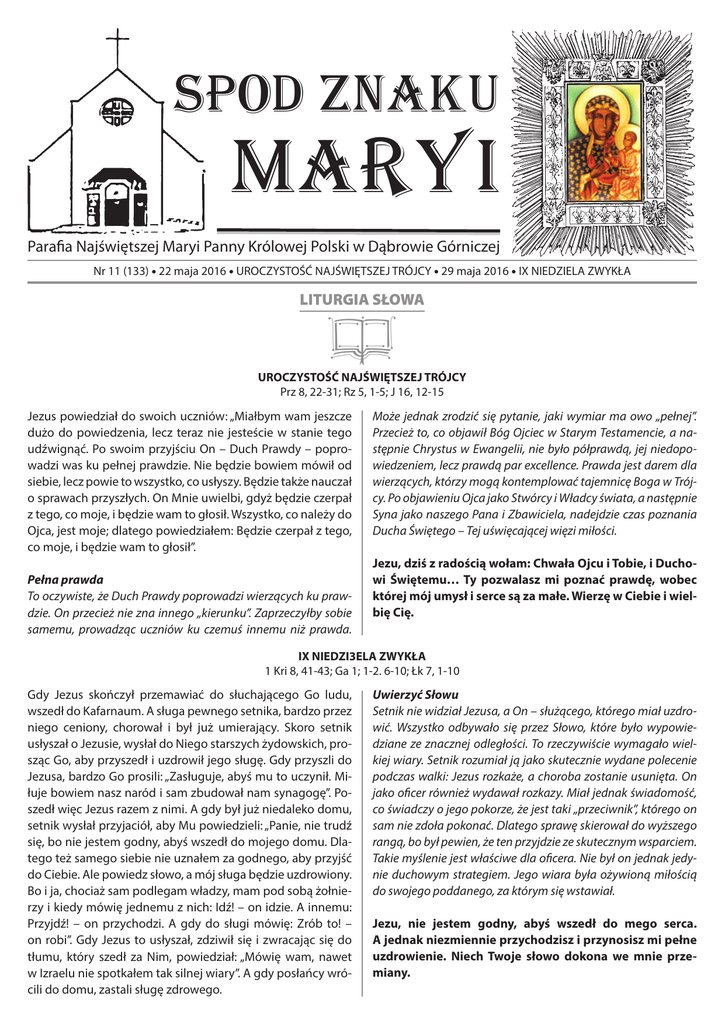 SPOD ZNAKU MARYI Parafia Najświętszej Maryi Panny Królowej Polski w Dąbrowie Górniczej Nr 11 (133) • 22 maja 2016 • UROCZYSTOŚĆ NAJŚWIĘTSZEJ TRÓJCY • 29 maja 2016 • IX NIEDZIELA ZWYKŁA LITURGIA SŁOWA | UROCZYSTOŚĆ NAJŚWIĘTSZEJ TRÓJCY Prz 8, 22-31; Rz 5, 1-5; J 16, 12-15 Jezus powiedział do swoich uczniów: „Miałbym wam jeszcze dużo do powiedzenia, lecz teraz nie jesteście w stanie tego udźwignąć. Po swoim przyjściu On – Duch Prawdy – poprowadzi was ku pełnej prawdzie. Nie będzie bowiem mówił od siebie, lecz powie to wszystko, co usłyszy. Będzie także nauczał o sprawach przyszłych. On Mnie uwielbi, gdyż będzie czerpał z tego, co moje, i będzie wam to głosił. Wszystko, co należy do Ojca, jest moje; dlatego powiedziałem: Będzie czerpał z tego, co moje, i będzie wam to głosił”. Pełna prawda To oczywiste, że Duch Prawdy poprowadzi wierzących ku prawdzie. On przecież nie zna innego „kierunku”. Zaprzeczyłby sobie samemu, prowadząc uczniów ku czemuś innemu niż prawda. Może jednak zrodzić się pytanie, jaki wymiar ma owo „pełnej”. Przecież to, co objawił Bóg Ojciec w Starym Testamencie, a następnie Chrystus w Ewangelii, nie było półprawdą, jej niedopowiedzeniem, lecz prawdą par excellence. Prawda jest darem dla wierzących, którzy mogą kontemplować tajemnicę Boga w Trójcy. Po objawieniu Ojca jako Stwórcy i Władcy świata, a następnie Syna jako naszego Pana i Zbawiciela, nadejdzie czas poznania Ducha Świętego – Tej uświęcającej więzi miłości. Jezu, dziś z radością wołam: Chwała Ojcu i Tobie, i Duchowi Świętemu… Ty pozwalasz mi poznać prawdę, wobec której mój umysł i serce są za małe. Wierzę w Ciebie i wielbię Cię. IX NIEDZI3ELA ZWYKŁA 1 Kri 8, 41-43; Ga 1; 1-2. 6-10; Łk 7, 1-10 Gdy Jezus skończył przemawiać do słuchającego Go ludu, wszedł do Kafarnaum. A sługa pewnego setnika, bardzo przez niego ceniony, chorował i był już umierający. Skoro setnik usłyszał o Jezusie, wysłał do Niego starszych żydowskich, prosząc Go, aby przyszedł i uzdrowił jego sługę. Gdy przyszli do Jezusa, bardzo Go prosili: „Zasługuje, abyś mu to uczynił. Miłuje bowiem nasz naród i sam zbudował nam synagogę”. Poszedł więc Jezus razem z nimi. A gdy był już niedaleko domu, setnik wysłał przyjaciół, aby Mu powiedzieli: „Panie, nie trudź się, bo nie jestem godny, abyś wszedł do mojego domu. Dlatego też samego siebie nie uznałem za godnego, aby przyjść do Ciebie. Ale powiedz słowo, a mój sługa będzie uzdrowiony. Bo i ja, chociaż sam podlegam władzy, mam pod sobą żołnierzy i kiedy mówię jednemu z nich: Idź! – on idzie. A innemu: Przyjdź! – on przychodzi. A gdy do sługi mówię: Zrób to! – on robi”. Gdy Jezus to usłyszał, zdziwił się i zwracając się do tłumu, który szedł za Nim, powiedział: „Mówię wam, nawet w Izraelu nie spotkałem tak silnej wiary”. A gdy posłańcy wrócili do domu, zastali sługę zdrowego. Uwierzyć Słowu Setnik nie widział Jezusa, a On – służącego, którego miał uzdrowić. Wszystko odbywało się przez Słowo, które było wypowiedziane ze znacznej odległości. To rzeczywiście wymagało wielkiej wiary. Setnik rozumiał ją jako skutecznie wydane polecenie podczas walki: Jezus rozkaże, a choroba zostanie usunięta. On jako oficer również wydawał rozkazy. Miał jednak świadomość, co świadczy o jego pokorze, że jest taki „przeciwnik”, którego on sam nie zdoła pokonać. Dlatego sprawę skierował do wyższego rangą, bo był pewien, że ten przyjdzie ze skutecznym wsparciem. Takie myślenie jest właściwe dla oficera. Nie był on jednak jedynie duchowym strategiem. Jego wiara była ożywioną miłością do swojego poddanego, za którym się wstawiał. Jezu, nie jestem godny, abyś wszedł do mego serca. A jednak niezmiennie przychodzisz i przynosisz mi pełne uzdrowienie. Niech Twoje słowo dokona we mnie przemiany. ZAPROSZENIE DO KOŚCIOŁA STACYJNEGO SANKTUARIUM MATKI BOŻEJ ANIELSKIEJ W DĄBROWIE GÓRNICZEJ W NADZWYCZAJNYM ROKU ŚWIĘTYM JUBILEUSZU MIŁOSIERDZIA Papież Franciszek pisze: „Pielgrzymka jest znakiem szczególnym w Roku Świętym, ponieważ stanowi ikonę drogi, którą każda osoba przemierza w czasie swojej egzystencji. Życie jest pielgrzymką, a istota ludzka to viator, pielgrzym, który idzie dro- gą aż do pożądanego celu […]. Pielgrzymka ma być bodźcem do nawrócenia: przekraczając Drzwi Święte pozwolimy się objąć miłosierdziu Bożemu i zaangażujemy się, byśmy byli miłosierni dla innych, tak jak Ojciec jest miłosierny dla nas”. Odpowiadając na inicjatywę papieża Franciszka, w sobotę 28 maja, pielgrzymka parafialna do Sanktuarium Matki Bożej Anielskiej w Dąbrowie Górniczej. PROGRAM PIELGRZYMKI GODZ. 9.00: WYJŚCIE Z PARAFII NAJŚWIĘTSZEJ MARII PANNY KRÓLOWEJ POLSKI GODZ. 10.00: SPOTKANIE PIELGRZYMÓW PRZED BAZYLIKĄ MATKI BOŻEJ ANIELSKIEJ, PRZEJŚCIE PRZEZ DRZWI ŚWIĘTE BRAMY MIŁOSIERDZIA, UDZIAŁ W NABOŻEŃSTWIE JUBILEUSZOWYM I MSZA ŚWIĘTA PRZED ŚWIATOWYMI DNIAMI MŁODZIEŻY (11) Diecezja sosnowiecka to 162 wspólnoty parafialne rozsiane na terenie 25 gmin. Coraz bardziej widać mobilizację przed Światowymi Dniami Młodzieży. Aktywnie w przygotowania włączają się parafie, ale także samorządowcy. Te pierwsze chcą zrobić wszystko, by Tydzień w Diecezji był wielkim wydarzeniem duchowym, ci drudzy, by stał się doskonałą okazją do promocji regionu. Młodzież, która do nas przyjedzie, reprezentować będzie praktycznie wszystkie zakątki globu. Dla nich, a także dla gospodarzy przygotowywane są materiały promocyjne i informacyjne. Od wielu tygodni działa też strona internetowa www.smds.pl. Młodzież, która do nas przyjedzie, będzie chciała spędzić ten czas na modlitwie, ale też na różnego rodzaju aktywnościach. Będzie festiwal talentów z prezentacją na Placu Papieskim w Sosnowcu, 