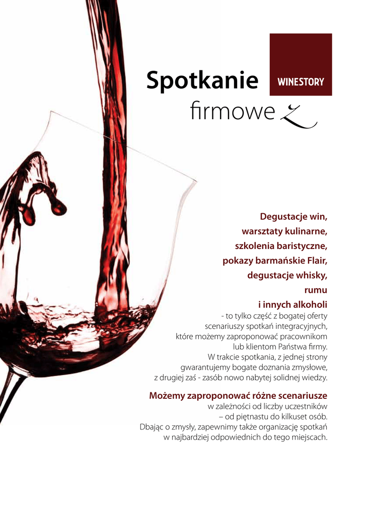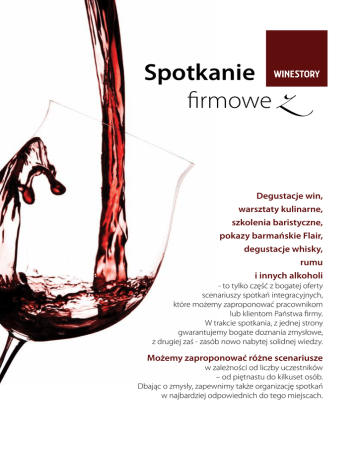 Spotkanie firmowe z Degustacje win, warsztaty kulinarne, szkolenia baristyczne, pokazy barmańskie Flair, degustacje whisky, rumu i innych alkoholi - to tylko część z bogatej oferty scenariuszy spotkań integracyjnych, które możemy zaproponować pracownikom lub klientom Państwa firmy. W trakcie spotkania, z jednej strony gwarantujemy bogate doznania zmysłowe, z drugiej zaś - zasób nowo nabytej solidnej wiedzy. Możemy zaproponować różne scenariusze w zależności od liczby uczestników – od piętnastu do kilkuset osób. Dbając o zmysły, zapewnimy także organizację spotkań w najbardziej odpowiednich do tego miejscach. Spotkanie firmowe z Turniej degustacyjny To rozrywkowa formuła degustacji win połączona z konkursami. Mało jest gier wspierających budowę zespołu, które powodują tak duże zaangażowanie uczestników. Po zaledwie 2 godzinach degustacji kilkunastu win, zabawie próbkami zapachowymi i winami w czarnych kieliszkach, uczestnicy mają poczucie, że stali się ekspertami w dziedzinie wina. Nie będzie już im sprawiała trudności odpowiedź na pytanie czy wino było leżakowane w beczkach, czy pochodzi z Europy, czy może z Nowego Świata…? Spotkanie prowadzi Jerzy Kruk, dwukrotny finalista Mistrzostw Polski Sommelierów i reprezentant Polski na Mistrzostwach Świata Sommelierów. Kolacja w ciemności Nie ma lepszej formy integracji zespołu, aniżeli wspólne ekstremalne przeżycie. Spotkanie w ciemności będzie dla uczestników pozytywnym odczuciem, a jednocześnie zastrzykiem optymizmu. Na chwilę pozbawiamy uczestników jednego zmysłu, aktywując ich słuch, dotyk i smak. Pomimo niepewnej sytuacji, goście będą pobudzeni do działania i poznawania. W trakcie spotkania, uczestnicy wiele się uczą o sobie i innych. Jeśli uda się Państwu zachować w tajemnicy plan spotkania, to emocje uczestników będą ogromne. Degustacja rumu – – „Pirackie „Pirackie Opowieści” Opowieści” Degustacja komentowana, podczas której zaprezentujemy krótką historię rumu - od czasów antycznych po teraźniejszość, wskażemy głównych producentów, regiony i ich specyfikę, opowiemy o procesie produkcji, soku trzcinowym i melasie. Pokażemy różnice i podobieństwa między rumami, a innymi alkoholami. Opowiemy ciekawostki, trochę faktów, nauczymy miksowania drinków – będą Państwo zaskoczeni co można wyczarować z rumu. Spotkanie firmowe z Warsztaty Flair Szkolenie, dzięki któremu poznacie Państwo największe tajemnice zawodu barmana. Wkroczymy w świat koktajli, tworząc je i degustując. Przejdziemy przez ich klasyfikację i nazewnictwo. Nauczymy kilku efektownych, ale bezpiecznych ruchów Flair oraz najprostszych, ale widowiskowych sposobów na nalewanie płynu. Na każdym etapie szkolenia goście będą zbierali punkty, co nada naszej animacji odrobinę pozytywnego współzawodnictwa. Do Państwa dyspozycji oddajemy profesjonalne zestawy barmańskie, którymi pracuje się w większości barów. W finale zaproponujemy pokaz barmański – ekscytujące 10 minut, podczas których doświadczą Państwo zaprzeczenia siły grawitacji. Pokaz zwieńczymy fluorescencyjnym show ze świecącymi w ciemności butelkami i shakerami. Na specjalne życzenie - możemy też „pożonglować” ogniem. Warsztaty baristyczne Najwybitniejszy barista w Polsce, Łukasz Jura, pasjonująco wprowadzi Państwa w świat kawy. Prowadzący przedstawi specyfikę upraw w różnych częściach świata. Opowie o wpływie pochodzenia ziarna, sposobach ich obróbki oraz metodach palenia, co ma ogromny wpływ na ostateczny smak kawy. Każdy uczestnik pozna zasady profesjonalnego „cup tastingu” i sztuki malowania mlekiem na kawie. Nasz ekspert przekona Państwa, że parzenie kawy w wysokiej klasy ekspresie ciśnieniowym nie jest najlepszym sposobem na uzyskanie najbardziej aromatycznego i smacznego napoju. Zapraszamy! W sprawie „Spotkań firmowych z Winestory” zachęcamy do kontaktu z Jerzym Krukiem, tel. 502 550 238, [email protected]
