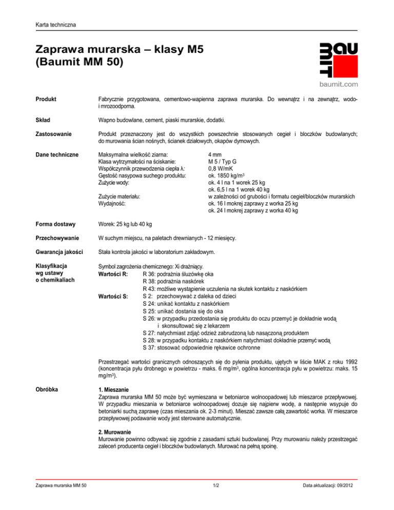 Karta techniczna Zaprawa murarska – klasy M5 (Baumit MM 50) Produkt Fabrycznie przygotowana, cementowo-wapienna zaprawa murarska. Do wewnątrz i na zewnątrz, wodoi mrozoodporna. Skład Wapno budowlane, cement, piaski murarskie, dodatki. Zastosowanie Produkt przeznaczony jest do wszystkich powszechnie stosowanych cegieł i bloczków budowlanych; do murowania ścian nośnych, ścianek działowych, okapów dymowych. Dane techniczne Maksymalna wielkość ziarna: Klasa wytrzymałości na ściskanie: Współczynnik przewodzenia ciepła λ: Gęstość nasypowa suchego produktu: Zużycie wody: Zużycie materiału: Wydajność: 4 mm M 5 / Typ G 0,8 W/mK ok. 1850 kg/m3 ok. 4 l na 1 worek 25 kg ok. 6,5 l na 1 worek 40 kg w zależności od grubości i formatu cegieł/bloczków murarskich ok. 16 l mokrej zaprawy z worka 25 kg ok. 24 l mokrej zaprawy z worka 40 kg Forma dostawy Worek: 25 kg lub 40 kg Przechowywanie W suchym miejscu, na paletach drewnianych - 12 miesięcy. Gwarancja jakości Stała kontrola jakości w laboratorium zakładowym. Klasyfikacja wg ustawy o chemikaliach Symbol zagrożenia chemicznego: Xi drażniący. Wartości R: R 36: podrażnia śluzówkę oka R 38: podrażnia naskórek R 43: możliwe wystąpienie uczulenia na skutek kontaktu z naskórkiem S 2: przechowywać z daleka od dzieci Wartości S: S 24: unikać kontaktu z naskórkiem S 25: unikać dostania się do oka S 26: w przypadku przedostania się produktu do oczu przemyć je dokładnie wodą i skonsultować się z lekarzem S 27: natychmiast zdjąć odzież zabrudzoną lub nasączoną produktem S 28: w przypadku kontaktu z naskórkiem natychmiast dokładnie przemyć wodą S 37: stosować odpowiednie rękawice ochronne Przestrzegać wartości granicznych odnoszących się do pylenia produktu, ujętych w liście MAK z roku 1992 (koncentracja pyłu drobnego w powietrzu - maks. 6 mg/m3, ogólna koncentracja pyłu w powietrzu: maks. 15 mg/m3). Obróbka 1. Mieszanie Zaprawa murarska MM 50 może być wymieszana w betoniarce wolnoopadowej lub mieszarce przepływowej. W przypadku mieszania w betoniarce wolnoopadowej dozuje się najpierw wodę, a następnie wsypuje do betoniarki suchą zaprawę (czas mieszania ok. 2-3 minut). Mieszać zawsze całą zawartość worka. W mieszarce przepływowej podawanie wody jest sterowane automatycznie. 2. Murowanie Murowanie powinno odbywać się zgodnie z zasadami sztuki budowlanej. Przy murowaniu należy przestrzegać zaleceń producenta cegieł i bloczków budowlanych. Murować na pełną spoinę. Zaprawa murarska MM 50 1/2 Data aktualizacji: 09/2012 Karta techniczna Wskazówki ogólne Temperatura otoczenia, podłoża i materiału w czasie obróbki i procesu wiązania nie powinna być niższa niż +5OC. Do zaprawy dodawać wyłącznie czystej wody z wodociągów. Nie dodawać innych dodatków (np. środków przeciw zamarzaniu). Świeżą zaprawę należy zużyć - w zależności od warunków atmosferycznych - w ciągu 1 - 2 godzin. Nasze zalecenia w zakresie stosowanych technik, przekazywane słowem i pismem w celu wsparcia nabywcy (użytkownika) opracowane w oparciu o nasze doświadczenia i aktualny stan wiedzy są niewiążące i nie uzasadniają prawnego stosunku umownego oraz żadnych zobowiązań ubocznych z tytułu umowy kupna (sprzedaży). Nie zwalniają one nabywcy od sprawdzenia na własną odpowiedzialność przydatności naszych produktów do przewidzianego zastosowania. Należy przestrzegać ogólnych zasad techniki budowlanej. Zastrzegamy sobie możliwość zmian, które służą technicznemu postępowi i ulepszeniu produktu lub jego zastosowaniu. Wraz z ukazaniem się niniejszej informacji technicznej wcześniejsze jej wersje tracą ważność. Najbardziej aktualne informacje znajdziecie Państwo na naszych stronach internetowych. Poza tym obowiązują nasze "Ogólne warunki umów" znajdujące się w katalogach produktów. Nasza gęsta sieć przedstawicielstw gwarantuje szybkie doradztwo i dostawy. Dodatkowych informacji prosimy zasięgnąć u najbliższego przedstawiciela regionalnego. Zaprawa murarska MM 50 2/2 Data aktualizacji: 09/2012