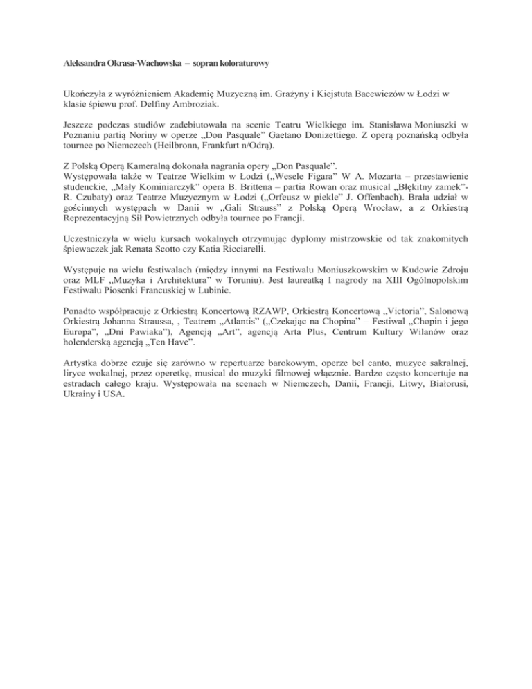 Aleksandra Okrasa-Wachowska – sopran koloraturowy Ukończyła z