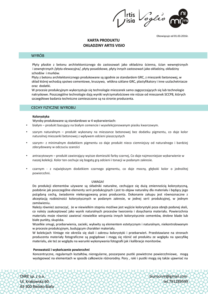 Obowiązuje od 01.03.2016r. KARTA PRODUKTU OKŁADZINY ARTIS VISIO WYRÓB Płyty płaskie z betonu architektonicznego do zastosowań jako okładzina ścienna, ścian wewnętrznych i zewnętrznych /płyta elewacyjna/, płyty posadzkowe, płyty innych zastosowań jako okładziny, okładziny schodów i murków. Płyty z betonu architektonicznego produkowane są zgodnie ze standardem GRC, z mieszanki betonowej, w skład której wchodzą spoiwo cementowe, kruszywo, włókna szklane GRC, plastyfikatory i inne uszlachetniacze oraz dodatki. W procesie produkcyjnym wykorzystuje się technologie mieszanek samo zagęszczających się lub technologie natryskowe. Poszczególne technologie dają wyniki wytrzymałościowe nie niższe od mieszanek SCCP8, których szczegółowe badania techniczne zamieszczone są na stronie producenta. CECHY FIZYCZNE WYROBU • Kolorystyka Wyroby produkowane są standardowo w 4 wybarwieniach: białym – produkt bazujący na białym cemencie i wyselekcjonowanym piasku kwarcowym. • szarym naturalnym – produkt wykonany na mieszance betonowej bez dodatku pigmentu, co daje kolor naturalnej mieszanki betonowej z wpływem odcieni piaszczystych • szarym– z minimalnym dodatkiem pigmentu co daje produkt nieco ciemniejszy od naturalnego i bardziej zdecydowany w odczuciu szarości • antracytowym – produkt zawierający wyższe domieszki farby czarnej, Co daje najmocniejsze wybarwienie w naszej kolekcji. Kolor ten cechuje się bogatą grą odcieni i tonacji w podanym zakresie. • czarnym - z największym dodatkiem czarnego pigmentu, co daje mocny, głęboki kolor o jednolitej powierzchni. UWAGA! Do produkcji elementów używane są składniki naturalne, cechujące się dużą zmiennością kolorystyczną, podobnie jak poszczególne elementy serii produkcyjnych i jest to objaw naturalny dla materiału i będący jego pożądaną cechą, świadomie niekorygowaną przez producenta. Dokonanie zakupu jest równoznaczne z akceptacją rozbieżności kolorystycznych w podanym zakresie, w jednej serii produkcyjnej, w jednym zamówieniu. Należy również zaznaczyć, że w niewielkim stopniu możliwe jest wyjście kolorystyki poza obręb podanej skali, co należy zaakceptować jako wynik naturalnych procesów tworzenia i dosychania materiału. Powierzchnia materiału może również zawierać niewielkie wtrącenia innych kolorystycznie cementów, drobne blade lub białe punkty, skupiska. Wszelkie smugi, przebarwienia, zacieki, wykwity są elementem estetycznym i naturalnym, niekontrolowanym w procesie produkcyjnym, budującym charakter materiału. W kolekcjach Vintage nie określa się skali i zakresu kolorystyki i przebarwień. Przedstawiane na stronach producenta materiały fotograficzne są poglądowe i mogą się różnić od produktu ze względu na specyfikę materiału, ale też ze względu na warunki wykonywania fotografii jak i kalibracje monitorów. Porowatość i wykończenie powierzchni Koncentryczne, regularnych kształtów, nieregularne, poszarpane pustki powietrzne powierzchniowe, mogą występować na elementach w sposób całkowicie różnorodny. Pory , raki i pustki mogą się także ujawniać na CNRE sp. z o.o. Ul. Krakowska 60 43-300 Bielsko Biała [email protected] tel.791289599 narożnikach i krawędziach materiału. Producent oferuje produkty w rodzajach natężenia występowania tych pustek: Płyty „gładkie” – o powierzchni gładkiej, z występującą niewielką ilością głównie koncentrycznych pustek wielkości średnicy do 2 mm na powierzchni, ogólna ilość powierzchni por nie przekracza 5 % powierzchni płyt. Płyty „lekko porowate” i „porowate” o różnym natężeniu i ilości pustek powietrznych, głównie poszarpanych i nieregularnych, wielkości przekraczającej często 2-5 mm, jak również gniazd koncentrycznych pustek i wżerów. Sposób występowania pustek, miejsca koncentracji, ilość i różnorodność są całkowicie naturalne dla materiału i przypadkowe. UWAGA! W obrębie jednej partii – dostawy materiału, występują elementy o różnym natężeniu ilości pustek. Pory , raki i pustki mogą się także ujawniać na narożnikach i krawędziach materiału. Kupujący przyjmuje do wiadomości, że tego rodzaju cechy są naturalne dla materiału i pożądane, nie są podstawą do reklamacji czy odstąpienia od zakupu. Istnieje możliwość zamówienia próbek. UWAGA!!! Próbki mogą różnić się od ostatecznie zamawianego materiału kolorem, porowatością, charakterem i gładkością powierzchni, zgodnie z informacjami zawartymi w karcie produktu. WYMIARY PRODUKTÓW – WERSJE WYMIAROWE a) Producent proponuje wiele wersji wymiarowych, wykonywanych w tej samej technologii materiału, dzięki czemu istnieje możliwość swobodnego i efektywnego doboru materiału do potrzeb aranżacji. Wymiarami podstawowymi są dla płytściennych (wymiary w cm) 250/100, 120/60, 110/40, 60/60 cm, o grubości handlowej 10-11 mm, 18 mm oraz inne elementy na zamówienie definiowane w wymiarach indywidualnie. Błąd normatywny dla elementów o grubości poniżej 40 mm wynosi +-2mm. Producent oferuje elementy niestandardowe na zamówienie, o indywidualnie dobranych rozmiarach. Produkty na zamówienie, oprócz zmienionych wymiarów, wykazują takie same cechy, jak standardowe, w zakresie cech fizycznych, tolerancji i odstępstw wymiarowych oraz parametrów technicznych, chyba że zostaną one sprecyzowane i ustalone indywidualnie. b) Krawędzie płyt wykonane są pod kątem prostym, ostre, równe, jednorodne optycznie z materiałem, co oznacza, że w materiale lekko porowatym i porowatym pustki mogą wystąpić na krawędziach i narożnikach elementów , przerywając ich ostrość. Cięcie materiału powoduje że powierzchnia przecięta różni się od lica i pokazuje skład mineralny płyty. PARAMETRY TECHNICZNE • • • • • • • • Badanie parametrów technicznych zostało wykonane przez Centrum Usług Badawczo Projektowych Budowni