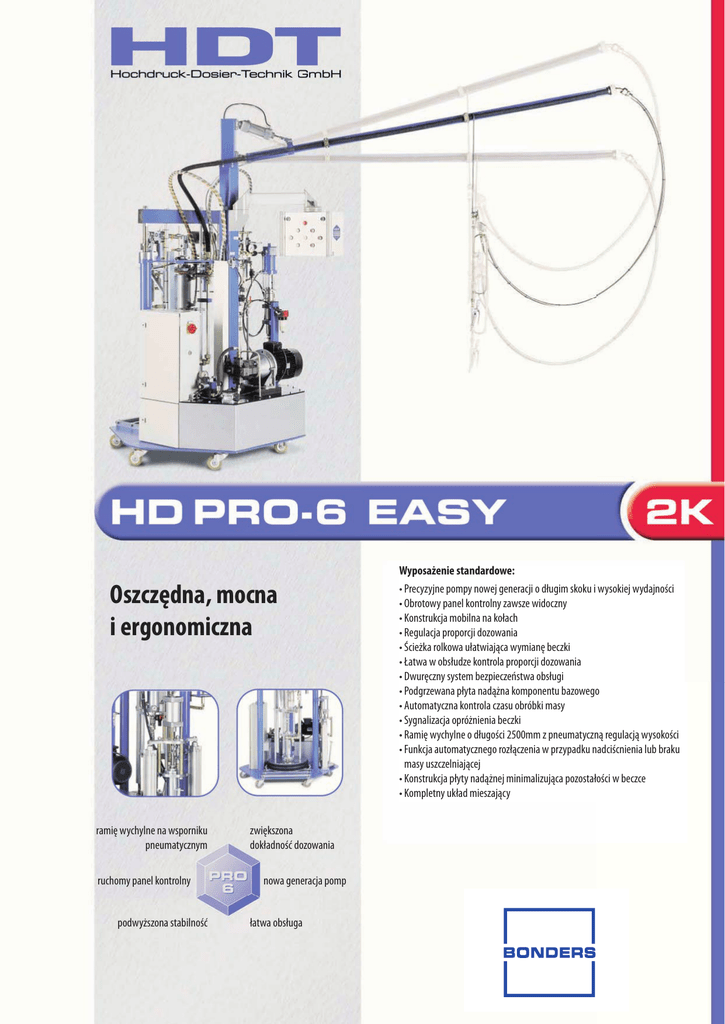 Oszczędna, mocna i ergonomiczna ramię wychylne na wsporniku pneumatycznym ruchomy panel kontrolny podwyższona stabilność zwiększona dokładność dozowania nowa generacja pomp łatwa obsługa Wyposażenie standardowe: • Precyzyjne pompy nowej generacji o długim skoku i wysokiej wydajności • Obrotowy panel kontrolny zawsze widoczny • Konstrukcja mobilna na kołach • Regulacja proporcji dozowania • Ścieżka rolkowa ułatwiająca wymianę beczki • Łatwa w obsłudze kontrola proporcji dozowania • Dwuręczny system bezpieczeństwa obsługi • Podgrzewana płyta nadążna komponentu bazowego • Automatyczna kontrola czasu obróbki masy • Sygnalizacja opróżnienia beczki • Ramię wychylne o długości 2500mm z pneumatyczną regulacją wysokości • Funkcja automatycznego rozłączenia w przypadku nadciścnienia lub braku masy uszczelniającej • Konstrukcja płyty nadążnej minimalizująca pozostałości w beczce • Kompletny układ mieszający HDT Pro 6 Easy jest czołowym produktem wśród hydraulicznych maszyn do ręcznego nakładania masy uszczelniającej. Znaki szczególne to nowoczesna podstawa w kształcie sześciokątu poprawiająca stabilność oraz ruchomy panel kontrolny. Pneumatycznie regulowana wysokość ramienia wychylnego umożliwia bardzo efektywne dostosowanie miejsca pracy do potrzeb użytkownika Dane techniczne Wydajność ok. 5500g/min (PU) Zasilanie elektryczne 3 x 400V/N/PE, 50Hz zabezpieczenie 16A Zasilanie hydrauliczne 4 – 8 bar 3/8“ Wymiary 1,240 x 2,400 mm Waga ok. 750 kg Konstrukcja mobilna Regulacja wydajności pełen zakres Wyposażenie opcjonalne: • Sterownik Siemens S5 • Panel tekstowy Siemens OP 7 • Pompa płucząca • Zamrażarka do temp -45°C • Indywidualnie dobrana długość ramienia wychylnego • Podgrzewanie ramienia wychylnego • Pobieranie komponentu B z beczki 200-litrowej • Indywidualny kolor BONDERS, ul. Żeglarska 24, Lusówko, 62-080 Tarnowo Podgórne, tel. +48 602 66 33 77 e-mail: [email protected] • • www.bonders.pl