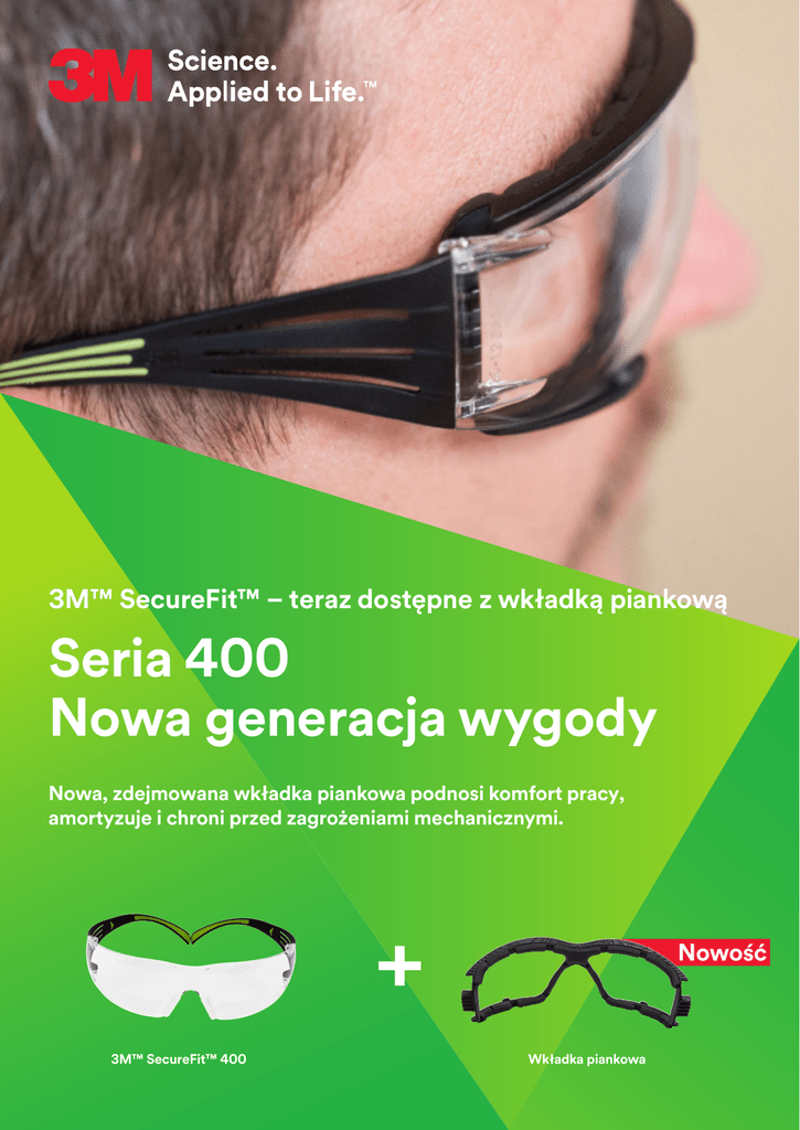 3M™ SecureFit™ – teraz dostępne z wkładką piankową Seria 400 Nowa generacja wygody Nowa, zdejmowana wkładka piankowa podnosi komfort pracy, amortyzuje i chroni przed zagrożeniami mechanicznymi. Nowość 3M™ SecureFit™ 400 Wkładka piankowa Okulary ochronne 3M™ SecureFit™ 400 Nowa wkładka piankowa serii 400 podnosi komfort pracy oraz bezpieczeństwo każdego użytkownika. 2. Zdejmowana wkładka piankowa zapewnia duży komfort i amortyzację oraz ochronę przez zagrożeniami mechanicznymi Nowość 1.Poliwęglanowe soczewki pochłaniają 99,9% promieniowania UVA i UVB zachowując zgodność z normą EN166:2001. 6. Okulary ochronne 3M™ SecureFit™ serii 200 i 400 zostały wyposażone w najnowsze osiągnięcie technologiczne – opatentowaną, samoregulującą technologię Pressure Diffusion Temple Technology, która pomaga rozpraszać punkty nacisku na skroniach i podnosi wygodę noszenia oprawek, jednocześnie nie szkodząc bezpiecznemu dopasowaniu okularów. 4. Podwójnie wtryskiwane punkty styku zauszników zapewniają wyższy komfort w okolicy skroni. Przezroczyste 3.Miękkie, regulowane noski pozwalają na bardziej zindywidualizowane dopasowanie. 5. Pogrubione lamówki o dynamicznym kształcie w nowoczesnej palecie kolorów dopasowanej do każdego stylu. Żółte Czarne Niebieske lustro I/O 3M ID Kod produktu Opis produktu UU003704788 SF401AF-EU Okulary ochronne 3M™ SecureFit™ 400, SF401AF-EU PC Przezroczyste AS/AF 20 UU003683412 SF403AF-EU Okulary ochronne 3M™ SecureFit™ 400, SF403AF-EU PC Żółte AS/AF 20 UU003683420 SF402AF-EU Okulary ochronne 3M™ SecureFit™ 400, SF402AF-EU PC Szare AS/AF 20 UU003683446 SF408AS-EU Okulary ochronne 3M™ SecureFit™ 400, SF408AS-EU PC Niebieskie lustro AS 20 UU003683438 SF410AS-EU Okulary ochronne 3M™ SecureFit™ 400, SF410AS-EU PC I/O AS 20 Dział Bezpieczeństwa Pracy 3M Polska Sp. z o. o. Al. Katowicka 117, Kajetany 05-830 Nadarzyn tel.: +48 22 739 90 00 www.3M.pl/bhp www.3M.pl/SecureFit Kolor MOQ