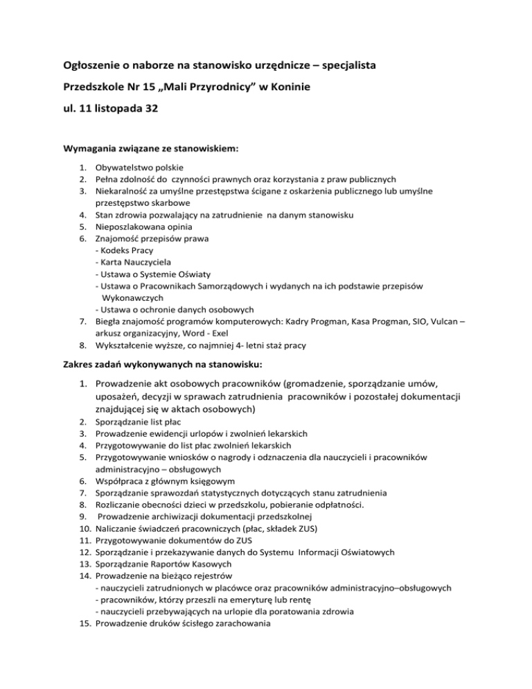 Ogłoszenie o naborze na stanowisko urzędnicze – specjalista Przedszkole Nr 15 „Mali Przyrodnicy” w Koninie ul. 11 listopada 32 Wymagania związane ze stanowiskiem: 1. Obywatelstwo polskie 2. Pełna zdolność do czynności prawnych oraz korzystania z praw publicznych 3. Niekaralność za umyślne przestępstwa ścigane z oskarżenia publicznego lub umyślne przestępstwo skarbowe 4. Stan zdrowia pozwalający na zatrudnienie na danym stanowisku 5. Nieposzlakowana opinia 6. Znajomość przepisów prawa - Kodeks Pracy - Karta Nauczyciela - Ustawa o Systemie Oświaty - Ustawa o Pracownikach Samorządowych i wydanych na ich podstawie przepisów Wykonawczych - Ustawa o ochronie danych osobowych 7. Biegła znajomość programów komputerowych: Kadry Progman, Kasa Progman, SIO, Vulcan – arkusz organizacyjny, Word - Exel 8. Wykształcenie wyższe, co najmniej 4- letni staż pracy Zakres zadań wykonywanych na stanowisku: 1. Prowadzenie akt osobowych pracowników (gromadzenie, sporządzanie umów, uposażeń, decyzji w sprawach zatrudnienia pracowników i pozostałej dokumentacji znajdującej się w aktach osobowych) 2. 3. 4. 5. 6. 7. 8. 9. 10. 11. 12. 13. 14. 15. Sporządzanie list płac Prowadzenie ewidencji urlopów i zwolnień lekarskich Przygotowywanie do list płac zwolnień lekarskich Przygotowywanie wniosków o nagrody i odznaczenia dla nauczycieli i pracowników administracyjno – obsługowych Współpraca z głównym księgowym Sporządzanie sprawozdań statystycznych dotyczących stanu zatrudnienia Rozliczanie obecności dzieci w przedszkolu, pobieranie odpłatności. Prowadzenie archiwizacji dokumentacji przedszkolnej Naliczanie świadczeń pracowniczych (płac, składek ZUS) Przygotowywanie dokumentów do ZUS Sporządzanie i przekazywanie danych do Systemu Informacji Oświatowych Sporządzanie Raportów Kasowych Prowadzenie na bieżąco rejestrów - nauczycieli zatrudnionych w placówce oraz pracowników administracyjno–obsługowych - pracowników, którzy przeszli na emeryturę lub rentę - nauczycieli przebywających na urlopie dla poratowania zdrowia Prowadzenie druków ścisłego zarachowania 16. Obsługa Kasy Przedszkola 17. Wykonywanie innych czynności kadrowych wynikających z obowiązujących przepisów oraz zleconych przez bezpośredniego przełożonego WYMAGANE DOKUMENTY APLIKACYJNE 1. 2. 3. 4. 5. 6. 7. Kserokopie dokumentów potwierdzających wykształcenie i dodatkowe kwalifikacje Życiorys – curriculum vitae List motywacyjny Kserokopie zaświadczeń o ukończonych kursach, szkoleniach Kwestionariusz osobowy dla osób ubiegających się o zatrudnienie Kserokopie świadectw pracy Podpisane pisemnie oświadczenie o pełnej zdolności do czynności prawnych w korzystaniu z praw publicznych o niekaralności za przestępstwa popełnione umyślnie 8. Zaświadczenie o braku przeciwskazań zdrowotnych do wykonywania na stanowisku specjalista 9. Klauzula o treści: ” Wyrażam zgodę na przetwarzanie moich danych osobowych zawartych w zgłoszeniu dla potrzeb rekrutacji, zgodnie z ustawą z dnia 29 sierpnia 1997 roku o ochronie danych osobowych (Dz.U. Nr. 133, poz. 83, ze zm.)” WYMOGI FORMALNE 1. Złożenie wymaganych dokumentów 2. Spełnianie wymagań związanych ze stanowiskiem DOKUMENTY W KOPERCIE Z ADNOTACJĄ „KONKURS NA STANOWISKO SPECJALISTY” NALEŻY SKŁADAĆ W PRZEDSZKOLU NR 15 „MALI PRZYRODNICY” W KONINIE UL. 11 LISTOPADA 32, OD PONIEDZIAŁKU DO PIATKU W GODZINACH OD 9:00 - 14:00, DO DNIA 08.08.2016r. POSTĘPOWANIE KONKURSOWE OBEJMUJE ANALIZĘ WSZYSTKICH ZŁOŻONYCH DOKUMENTÓW ORAZ ROZMOWY Z KANDYDATAMI. O TERMINACH ROZMOWY POINFORMUJEMY TELEFONICZNIE LUB LISTOWNIE. NADESŁANYCH DOKUMENTÓW NIE ZWRACAMY. DOKUMENTY, KTÓRE WPŁYNĄ DO PRZEDSZKOLA PO WYZEJ WYMIENIONYM TERMINIE NIE BĘDĄ ROZPATRYWANE. -