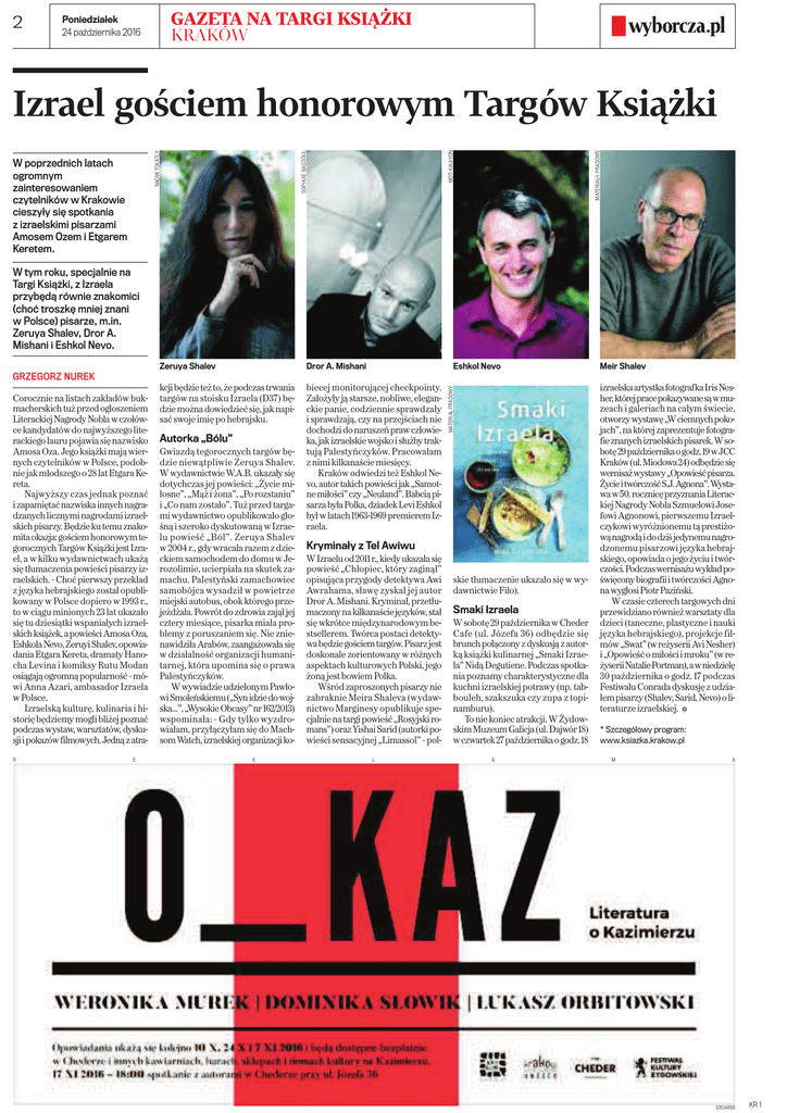 2 GAZETA NA TARGI KSIĄŻKI Poniedziałek 24 października 2016 KRAKÓW MATERIAŁY PRASOWE MOTI KIKAYON W poprzednich latach ogromnym zainteresowaniem czytelników w Krakowie cieszyły się spotkania z izraelskimi pisarzami Amosem Ozem i Etgarem Keretem. SOPHUIE BASSOUL NAOMI TOKATLY Izrael gościem honorowym Targów Książki W tym roku, specjalnie na Targi Książki, z Izraela przybędą równie znakomici (choć troszkę mniej znani w Polsce) pisarze, m.in. Zeruya Shalev, Dror A. Mishani i Eshkol Nevo. Zeruya Shalev Dror A. Mishani Eshkol Nevo kcji będzie też to, że podczas trwania targów na stoisku Izraela (D37) będzie można dowiedzieć się, jak napisać swoje imię po hebrajsku. biecej monitorującej checkpointy. Założyły ją starsze, nobliwe, eleganckie panie, codziennie sprawdzały i sprawdzają, czy na przejściach nie dochodzi do naruszeń praw człowieka, jak izraelskie wojsko i służby traktują Palestyńczyków. Pracowałam z nimi kilkanaście miesięcy. Kraków odwiedzi też Eshkol Nevo, autor takich powieści jak „Samotne miłości” czy „Neuland”. Babcią pisarza była Polka, dziadek Levi Eshkol był w latach 1963-1969 premierem Izraela. Meir Shalev Corocznie na listach zakładów bukmacherskich tuż przed ogłoszeniem Literackiej Nagrody Nobla w czołówce kandydatów do najwyższego literackiego lauru pojawia się nazwisko Amosa Oza. Jego książki mają wiernych czytelników w Polsce, podobnie jak młodszego o 28 lat Etgara Kereta. Najwyższy czas jednak poznać i zapamiętać nazwiska innych nagradzanych licznymi nagrodami izraelskich pisarzy. Będzie ku temu znakomita okazja: gościem honorowym tegorocznych Targów Książki jest Izrael, a w kilku wydawnictwach ukażą się tłumaczenia powieści pisarzy izraelskich. – Choć pierwszy przekład z języka hebrajskiego został opublikowany w Polsce dopiero w 1993 r., to w ciągu minionych 23 lat ukazało się tu dziesiątki wspaniałych izraelskich książek, a powieści Amosa Oza, Eshkola Nevo, Zeruyi Shalev, opowiadania Etgara Kereta, dramaty Hanocha Levina i komiksy Rutu Modan osiągają ogromną popularność – mówi Anna Azari, ambasador Izraela w Polsce. Izraelską kulturę, kulinaria i historię będziemy mogli bliżej poznać podczas wystaw, warsztatów, dyskusji i pokazów filmowych. Jedną z atraR E Autorka „Bólu” Gwiazdą tegorocznych targów będzie niewątpliwie Zeruya Shalev. W wydawnictwie W.A.B. ukazały się dotychczas jej powieści: „Życie miłosne”, „Mąż i żona”, „Po rozstaniu” i „Co nam zostało”. Tuż przed targami wydawnictwo opublikowało głośną i szeroko dyskutowaną w Izraelu powieść „Ból”. Ze ruya Sha lev w 2004 r., gdy wracała razem z dzieckiem samochodem do domu w Jerozolimie, ucierpiała na skutek zamachu. Palestyński zamachowiec samobójca wysadził w powietrze miejski autobus, obok którego przejeżdżała. Powrót do zdrowia zajął jej cztery miesiące, pisarka miała problemy z poruszaniem się. Nie znienawidziła Arabów, zaangażowała się w działalność organizacji humanitarnej, która upomina się o prawa Palestyńczyków. W wywiadzie udzielonym Pawłowi Smoleńskiemu („Syn idzie do wojska...”, „Wysokie Obcasy” nr 162/2013) wspominała: – Gdy tylko wyzdrowiałam, przyłączyłam się do Machsom Watch, izraelskiej organizacji koK Kryminały z Tel Awiwu W Izraelu od 2011 r., kiedy ukazała się powieść „Chłopiec, który zaginął” opisująca przygody detektywa Awi Awrahama, sławę zyskał jej autor Dror A. Mishani. Kryminał, przetłumaczony na kilkanaście języków, stał się wkrótce międzynarodowym bestsellerem. Twórca postaci detektywa będzie gościem targów. Pisarz jest doskonale zorientowany w różnych aspektach kulturowych Polski, jego żoną jest bowiem Polka. Wśród zaproszonych pisarzy nie zabraknie Meira Shaleva (wydawnictwo Marginesy opublikuje specjalnie na targi powieść „Rosyjski romans”) oraz Yishai Sarid (autorki powieści sensacyjnej „Limassol” – polL MATERIAŁ PRASOWY GRZE GORZ NU REK skie tłumaczenie ukazało się w wydawnictwie Filo). Smaki Izraela W sobotę 29 października w Cheder Ca fe (ul. Jó ze fa 36) od bę dzie się brunch połączony z dyskusją z autorką książki kulinarnej „Smaki Izraela” Nidą Degutiene. Podczas spotkania poznamy charakterystyczne dla kuchni izraelskiej potrawy (np. tabbouleh, szakszuka czy zupa z topinamburu). To nie koniec atrakcji. W Żydowskim Muzeum Galicja (ul. Dajwór 18) wczwartek 27 października ogodz. 18 A izraelska artystka fotograf ka Iris Nesher, której prace pokazywane są wmuzeach i galeriach na całym świecie, otworzy wystawę „Wciemnych pokojach”, na której zaprezentuje fotografie znanych izraelskich pisarek. Wsobotę 29 października ogodz. 19 wJCC Kraków (ul. Miodowa 24) odbędzie się wernisaż wystawy „Opowieść pisarza. Życie itwórczość S.J. Agnona”. Wystawa w50. rocznicę przyznania Literackiej Nagrody Nobla Szmuelowi Josefowi Agnonowi, pierwszemu Izraelczykowi wyróżnionemu tą prestiżową nagrodą ido dziś jedynemu nagrodzonemu pisarzowi języka hebrajskiego, opowiada o jego życiu i twórczości. Podczas wernisażu wykład poświęcony biografii itwórczości Agnona wygłosi Piotr Paziński. W czasie czterech targowych dni przewidziano również warsztaty dla dzieci (taneczne, plastyczne i nauki języka hebrajskiego), projekcje filmów „Swat” (w reżyserii Avi Nesher) i „Opowieść o miłości i mroku” (w reżyserii Natalie Portman), awniedzielę 30 października o godz. 17 podczas Festiwalu Conrada dyskusję z udziałem pisarzy (Shalev, Sarid, Nevo) o literaturze izraelskiej. f * Szczegółowy program: www.ksiazka.krakow.pl M A 33534806 KR 1