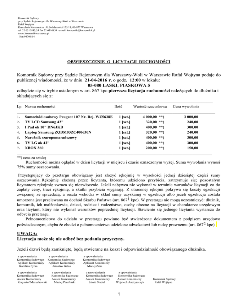 Komornik Sądowy przy Sądzie Rejonowym dla Warszawy-Woli w Warszawie Rafał Wojtyna Kancelaria Komornicza Al.Solidarności 155/11, 00-877 Warszawa tel. 22 6310833,35 fax 22 6310834 e-mail: [email protected] www.komornikwarszawa.pl Km 94706/14 OBWIESZCZENIE O LICYTACJI RUCHOMOŚCI Komornik Sądowy przy Sądzie Rejonowym dla Warszawy-Woli w Warszawie Rafał Wojtyna podaje do publicznej wiadomości, że w dniu 21-04-2016 r. o godz. 12:00 w lokalu: 05-080 LASKI, PIASKOWA 5 odbędzie się w trybie ustalonym w art. 867 kpc pierwsza licytacja ruchomości należących do dłużnika i składających się z: _______________________________________________________________________________________________________________________ Lp. Nazwa ruchomości Ilość Wartość szacunkowa Cena wywołania _________________________________________________________________________________________________________________________ 1. 2. 3. 4. 5. 6. 7. Samochód osobowy Peugeot 107 Nr. Rej. WZ5638E TV LCD Samsung 42" I Pad ok 10" DN6JKB Laptop Samsung ZQBM03ZC400630N Narożnik szaropomarańczowy TV LG ok 42" XBOX 360 1 [szt.] 1 [szt.] 1 [szt.] 1 [szt.] 1 [szt.] 1 [szt.] 1 [szt.] 4 000,00 320,00 400,00 320,00 400,00 400,00 200,00 **) **) **) **) **) **) **) 3 000,00 240,00 300,00 240,00 300,00 300,00 150,00 _______________________________________________________________________________________________________________________ **) cena za sztukę Ruchomości można oglądać w dzień licytacji w miejscu i czasie oznaczonym wyżej. Suma wywołania wynosi 75% sumy oszacowania. Przystępujący do przetargu obowiązany jest złożyć rękojmię w wysokości jednej dziesiątej części sumy oszacowania. Rękojmię złożoną przez licytanta, któremu udzielono przybicia, zatrzymuje się; pozostałym licytantom rękojmię zwraca się niezwłocznie. Jeżeli nabywca nie wykonał w terminie warunków licytacji co do zapłaty ceny, traci rękojmię, a skutki przybicia wygasają. Z utraconej rękojmi pokrywa się koszty egzekucji związanej ze sprzedażą, a reszta wchodzi w skład sumy uzyskanej w egzekucji albo jeżeli egzekucja została umorzona jest przelewana na dochód Skarbu Państwa (art. 8671 kpc). W przetargu nie mogą uczestniczyć: dłużnik, komornik, ich małżonkowie, dzieci, rodzice i rodzeństwo, osoby obecne na licytacji w charakterze urzędowym oraz licytant, który nie wykonał warunków poprzedniej licytacji. Stawienie się jednego licytanta wystarcza do odbycia przetargu. Pełnomocnictwo do udziału w przetargu powinno być stwierdzone dokumentem z podpisem urzędowo poświadczonym, chyba że chodzi o pełnomocnictwo udzielone adwokatowi lub radcy prawnemu (art. 8672 kpc) UWAGA: Licytacja może się nie odbyć bez podania przyczyny. Jeżeli drzwi będą zamknięte, będą otwierane na koszt i odpowiedzialność obowiązanego dłużnika. z upowaznienia Komornika Sądowego Aplikant Komorniczy Karolina Pyrka z upoważnienia Komornika Sądowego Asesor Komorniczy Krzysztof Mazuchowski z upoważnienia Komornika Sądowego Aplikant Komorniczy Jarosław Galas z upoważnienia Komornika Sądowego Asesor Komorniczy Maciej Parafiński z upoważnienia Komornika Sądowego Aplikant Komorniczy Maciej Zaks z upoważnienia z upoważnienia Komornika Sądowego Komornika Sądowego Asesor Komorniczy Asesor Komorniczy Jakub Siadul Wojciech Andryszczyk 1 Komornik Sądowy Rafał Wojtyna