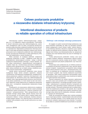 Krzysztof Billewicz Politechnika Wrocławska Katedra Energoelektryki Celowe postarzanie produktów a niezawodne działanie infrastruktury krytycznej Intentional obsolescence of products vs reliable operation of critical infrastructure Informatyzacja systemu elektroenergetycznego, polegająca m.in. na zwiększeniu stopnia automatyzacji i komunikacji w ramach sterowania pracą sieci elektroenergetycznej, oprócz wielu niewątpliwych zalet ma także, przynajmniej teoretycznie, poważną wadę: powoduje zwiększenie podatności pracy tej sieci na cyberataki [5]. Odpowiednie przetwarzanie informacji powoduje, że sieć staje się bardziej inteligentna, jednak może również przyczyniać się do zwiększania podatności sieci elektroenergetycznej i jej krytycznej infrastruktury na atak cybernetyczny, który może być katastrofalny w swoich skutkach [4]. Warto zauważyć, że występuje zależność: zwiększenie podatności infrastruktur na ataki = dodatkowy rynek zbytu dla przedsiębiorstw dostarczających produkty i usługi w zakresie zwiększania bezpieczeństwa cyfrowego u swoich klientów. Zatem zakup nowoczesnych, zaawansowanych technologicznie urządzeń wiąże się z koniecznością ponoszenia dodatkowych inwestycji przez operatorów sieci. Z punktu widzenia gospodarki jeden zakup przekłada się na kolejne zakupy, dodatkowe przychody różnych producentów i usługodawców. Jednak oprócz wymienionych podatności może również występować drugie, bardzo poważne zagrożenie, związane z powszechną informatyzacją przedsiębiorstw energetycznych: celowe postarzanie urządzeń i systemów informatycznych, czyli wykorzystanie do sterowania pracą sieci elektroenergetycznej urządzeń, które mają zaprogramowany skrócony czas życia (które są celowo postarzone), co może narazić tę sieć oraz końcowych odbiorców energii elektrycznej na zwiększoną awaryjność pracy sieci i zmniejszenie niezawodności dostarczania energii elektrycznej. Prawdą jest to, że nowoczesne, elektroniczne urządzenia stają się coraz bardziej złożone oraz bardzo często posiadają wbudowany system komputerowy, z własnym systemem operacyjnym i oprogramowaniem. Takie oprogramowanie może posiadać różnego rodzaju błędy. Jednak również może zdarzyć się sytuacja, że do budowy takich urządzeń będą wykorzystywane słabsze i tańsze podzespoły, bardziej awaryjne, drugiej kategorii jakości. Przy obecnej presji na obniżanie cen urządzeń takie podejście wcale nie jest wykluczone czy wręcz niemożliwe. październik 2016 Definicja i cele strategii celowego postarzania Ze względu na szybki rozwój technologii podstawowy czas życia produktów wydłużałby się. Więc raz sprzedane produkty byłyby zastępowane nowymi bardzo rzadko. Jednak obserwuje się tendencję odwrotną: zakupione urządzenia coraz częściej szybko, po upływnie terminu gwarancji, psują się. Widać, że następuje coraz krótszy czas bezawaryjnej pracy raz zakupionych urządzeń oraz coraz bardziej skraca się czas ich możliwego wykorzystania. Trzeba jednoznacznie podkreślić: krótszy czas życia i mniejsza trwałość niektórych wytwarzanych obecnie produktów niż te wytwarzane dawniej, wydaje się być faktem. Celowe planowe postarzanie jest jedynie podejrzeniem, być może bezpodstawnym. Od pewnego czasu podejrzewa się, że niektórzy producenci posługują się planowym postarzaniem (ang. planned obsolescence) urządzeń. Uzasadnieniem prowadzenia takiej strategii byłoby celowe skrócenie czasu życia – bezawaryjnej pracy urządzeń, co przekłada się na zwiększenie wolumenu sprzedawanych nowych urządzeń, więc również zwiększenie przychodów ze sprzedaży. Takie celowe postarzanie stymulowałoby popyt, wywierałoby presję na użytkowników, aby wcześniej lub częściej niż zwykle kupowali nowe produkty. Planowe postarzanie lub inaczej nazywane zaplanowane skracanie czasu życia produktu jest to strategia biznesowa polegająca na planowanym, od samego początku procesu wytwórczego, i zabudowanym w produkcie elementu, komponentu lub rozwiązaniu, które spowoduje szybsze zestarzenie lub zepsucie się tego produktu. Planowane postarzanie jest to polityka planowania lub projektowania produktu w taki sposób, aby w sposób sztuczny ograniczyć czas jego wykorzystania, ponieważ po upływie tego czasu stanie się ono nieaktualne, niemodne, uszkodzone, awaryjne lub niefunkcjonalne. Dzięki tak prowadzonej strategii klient szybciej pozbędzie się raz kupionego produktu i szybciej będzie odczuwał potrzebę zakupu nowszego produktu. W ten sposób skraca się czas do ponownych zakupów realizowanych przez klientów. To przekłada się dalej na uzyskanie dodatkowych przychodów ze sprzeda- www.energetyka.eu strona 573 ży kolejnych produktów. Celowe postarzanie najlepiej sprawdza się wtedy, kiedy producent na rynku ma monopol, dominującą pozycję albo występuje tam oligopol, czyli branża jest zdominowana przez niewielką liczbę producentów lub sprzedawców. W przypadku występowania celowego postarzania występuje asymetria odnośnie dostępu do informacji: producent dokładnie wie, jakie słabe elementy ma konkretny produkt i jaki jest szacunkowy czas pracy najbardziej wrażliwych z nich, natomiast klient jest pozbawiony dostępu do takich informacji. Producent staje się tu zwycięzcą, a klient pokonanym. Przykłady, w których można podejrzewać planowane postarzanie Sama konstrukcja produktów mówi o oczekiwanym średnim czasie życia. Oczywiście nie można stworzyć produktów niezniszczalnych, zawsze i w każdych warunkach pracujących niezawodnie oraz stale zachowujących pełną funkcjonalność. Żywotność produktów można wydłużyć, na etapie projektowania i tworzenia, poznając słabe elementy konstrukcji i wzmacniając je albo sztucznie skrócić, osłabiając najbardziej podatne części konstrukcji lub używając do produkcji materiałów niskiej jakości, krótk