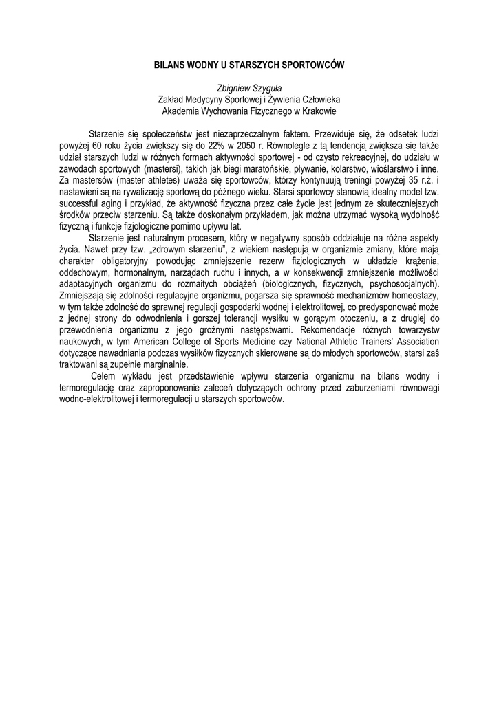 BILANS WODNY U STARSZYCH SPORTOWCÓW Zbigniew Szyguła Zakład Medycyny Sportowej i Żywienia Człowieka Akademia Wychowania Fizycznego w Krakowie Starzenie się społeczeństw jest niezaprzeczalnym faktem. Przewiduje się, że odsetek ludzi powyżej 60 roku życia zwiększy się do 22% w 2050 r. Równolegle z tą tendencją zwiększa się także udział starszych ludzi w różnych formach aktywności sportowej - od czysto rekreacyjnej, do udziału w zawodach sportowych (mastersi), takich jak biegi maratońskie, pływanie, kolarstwo, wioślarstwo i inne. Za mastersów (master athletes) uważa się sportowców, którzy kontynuują treningi powyżej 35 r.ż. i nastawieni są na rywalizację sportową do późnego wieku. Starsi sportowcy stanowią idealny model tzw. successful aging i przykład, że aktywność fizyczna przez całe życie jest jednym ze skuteczniejszych środków przeciw starzeniu. Są także doskonałym przykładem, jak można utrzymać wysoką wydolność fizyczną i funkcje fizjologiczne pomimo upływu lat. Starzenie jest naturalnym procesem, który w negatywny sposób oddziałuje na różne aspekty życia. Nawet przy tzw. „zdrowym starzeniu”, z wiekiem następują w organizmie zmiany, które mają charakter obligatoryjny powodując zmniejszenie rezerw fizjologicznych w układzie krążenia, oddechowym, hormonalnym, narządach ruchu i innych, a w konsekwencji zmniejszenie możliwości adaptacyjnych organizmu do rozmaitych obciążeń (biologicznych, fizycznych, psychosocjalnych). Zmniejszają się zdolności regulacyjne organizmu, pogarsza się sprawność mechanizmów homeostazy, w tym także zdolność do sprawnej regulacji gospodarki wodnej i elektrolitowej, co predysponować może z jednej strony do odwodnienia i gorszej tolerancji wysiłku w gorącym otoczeniu, a z drugiej do przewodnienia organizmu z jego groźnymi następstwami. Rekomendacje różnych towarzystw naukowych, w tym American College of Sports Medicine czy National Athletic Trainers’ Association dotyczące nawadniania podczas wysiłków fizycznych skierowane są do młodych sportowców, starsi zaś traktowani są zupełnie marginalnie. Celem wykładu jest przedstawienie wpływu starzenia organizmu na bilans wodny i termoregulację oraz zaproponowanie zaleceń dotyczących ochrony przed zaburzeniami równowagi wodno-elektrolitowej i termoregulacji u starszych sportowców.
