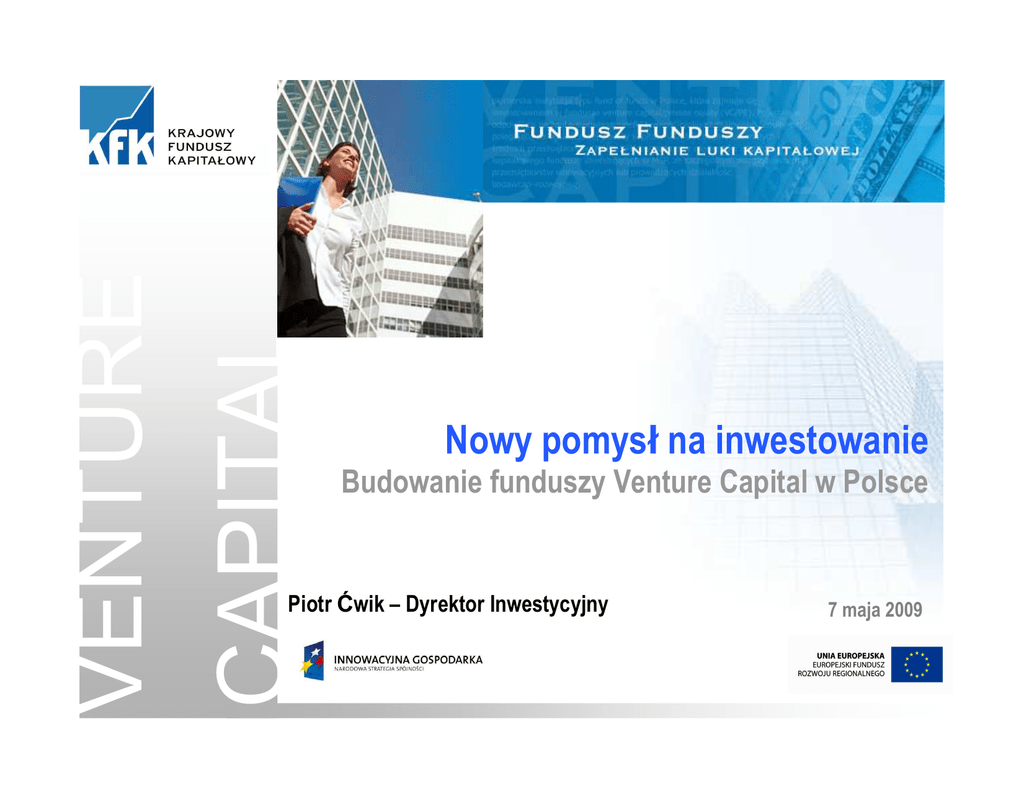 CAPITAL VENTURE Nowy pomysł na inwestowanie Budowanie funduszy Venture Capital w Polsce Piotr Ćwik – Dyrektor Inwestycyjny 7 maja 2009 Czym jest KFK ? ► KFK jest instytucją finansową – pierwszym polskim funduszem funduszy Venture Capital ► KFK został utworzony w 2005 r. przez rząd polski w celu ograniczenia zjawiska luki kapitałowej ► KFK funkcjonuje w formie spółki akcyjnej (100% akcjonariuszem jest Bank Gospodarstwa Krajowego), na podstawie ustawy i rozporządzenia (notyfikowanego w Komisji Europejskiej) ► KFK działa na zasadzie specyficznego partnerstwa publiczno-prywatnego Polskie przedsiębiorstwa Mikro (95%) Małe (4,1%) 3,6 mln MŚ P Średnie (0,8%) DuŜe (0,1%) Źródło: GUS (dane na koniec 2006 r.) 99,9% MŚP są motorem gospodarki ► ► ► ► ► ► ► MŚP stanowią 99,9% wszystkich polskich przedsiębiorstw (ok. 95% stanowią mikroprzedsiębiorstwa)* Udział MŚP w PKB – 50% (mikro i małe – 40%)* Zapewniają ok. 65% zatrudnienia w sektorze prywatnym* Posiadają wysoki potencjał wzrostu (innowacyjność) Są elastyczne w działaniu i konkurencyjne Przy odpowiednim finansowaniu i wsparciu biznesowym, mogą wygenerować ponadprzeciętne stopy zwrotu dla ich właścicieli Niestety: obecna struktura finansowania polskich MŚP (w ok. 80% ze środków własnych ich właścicieli) w połączeniu z relatywnie niskim poziomem zamoŜności społeczeństwa, znacząco ogranicza lub uniemoŜliwia rozwój MŚP Źródło: GUS (*dane na koniec 2006 r.) Zjawisko luki kapitałowej ► Luka kapitałowa (ang. equity gap) – problem pozyskania finansowania dla stosunkowo małych projektów inwestycyjnych, we wczesnych etapach rozwoju tzw. zasiew (ang. seed) i start (ang. start-up) ► Luka kapitałowa kształtuje się w przedziale finansowania od 0,1 - 2 mln zł do 8 - 10 mln zł ► Pozyskanie środków na publicznym rynku kapitałowym (np. emisja akcji), od banków czy firm leasingowych nie jest moŜliwe ► Banki niechętnie udzielają finansowania MŚP ze względu na brak lub niski poziom majątku mogącego stanowić zabezpieczenie kredytu oraz trudne do oszacowania przyszłe dochody; oferta publiczna jest kosztowna i czasochłonna, a dodatkowo szanse pozyskania kapitału tą drogą są uzaleŜnione w duŜym stopniu od koniunktury giełdowej ► Problem luki kapitałowej uwaŜany jest za jedną z najpowaŜniejszych i najbardziej szkodliwych barier rozwoju przedsiębiorczości w Polsce; szeroki dostęp do kapitału warunkuje utrzymanie płynności finansowej oraz realizowanie inwestycji rozwojowych „Dolina „DolinaŚmierci” śmierci” Źródło: PARP potrzeby kapitałowe właściciel rodzina 'DOLINA ŚMIERCI' czas pomysł zasiew i start seed & start-up wzrost późniejszy wzrost, ekspansja Co to jest private equity / venture capital ? PE/VC oznacza inwestycje na niepublicznym rynku kapitałowym Finansowanie kapitałem PE/VC w zaleŜności od fazy rozwoju przedsiębiorstw Dojrzałe firmy Wykupy, refinansowanie MBO, MBI, LBO Obroty firmy ► Ekspansja działalności Rozpoczęcie działalności, tzw. zasiew oraz start Czas Obszar venture capital Obszar private equity Rodzaje inwestycji typu PE/VC ► Finansowanie spółek w początkowym etapie rozwoju ― Faza zasiewu (seed capital) – finansowanie wstępnych, potencjalnie zyskownych pomysłów jeszcze przed załoŜeniem przedsiębiorstwa; środki z reguły przeznaczane są na: przeprowadzanie wstępnych badań rynkowych, zbudowanie prototypu produktu, przygotowanie dokładnego biznesplanu Faza startu (start-up) – finansowanie przedsiębiorstw w trakcie tworzenia lub na progu działalności, wprowadzających produkt na rynek po raz pierwszy, jednak przed sprzedaŜą produktu na znaczną skalę ― ► Finansowanie przedsiębiorstw w fazie ekspansji – Faza ekspansji (expansion capital) – finansowanie wzrostu i rozwoju przedsiębiorstwa; kapitał przeznaczony jest głównie na: finansowanie duŜych potrzeb inwestycyjnych, rozwinięcie sieci dystrybucji, rozwój rynku lub produktu ► Wykupy, refinansowanie – MBO (Management buy-out): nabycie spółki/przedsięwzięcia przez obecny zarząd – MBI (Managemnt buy-in): nabycie spółki/przedsięwzięcia przez zarząd z zewnątrz – LBO (Leveraged buy-out): nabycie udziałów, bez udziału zarządu PE/VC rozwija nowoczesną gospodarkę Spółki finansowane przez PE/VC rosną szybciej od spółek publicznych Przeciętny wzrost przychodów p.a. 1999-2005 25% Przychody spółek finansowanych przez PE/VC rosły w tempie 20% rocznie w porównaniu z 7-8% w przypadku duŜych i średnich spółek giełdowych. 20% 20% 15% 8% 10% 7% 5% 0% PE/VC FTSE 100 Spółki finansowane przez PE/VC dynamicznie zwiększają zatrudnienie FTSE Mid-250 Spółki finansowane przez PE/VC zwiększały zatrudnienie średnio o 14% rocznie, tj. prawie 5 x bardziej dynamicznie niŜ spółki giełdowe. Przeciętny roczny wzrost zatrudnienia 1999-2005 źródło: BVCA 16% 14% 12% 8% 4% 3% 3% FTSE 100 FTSE Mid-250 0% Wspierane przez PE/VC PE/VC a inne formy finansowania ► Kapitał PE/VC ma przewaŜnie zastosowanie tam, gdzie z róŜnych względów niemoŜliwe jest finansowanie innego rodzaju (giełda, dług bankowy) ► Inwestorzy PE/VC szukają firm, które: - mają dobrą kadrę kierowniczą, - mają lepszą niŜ konkurencji ofertę produktów lub usług lub przewagę technologiczną, - działają na wzrostowym rynku, - rozwijają się szybciej niŜ ich branŜa, - posiadają znaczny udział w rynku ► Fundusze PE/VC inwestują w udziały/akcje spółek i dąŜą do wzrostu ich wartości (w celu odsprzedaŜy z zyskiem) ► Fundusze PE/VC są aktywnymi inwestorami, którzy wspierają spółkę w realizacji jej strategii (np. optymalizacja finansowania firmy, wprowadzenie zasad ładu korporacyjnego) ► Oprócz kapitału, fundusze wnoszą do firmy swoją wiedzę, doświadczenie, kontakty biznesowe ► Fundusz, stając się udziałowcem firmy, przyjmuje wraz z właścicielami firmy jej ryz