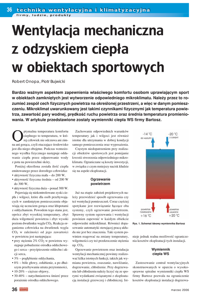 36 f i r m y, l u d z i e , p r o d u k t y Wentylacja mechaniczna z odzyskiem ciepła w obiektach sportowych Robert Onopa, Piotr Bujwicki Bardzo waønym aspektem zapewnienia w≥aúciwego komfortu osobom uprawiajπcym sport w obiektach zamkniÍtych jest wytworzenie odpowiedniego mikroklimatu. Naleøy przez to rozumieÊ zespÛ≥ cech fizycznych powietrza na okreúlonej przestrzeni, a wiÍc w danym pomieszczeniu. Mikroklimat uwarunkowany jest takimi czynnikami fizycznymi jak temperatura powietrza, zawartoúÊ pary wodnej, prÍdkoúÊ ruchu powietrza oraz úrednia temperatura promieniowania. W artykule przedstawione zosta≥y wymienniki ciep≥a WS firmy Bartosz. ptymalna temperatura komfortu cieplnego to temperatura, w ktÛrej cz≥owiek nie odczuwa ani zimna ani gorπca, czyli otaczajπce úrodowisko jest dla niego obojÍtne. Podczas wzmoøonego wysi≥ku fizycznego nastÍpuje oddawanie ciep≥a przez odparowanie wody z potu na powierzchni skÛry. Poniøej okreúlona zosta≥a iloúÊ ciep≥a emitowanego przez doros≥ego cz≥owieka: ï aktywnoúÊ fizyczna ma≥a ñ do 200 W, ï aktywnoúÊ fizyczna úrednia ñ od 200 W do 300 W, ï aktywnoúÊ fizyczna duøa ñ ponad 300 W. Pojawiajπ siÍ niekontrolowane zyski ciep≥a i wilgoci, ktÛre dla osÛb przebywajπcych w zamkniÍtym pomieszczeniu objawiajπ siÍ uczuciem gorπca oraz k≥opotami z oddychaniem. Powodem tego stanu jest, oprÛcz zbyt wysokiej temperatury, zbyt duøa wilgotnoúÊ powietrza i zbyt wysoki poziom dwutlenku wÍgla CO2. Reakcja organizmu cz≥owieka na dwutlenek wÍgla CO2 w zaleønoúci od jego zawartoúci w powietrzu jest nastÍpujπca: ï przy stÍøeniu 2% CO2 w powietrzu wystÍpuje pobudzenie oúrodka oddechowego i serca ñ przyúpieszenie oddechu i akcji serca, ï 3% ñ pog≥Íbienie oddychania, ï 8% ñ bÛle g≥owy, os≥abienie, a po d≥uøszym przebywaniu utrata przytomnoúci, ï 10-20% ñ ciÍøsze objawy, ï 30-40% ñ natychmiastowa úmierÊ przez poraøenie oúrodka oddechowego. O 36 Zachowanie odpowiednich warunkÛw temperatury jak i wilgoci jest rÛwnieø istotne dla utrzymania w dobrej kondycji samego pomieszczenia oraz wyposaøenia. CzÍstym niedopatrzeniem przy realizacji obiektÛw sportowych jest pomijanie kwestii stworzenia odpowiedniego mikroklimatu. Ograniczane sπ koszty inwestycji, w zwiπzku z czym mniejszy nacisk k≥adzie siÍ na aspekt eksploatacji. Ogrzewanie powietrzem Juø na etapie za≥oøeÒ projektowych naleøy przewidzieÊ sposÛb ogrzewania czy teø wentylacji pomieszczeÒ. Coraz czÍúciej spotykane jest rozwiπzanie ≥πczπce oba systemy, czyli ogrzewanie powietrzem. Sprawny system ogrzewania i wentylacji powinien zapewniÊ w kaødym obiekcie odpowiedni mikroklimat. RÛwnieø dopasowanie automatyki sterujπcej pracπ uk≥adu nie jest bez znaczenia. Taki system powinien reagowaÊ na zmiany temperatury, wilgotnoúci czy teø przekroczenie stÍøenia np. CO2. Ogrzewanie powietrzem oraz instalacja wentylacji mechanicznej powinny realizowaÊ kilka istotnych funkcji, takich jak wymiana powietrza, osuszanie, nawiløanie, dogrzewanie, ch≥odzenie. Przy dogrzewaniu lub ch≥odzeniu naleøy liczyÊ siÍ ze sporymi wydatkami zwiπzanymi z eksploatacjπ instalacji grzewczej i ch≥odniczej. Ist- Rys. 1. Schemat ideowy wymiennika Bartosz nieje jednak realna moøliwoúÊ ograniczenia kosztÛw eksploatacji tych instalacji. Wymiennik ciep≥a WS Zastosowanie central wentylacyjnych skonstruowanych w oparciu o wysokosprawne spiralne wymienniki ciep≥a WS firmy Bartosz pozwala na ograniczenie kosztÛw eksploatacji instalacji dogrzewamarzec 2006 37 f i r m y, l u d z i e , p r o d u k t y jπcej powietrze lub ch≥odniczej. Centrale tego typu sprawdzi≥y siÍ w szeregu realizacji i sπ coraz czÍúciej stosowane w celu uzyskania rozwiπzaÒ energooszczÍdnych. Centrale wentylacyjne pozwalajπ odzyskaÊ minimum 85% energii cieplnej i 70% ch≥odu. Wymiennik Bartosz jest urzπdzeniem zdolnym do pracy z wysokπ sprawnoúciπ w rÛønych temperaturach zewnÍtrznych. Pozwala to na zredukowanie strat energii ciep≥a w wentylacji do 15%. Niewπtpliwπ zaletπ wymiennika ciep≥a WS jest brak szronienia oraz szczelnoúÊ urzπdzenia wynoszπca 99,9%. W zaleønoúci od moøliwoúci montaøu centrale wentylacyjne Bartosz montowane sπ jako monobloki lub w systemie rozproszonym (w pomieszczeniu wentylatorni). WybÛr sposobu wentylacji powinien byÊ dokonany na etapie projektu jeszcze z innego powodu. Naleøy bowiem przewidzieÊ miejsce ustawienia uk≥adu wentylacyjnego (najlepszym rozwiπzaniem jest oddzielne pomieszczenie), a takøe sposÛb rozprowadzenia kana≥Ûw nawiewnych i wyciπgowych. Wielokrotnie czynnoúci te wykonywane sπ jako jeden z ostatnich etapÛw procesu projektowania. Uniemoøliwia to schowanie instalacji nawiewnej i wyciπgowej. Rys. 2. Centrala dachowa z odzyskiem ciep≥a KNWB ñ monoblok Przyk≥ad Poniøej przedstawiono ograniczenie kosztÛw eksploatacji instalacji wentylacji z odzyskiem ciep≥a na przyk≥adzie hali sportowej: Za≥oøenia: ï hala sportowa z widowniπ na 600 osÛb, ï iloúÊ powietrza na godzinÍ dla kaødej osoby 20 m3, Rys. 3. Wentylatornia przy sali sportowej ñ uk≥ad rozproszony R E K L A M A 1/4 37 38 f i r m y, l u d z i e , p r o d u k t y Rys. 4. Przyk≥adowe obiekty sportowe, w ktÛrych wykorzystano montaø wentylacji mechanicznej z odzyskiem ciep≥a firmy Bartosz ï przyjmujemy temperaturÍ obliczeniowπ dla IV strefy klimatycznej na poziomie t1=ñ22 oC, ï temperatura wewnπtrz hali na poziomie t2=+18 oC. Realizacja 20m3 powietrza na godzinÍ x 600 osÛb oznacza zapotrzebowanie powietrza 12000m3 w ciπgu godziny Z wzoru: [kW] Q= V ρp 3600 (t2 - t1) gdzie ρp ñ gÍstoúÊ powietrza (1,2 kg/m3) oblicza siÍ zapotrzebowanie ciep≥a do podgrzania tej masy powietrza. 38 Robert Onopa Q1=160 [kW] UwzglÍdniajπc odzysk ciep≥a na poziomie 85% Autor jest pracownikiem dzia≥u wentylacja firmy Bartosz Piotr Bujwicki Autor jest pracownikiem 