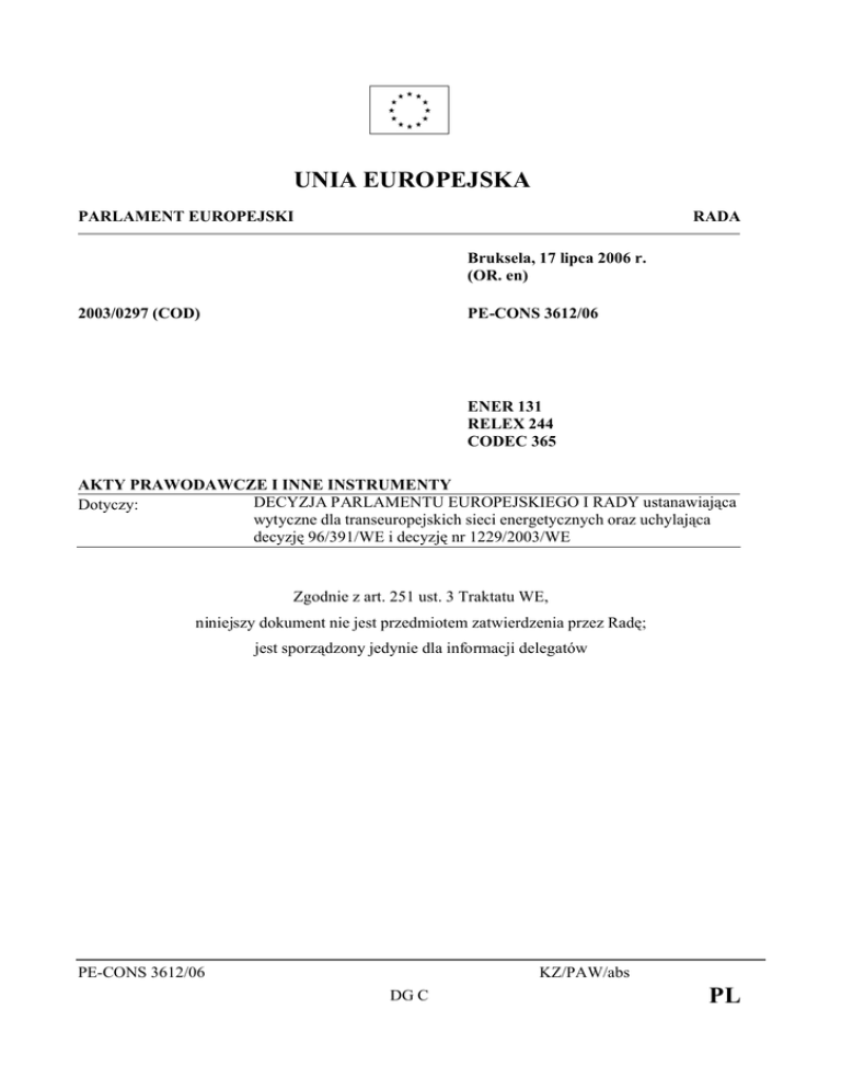 UNIA EUROPEJSKA PARLAMENT EUROPEJSKI RADA Bruksela, 17 lipca 2006 r. (OR. en) 2003/0297 (COD) PE-CONS 3612/06 ENER 131 RELEX 244 CODEC 365 AKTY PRAWODAWCZE I INNE INSTRUMENTY DECYZJA PARLAMENTU EUROPEJSKIEGO I RADY ustanawiająca Dotyczy: wytyczne dla transeuropejskich sieci energetycznych oraz uchylająca decyzję 96/391/WE i decyzję nr 1229/2003/WE Zgodnie z art. 251 ust. 3 Traktatu WE, niniejszy dokument nie jest przedmiotem zatwierdzenia przez Radę; jest sporządzony jedynie dla informacji delegatów PE-CONS 3612/06 KZ/PAW/abs DG C PL DECYZJA NR .../2006/WE PARLAMENTU EUROPEJSKIEGO I RADY z dnia ustanawiająca wytyczne dla transeuropejskich sieci energetycznych oraz uchylająca decyzję 96/391/WE i decyzję nr 1229/2003/WE PARLAMENT EUROPEJSKI I RADA UNII EUROPEJSKIEJ, uwzględniając Traktat ustanawiający Wspólnotę Europejską, w szczególności jego art. 156, uwzględniając wniosek Komisji, uwzględniając opinię Europejskiego Komitetu Ekonomiczno - Społecznego1, po konsultacji z Komitetem Regionów, stanowiąc zgodnie z procedurą określoną w art. 251 Traktatu2, 1 2 Dz.U. C 241 z 28.9.2004, str. 17. Opinia Parlamentu Europejskiego z dnia 7 czerwca 2005 r. (Dz.U. C 124 E z 25.5.2006, str. 68) ). Wspólne stanowisko Rady z dnia 8 grudnia 2005 r. (Dz.U. C 80 E z 4.4.2006, str. 1). Stanowisko Parlamentu Europejskiego z dnia 4 kwietnia 2006 r. PE-CONS 3612/06 KZ/PAW/abs DG C 1 PL a także mając na uwadze, co następuje: (1) Od czasu przyjęcia decyzji nr 1229/2003/WE Parlamentu Europejskiego i Rady z dnia 26 czerwca 2003 r. ustanawiającej zbiór wytycznych dla transeuropejskich sieci energetycznych1 powstała potrzeba pełnego włączenia nowych Państw Członkowskich, państw przystępujących i państw kandydujących do tych wytycznych oraz dostosowania ich, w odpowiednich przypadkach, do nowej polityki bliskości Unii Europejskiej. (2) Priorytety dotyczące transeuropejskich sieci energetycznych wynikają z utworzenia bardziej otwartego i konkurencyjnego wewnętrznego rynku energii, będącego rezultatem wprowadzenia w życie dyrektywy 2003/54/WE Parlamentu Europejskiego i Rady z dnia 26 czerwca 2003 r. dotyczącej wspólnych zasad rynku wewnętrznego energii elektrycznej2 oraz dyrektywy 2003/55/WE Parlamentu Europejskiego i Rady z dnia 26 czerwca 2003 r. dotyczącej wspólnych zasad rynku wewnętrznego gazu ziemnego3. Te priorytety idą w ślad za konkluzjami z posiedzenia Rady Europejskiej w Sztokholmie w dniach 23-24 marca 2001 r. dotyczącego rozwoju infrastruktury niezbędnej do funkcjonowania rynku energii. Należy dołożyć szczególnych starań, aby poprzez realizację celu zwiększonego wykorzystania odnawialnych źródeł energii, przyczyniać się do wspierania polityki zrównoważonego rozwoju. Niemniej jednak cel ten powinien zostać osiągnięty bez stwarzania niewspółmiernych zakłóceń normalnej równowagi rynkowej. Należy również jak najpełniej uwzględnić cele polityki transportowej Wspólnoty, a w szczególności możliwość zmniejszenia ruchu drogowego dzięki zastosowaniu rurociągów. 1 2 3 Dz.U. L 176 z 15.7.2003, str. 11. Dz.U. L 176 z 15.7.2003, str. 37. Dyrektywa zmieniona dyrektywą Rady 2004/85/WE (Dz.U. L 236 z 7.7.2004, str. 10). Dz.U. L 176 z 15.7.2003, str. 57. PE-CONS 3612/06 KZ/PAW/abs DG C 2 PL (3) Niniejsza decyzja służy zbliżeniu się do celu, jakim jest osiągnięcie poziomu międzysystemowych połączeń sieci elektroenergetycznych pomiędzy Państwami Członkowskimi uzgodnionego podczas posiedzenia Rady Europejskiej w Barcelonie w dniach 15 i 16 marca 2002 r., a przez to do poprawy niezawodności i integralności sieci oraz zapewnienia bezpieczeństwa dostaw i należytego funkcjonowania rynku wewnętrznego. (4) Co do zasady, budowa i utrzymanie infrastruktury energetycznej powinny podlegać zasadom rynkowym. Pozostaje to w zgodzie ze wspólnymi zasadami realizacji rynku wewnętrznego energii oraz wspólnymi zasadami w zakresie prawa konkurencji, których celem jest utworzenie bardziej otwartego i konkurencyjnego rynku wewnętrznego energii. Wsparcie finansowe Wspólnoty dla budowy i utrzymania powinno więc mieć miejsce jedynie w szczególnie wyjątkowych przypadkach, zaś wyjątki takie powinny być należycie uzasadnione. (5) Należy stworzyć i utrzymywać infrastrukturę energetyczną umożliwiającą efektywne funkcjonowanie wewnętrznego rynku energii, z uwzględnieniem istniejących procedur konsultowania się z osobami dotkniętymi przez budowę tej infrastruktury, nie wycofując się z kryteriów strategicznych i, w odpowiednich przypadkach, kryteriów dotyczących usług powszechnych oraz zobowiązań z tytułu świadczenia usług publicznych. (6) W świetle potencjalnych synergii pomiędzy sieciami przesyłu gazu ziemnego i gazów olefinowych należy zwrócić należytą uwagę na rozwój i integrację sieci przesyłu gazów olefinowych w celu zaspokojenia zapotrzebowania przemysłu Wspólnoty na te gazy. PE-CONS 3612/06 KZ/PAW/abs DG C 3 PL (7) Priorytety dla transeuropejskich sieci energetycznych wynikają również ze wzrostu znaczenia transeuropejskich sieci energetycznych dla bezpieczeństwa i dywersyfikacji dostaw energii we Wspólnocie, włączenia sieci energetycznych nowych Państw Członkowskich i państw przystępujących i kandydujących, oraz zapewnienia skoordynowanego działania sieci energetycznych we Wspólnocie i w krajach sąsiadujących po konsultacji z zainteresowanymi Państwami Członkowskimi. Kraje sąsiadujące ze Wspólnotą odgrywają istotną rolę w jej polityce energetycznej. Zaspokajają one większą część zapotrzebowania Wspólnoty na gaz ziemny, są kluczowymi partnerami w przesyle energii pierwotnej do Wspólnoty, a także w coraz większym stopniu będą się stawać ważnymi uczestnikami wspólnotowego rynku wewnętrznego gazu ziemnego i energii elektrycznej. (8) Wśród projektów odnoszących się do transeuropejskich sieci energetycznych niezbędne jest wyróżnien