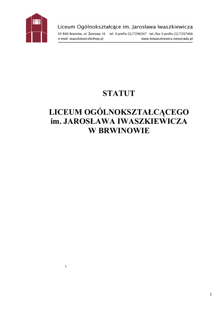 STATUT LICEUM OGÓLNOKSZTAŁCĄCEGO im. JAROSŁAWA IWASZKIEWICZA W BRWINOWIE \ 1 Rozdział I POSTANOWIENIA OGÓLNE 1. 2. 3. 1. 2. § 1. Liceum Ogólnokształcące im. Jarosława Iwaszkiewicza w Brwinowie zwane dalej szkołą jest szkołą ponadgimnazjalną, publiczną o trzyletnim cyklu kształcenia. Siedziba szkoły znajduje się w Brwinowie przy ul. Żwirowej 16. Szkoła nosi imię „Jarosława Iwaszkiewicza” nadane decyzją Kuratorium Oświaty i Wychowania z dnia 20 maja 1981 r. § 2. Organem prowadzącym szkołę jest Burmistrz Gminy Brwinów. Nadzór pedagogiczny nad szkołą sprawuje Mazowiecki Kurator Oświaty. § 3. 1. Szkoła działa na podstawie aktu o Jej utworzeniu, orzeczenia organizacyjnego, ustawy z dnia 7 września 1991 o systemie oświaty i wydanych do niej przepisów wykonawczych oraz niniejszego statutu. 1. 2. 1. 2. 3. 4. 5. § 4. Szkoła zapewnia bezpłatne nauczanie w zakresie ramowych planów nauczania trzyletniego liceum ogólnokształcącego. Szkoła realizuje ustalone przez Ministra Edukacji Narodowej zasady oceniania, klasyfikowania i promowania uczniów. Rozdział II CELE I ZADANIA SZKOŁY § 5. Celem szkoły jest kształcenie i wychowanie młodzieży oraz przygotowanie jej do dalszej nauki w szkołach policealnych i na studiach wyższych. Kształcenie i wychowanie służy rozwijaniu u uczniów poczucia odpowiedzialności, uczy miłości do Ojczyzny oraz poszanowania dla polskiego dziedzictwa kulturowego przy jednoczesnym otwarciu na wartości kulturowe świata. Starając się zapewnić każdemu uczniowi warunki niezbędne dla jego rozwoju, szkoła przygotowuje go do wypełniania obowiązków rodzinnych i obywatelskich w oparciu o zasady demokracji, tolerancji, sprawiedliwości i wolności. Szkoła - przekazuje podstawową wiedzę o człowieku i społeczeństwie, problemach społecznych i ekonomicznych kraju i świata, kulturze, środowisku przyrodniczym i jego ochronie, nauce, technice i pracy, - wyrabia umiejętności rozumnego wykorzystania uzyskanej wiedzy w życiu codziennym, - rozwija indywidualne zainteresowania, - wyrabia wartościowe cechy woli i charakteru, takie jak godność, wrażliwość, odpowiedzialność, wytrwałość, obowiązkowość oraz samodzielność w formułowaniu i rozwiązywaniu problemów i prezentowaniu własnych poglądów, - respektując chrześcijański system wartości uczy kierowania się w postępowaniu uniwersalnymi zasadami etycznymi, - kształtuje nawyki sumiennej pracy, umiejętności jej planowania i organizowania oraz samooceny efektów tej pracy, - uczy zasad higieny i troski o własne zdrowie i kondycję fizyczną. W celu realizacji powyższych zadań szkoła tworzy program wychowawczy i program profilaktyki. 2 6. Liceum realizuje ustalone przez Ministerstwo Edukacji Narodowej podstawy programowe oraz programy własne, dopuszczone przez dyrektora do użytku szkolnego po zaopiniowaniu przez Radę Pedagogiczną 7. Zapewnia uczniom pomoc psychologiczną i pedagogiczną. 8. Zapewnia uczniom pomoc przez prowadzenie preorientacji zawodowej. 9. Organizuje w miarę możliwości zajęcia pozalekcyjne w celu rozwijania zainteresowań uczniów. 10. Sprawuje opiekę nad uczniami w czasie zajęć obowiązkowych, dodatkowych i pozalekcyjnych poprzez: - organizację dyżurów nauczycielskich w szkole, - przestrzeganie odpowiednich przepisów bezpieczeństwa i higieny pracy z młodzieżą, - umożliwia korzystanie z opieki pielęgniarskiej w zakresie bilansu oraz szczepień lekarskich i doraźnej pomocy medycznej 11. Zapewnia w porozumieniu z Poradnią Psychologiczno-Pedagogiczną indywidualne nauczanie młodzieży z zaburzeniami zdrowotnymi. 12. W miarę możliwości finansowych szkoły udziela pomocy w formie stypendiów socjalnych uczniom znajdującym się w trudnych warunkach materialnych. 13. Podejmuje współpracę z rodzicami, organizacjami naukowymi, kulturalnymi i gospodarczymi w celu stworzenia warunków do osiągania wysokich efektów dydaktyczno-wychowawczych i opiekuńczych. § 6. 1. Na życzenie rodziców uczniów Liceum organizuje naukę religii/etyki w wymiarze określonym odrębnymi przepisami. Po osiągnięciu pełnoletności o pobieraniu nauki religii/etyki decydują uczniowie. § 7. 1. Szkoła sprawuje opiekę nad uczniami podczas zajęć: nadobowiązkowych, pozalekcyjnych z uwzględnieniem ogólnie obowiązujących przepisów bezpieczeństwa i higieny pracy. 2. Opieka nad uczniami przebywającymi na wycieczce organizowanej przez szkołę sprawowana jest na podstawie odrębnych przepisów. 3. Podczas przerw międzylekcyjnych uczniowie przebywający w szkole są pod opieką nauczycieli pełniących dyżur zgodnie z ustaleniami dyrektora. Rozdział III ORGANY SZKOŁY I ICH KOMPETENCJE § 8. 1. Organami szkoły są: - Dyrektor, - Rada Pedagogiczna, - Rada Rodziców, - Samorząd Uczniowski. 2. Rada Pedagogiczna, Rada Rodziców oraz Samorząd Uczniowski uchwalają regulaminy swojej działalności, które nie mogą być sprzeczne z przepisami prawa i niniejszym statutem. § 9. 1. Dyrektor szkoły kieruje pracą szkoły i reprezentuje ją na zewnątrz. 2. Do zadań dyrektora szkoły należy w szczególności: 1\ kierowanie bieżącą działalnością dydaktyczno - wychowawczą szkoły, 2\ sprawowanie nadzoru pedagogicznego i przedstawienie Radzie Pedagogicznej, nie rzadziej 3 niż dwa razy w roku, ogólnych wniosków wynikających z tego nadzoru, 3\ sprawowanie opieki nad uczniami oraz stwarzanie warunków sprzyjających ich harmonijnemu rozwojowi psychofizycznemu, poprzez aktywne działania prozdrowotne 4\ realizowanie uchwał Rady Pedagogicznej podjętych zgodnie z jej kompetencjami, 5\ dysponuje środkami określonymi w planie finansowym szkoły zaopiniowanym przez radę pedagogiczną szkoły i ponosi odpowiedzialność za ich prawidłowe wykorzystanie, a także może organizować administracyjną, finansową i gospodarczą obsługę szkoły; 6\ organizowanie pracy administracyjno-gospodarczej placówki, 7\ wykonyw