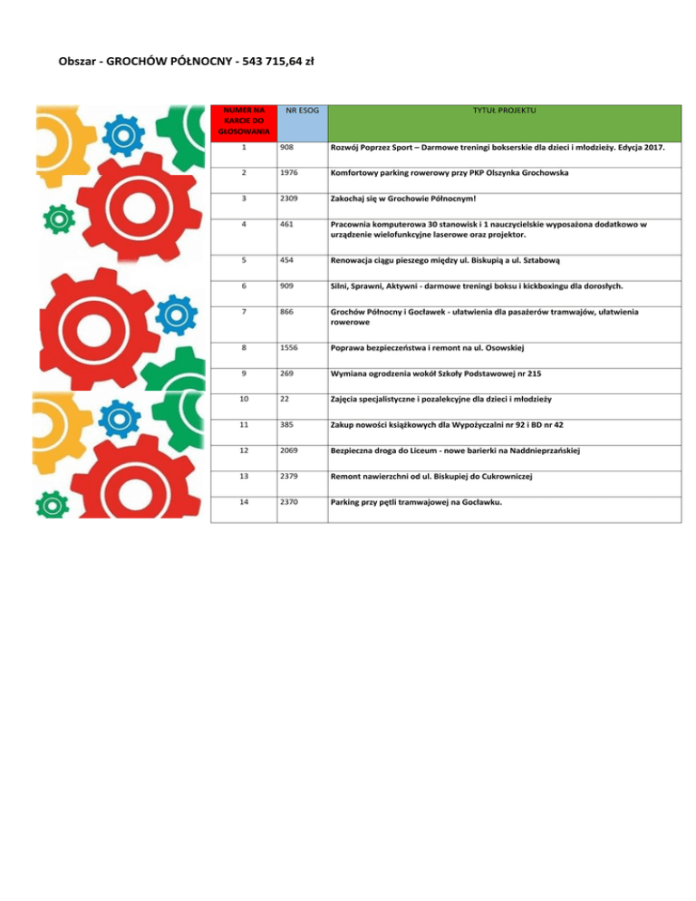 Obszar - GROCHÓW PÓŁNOCNY - 543 715,64 zł NUMER NA KARCIE DO GŁOSOWANIA NR ESOG TYTUŁ PROJEKTU 1 908 Rozwój Poprzez Sport – Darmowe treningi bokserskie dla dzieci i młodzieży. Edycja 2017. 2 1976 Komfortowy parking rowerowy przy PKP Olszynka Grochowska 3 2309 Zakochaj się w Grochowie Północnym! 4 461 Pracownia komputerowa 30 stanowisk i 1 nauczycielskie wyposażona dodatkowo w urządzenie wielofunkcyjne laserowe oraz projektor. 5 454 Renowacja ciągu pieszego między ul. Biskupią a ul. Sztabową 6 909 Silni, Sprawni, Aktywni - darmowe treningi boksu i kickboxingu dla dorosłych. 7 866 Grochów Północny i Gocławek - ułatwienia dla pasażerów tramwajów, ułatwienia rowerowe 8 1556 Poprawa bezpieczeństwa i remont na ul. Osowskiej 9 269 Wymiana ogrodzenia wokół Szkoły Podstawowej nr 215 10 22 Zajęcia specjalistyczne i pozalekcyjne dla dzieci i młodzieży 11 385 Zakup nowości książkowych dla Wypożyczalni nr 92 i BD nr 42 12 2069 Bezpieczna droga do Liceum - nowe barierki na Naddnieprzańskiej 13 2379 Remont nawierzchni od ul. Biskupiej do Cukrowniczej 14 2370 Parking przy pętli tramwajowej na Gocławku.