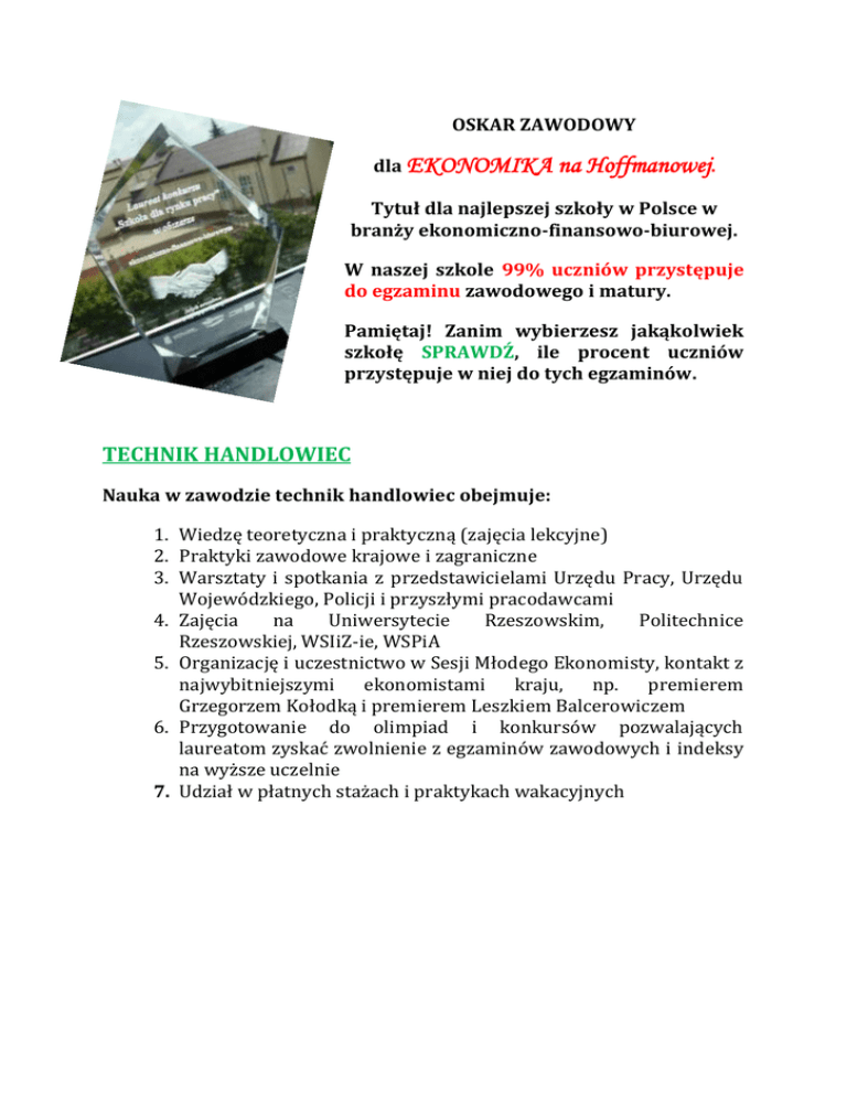 OSKAR ZAWODOWY dla EKONOMIKA na Hoffmanowej. Tytuł dla najlepszej szkoły w Polsce w branży ekonomiczno-finansowo-biurowej. W naszej szkole 99% uczniów przystępuje do egzaminu zawodowego i matury. Pamiętaj! Zanim wybierzesz jakąkolwiek szkołę SPRAWDŹ, ile procent uczniów przystępuje w niej do tych egzaminów. TECHNIK HANDLOWIEC Nauka w zawodzie technik handlowiec obejmuje: 1. Wiedzę teoretyczna i praktyczną (zajęcia lekcyjne) 2. Praktyki zawodowe krajowe i zagraniczne 3. Warsztaty i spotkania z przedstawicielami Urzędu Pracy, Urzędu Wojewódzkiego, Policji i przyszłymi pracodawcami 4. Zajęcia na Uniwersytecie Rzeszowskim, Politechnice Rzeszowskiej, WSIiZ-ie, WSPiA 5. Organizację i uczestnictwo w Sesji Młodego Ekonomisty, kontakt z najwybitniejszymi ekonomistami kraju, np. premierem Grzegorzem Kołodką i premierem Leszkiem Balcerowiczem 6. Przygotowanie do olimpiad i konkursów pozwalających laureatom zyskać zwolnienie z egzaminów zawodowych i indeksy na wyższe uczelnie 7. Udział w płatnych stażach i praktykach wakacyjnych Przedmioty: Towar jako przedmiot handlu, Organizacja i technika sprzedaży, Obsługa klientów, Marketing w działalności handlowej, Przedsiębiorca w handlu, Język obcy w działalności handlowej, Pracownia sprzedaży, Symulacyjna firma handlowa BHP i ergonomia Praktyki zawodowe: Krajowe– w MAKRO Cash and Carry (realizowane od 2007 roku w ramach programu MetroEdukacja) Zagraniczne: w firmach INSIA SK s.r.o., Mobelix i Urzędzie Miasta w Koszycach Zdobędziesz kompetencje przydatne na stanowiskach: Pracownik sprzedaży bezpośredniej Menager Pracownik Public Relations Specjalista ds. marketingu i reklamy Asystent prezesa firmy handlowej Pracownik działu zamówień i sprzedaży Fakturzysta Specjalista ds. handlu Kierownik biura obsługi klienta Przedstawiciel handlowy Specjalista ds. negocjacji handlowych Nie chcesz być pracownikiem, możesz być pracodawcą! Będziesz mógł samodzielnie prowadzić i rozliczać własną firmę handlową! Czego się nauczysz? podstaw marketingu i reklamy zarządzania jednostką handlową; prowadzenia pełnej księgowości handlowej, zakładania własnej firmy i zarządzania nią, prowadzenia handlowej firmy internetowej, identyfikowania zadań instytucji handlowych, obsługi kasy fiskalnej, obsługi informatycznych programów księgowo-handlowych, mikroekonomii i makroekonomii, organizacji sprzedaży zasad współpracy z klientem projektowania hali sprzedażowej Będziesz przygotowany do wykonywania następujących zadań zawodowych: organizowania prac w zakresie przyjmowania dostaw oraz przygotowywania towarów do sprzedaży wykonywania prac związanych z obsługą klientów oraz realizacją transakcji kupna i sprzedaży prowadzenia działań reklamowych i marketingowych organizowania i prowadzenia działalności handlowej zarządzania działalnością handlową przedsiębiorstwa Kończąc klasę handlową uzyskujesz TYTUŁ TECHNIKA HANDLOWCA potwierdzony Dyplomem Potwierdzającym Kwalifikacje Zawodowe (wraz z dwujęzycznym suplementem) uprawniającym Cię do pracy w całej UE Uzyskujesz tytuł technika handlowca Zdajesz maturę identyczną jak w innych technikach Możesz podjąć dowolny kierunek studiów Obowiązuje Cię liczba godzin ogólnokształcących i zawodowych jak w innych klasach Stajesz się fachowcem i kompetentnym pracownikiem ZAPRASZAMY