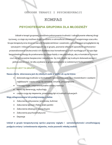 OŚRODEK TERAPII I PSYCHOEDUKACJI KOMPAS PSYCHOTERAPIA GRUPOWA DLA MŁODZIEŻY Udział w terapii grupowej umożliwia pokonywanie trudności i odnajdywanie własnej drogi życiowej, co staje się możliwe dzięki spotkaniu w atmosferze otwartości i wzajemnego szacunku. Grupa terapeutyczna stwarza warunki bezpieczeństwa i uważności, umożliwiające przyglądanie się sytuacjom i relacjom pojawiającym się w grupie, poznania własnych sposobów zachowania i przeanalizowania skuteczności ich działania oraz konsekwencji z nich wynikających. Grupa daje bezpośrednią okazję do przekonania się czego każdy z nas potrzebuje, aby w kontakcie z innymi czuć się jednocześnie bezpiecznie i niezależnie- by móc dzielić się trudnymi doświadczeniami i jednocześnie czuć, że siła uzyskana w grupie pozostanie w codziennym funkcjonowaniu. DLA KOGO JEST TA GRUPA? Nasza oferta skierowana jest do młodych osób w wieku 16-19 lat które: doświadczają trudności w kontaktach i porozumiewaniu się z rówieśnikami i osobami najbliższymi często czują się samotne, smutne, przygnębione miewają nagłe i nieprzewidywalne zmiany nastroju łatwo się denerwują, wybuchają często czują się niepewnie, przeżywają lęk w trudnych sytuacjach Mają zdiagnozowane lub podejrzewają u siebie: Zaburzenia odżywiania ( anorexsia, bulimia) Zaburzenia lękowe ( fobie, ataki paniki) Zaburzenia obsesyjno-kompulsyjne Zaburzenia psychosomatyczne Depresje Udział w grupie terapeutycznej oprócz poprawy wglądu i samoświadomości umożliwiającej podjęcie zmiany i zniwelowanie objawów, może pozwolić młodej osobie: dowiedzieć się więcej o tym, jak postrzegają ją inni oraz jak tworzyć satysfakcjonujące relacje poczuć się swobodniej wśród rówieśników , być bardziej otwartym i pewnym siebie poprawić świadomość własnych uczuć i potrzeb oraz nauczyć się ich konstruktywnego przeżywania i wyrażania radzić sobie w trudnych i konfliktowych sytuacjach bardziej zaufać sobie i innym rozszerzyć możliwości własnego działania i wyborów zbudować niezależność osobistą przy jednoczesnym uwzględnieniu współzależności z innymi PROWADZENIE: Zajęcia będą prowadzone przez dwóch psychoterapeutów: mgr Joanna Albert i mgr Ewelina Rejner TERMINY: Spotkania grupy będą się odbywały się od 27 września do 5 czerwca – we 17.00-19.45. Cykl obejmuje 31 spotkań. wtorki MIEJSCE: Ośrodek Terapii i Psychoedukacji KOMPAS, ul. Modrzejowska 27, Będzin. KOSZT: Płatność obejmuje 5 rat po 360zł (płatne co 6 tygodni). Zapisy do 20.09 !! Warunkiem udziału w zajęciach jest opłacenie pierwszej raty do 20.09.2011 UWAGA !!! Udział w spotkaniach będzie poprzedzony konsultacją z psychologiem/psychiatrą, która pozwoli na zakwalifikowanie do grupy. Konsultacja zawiera rozmowę na temat bieżących problemów i wyznaczenie kierunków, możliwości i celów pracy terapeutycznej. Spotkanie konsultacyjne jest odpłatne – koszt to 50zł. Odbycie konsultacji jest warunkiem udziału w grupie. Czas trwania konsultacji to 45 minut. LICZBA UCZESTNIKÓW: 8-12 osób KONTAKT I ZAPISY: Osobiście w siedzibie Ośrodka lub pod numerami telefonu: 698 44 34 24, (32) 730 04 44. Warunkiem uczestnictwa w grupie jest zgłoszenie swojego udziału telefonicznie lub w siedzibie Ośrodka. Zapraszamy Cię do udziału! O uczestnictwie decyduje kolejność zapisów i dokonywania wpłat. Nr konta: ING Bank Śląski 40105013601000002322025418.