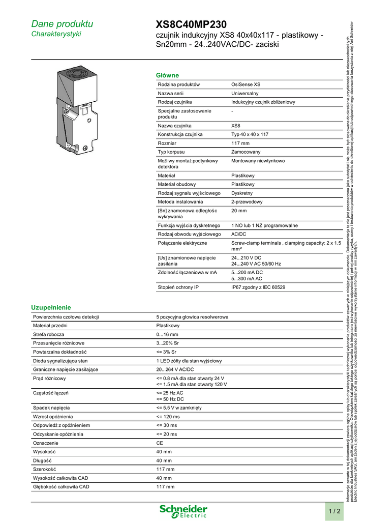 XS8C40MP230 Charakterystyki czujnik indukcyjny XS8 40x40x117 - plastikowy Sn20mm - 24..240VAC/DC- zaciski Główne Rodzina produktów OsiSense XS Nazwa serii Uniwersalny Rodzaj czujnika Indukcyjny czujnik zbliżeniowy Specjalne zastosowanie produktu - Nazwa czujnika XS8 Konstrukcja czujnika Typ 40 x 40 x 117 Rozmiar 117 mm Typ korpusu Zamocowany Możliwy montaż podtynkowy detektora Montowany niewtynkowo Materiał Plastikowy Materiał obudowy Plastikowy Rodzaj sygnału wyjściowego Dyskretny Metoda instalowania 2-przewodowy [Sn] znamonowa odległośc wykrywania 20 mm Funkcja wyjścia dyskretnego 1 NO lub 1 NZ programowalne Rodzaj obwodu wyjściowego AC/DC Połączenie elektryczne Screw-clamp terminals , clamping capacity: 2 x 1.5 mm² [Us] znamionowe napięcie zasilania 24...210 V DC 24...240 V AC 50/60 Hz Zdolność łączeniowa w mA 5...200 mA DC 5...300 mA AC Stopień ochrony IP IP67 zgodny z IEC 60529 Uzupełnienie Powierzchnia czołowa detekcji 5 pozycyjna głowica resolwerowa Materiał przedni Plastikowy Strefa robocza 0...16 mm Przesunięcie różnicowe 3...20% Sr Powtarzalna dokładność <= 3% Sr Dioda sygnalizująca stan 1 LED żółty dla stan wyjściowy Graniczne napięcie zasilające 20...264 V AC/DC Prąd różnicowy <= 0.8 mA dla stan otwarty 24 V <= 1.5 mA dla stan otwarty 120 V Częstość łączeń <= 25 Hz AC <= 50 Hz DC Spadek napięcia <= 5.5 V w zamknięty Wzrost opóźnienia <= 120 ms Odpowiedź z opóźnieniem <= 30 ms Odzyskanie opóźnienia <= 20 ms Oznaczenie CE Wysokość 40 mm Długość 40 mm Szerokość 117 mm Wysokość całkowita CAD 40 mm Głębokość całkowita CAD 117 mm 1/2 Informacje zawarte w tej dokumentacji zawiera ogólne opisy lub charakterystyki technicznej wykonania produktów zawartych w niniejszym dokumencie. Dokumentacja ta nie jest przeznaczona jako substytut i nie może być stosowana do określenia przydatności lub niezawodności tych produktów dla konkretnych aplikacji użytkownika. Obowiązkiem każdego takiego użytkownika lub integratora jest wykonanie odpowiedniej i pełnej analizy ryzyka, oceny i testowania produktów w odniesieniu do określonej aplikacji lub odpowiedniego stosowania korzystania z niej .Ani Schneider Electric Industries SAS, ani żaden z jej oddziałów lub spółek zależnych są ponosi odpowiedzialności za niewłaściwe wykorzystanie informacji w nim zawartych. Dane produktu Środowisko Certyfikacja produktu CCC CSA UL Temepratura otoczenia dla pracy -25...70 °C 2/2