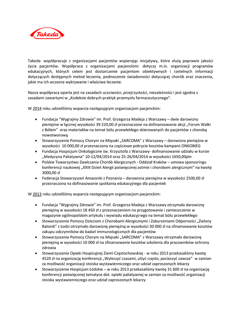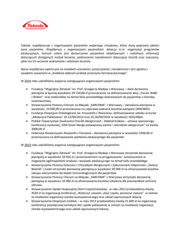 Takeda współpracuje z organizacjami pacjentów wspierając inicjatywy, które służą poprawie jakości życia pacjentów. Współpraca z organizacjami pacjenckimi dotyczy m.in. organizacji programów edukacyjnych, których celem jest dostarczenie pacjentom obiektywnych i rzetelnych informacji dotyczących dostępnych metod leczenia, podnoszenie świadomości dotyczącej chorób oraz znaczenia, jakie ma ich wczesne wykrywanie i właściwe leczenie. Nasza współpraca oparta jest na zasadach uczciwości, przejrzystości, niezależności i jest zgodna z zasadami zawartymi w „Kodeksie dobrych praktyk przemysłu farmaceutycznego”. W 2014 roku udzieliliśmy wsparcia następującym organizacjom pacjenckim: Fundacja “Wygrajmy Zdrowie” im. Prof. Grzegorza Madeja z Warszawy – dwie darowizny pieniężne w łącznej wysokości 39 220,00 zł przeznaczone na dofinansowanie akcji „Forum Walki z Bólem” oraz materiałów na temat bólu przewlekłego skierowanych do pacjentów z chorobą nowotworową Stowarzyszenie Pomocy Chorym na Mięsaki „SARCOMA” z Warszawy – darowizna pieniężna w wysokości 10 000,00 zł przeznaczona na częściowe pokrycie kosztów kampanii ONKOBIEG Fundacja Hospicjum Onkologiczne św. Krzysztofa z Warszawy- dofinansowanie udziału w kursie „Medycyna Paliatywna” 10-12/04/2014 oraz 25-26/04/2014 w wysokości 1650,00pln Polskie Towarzystwo Zwalczania Chorób Alergicznych - Oddział Kraków – umowa sponsoringu konferencji naukowej „XXIII Dzień Alergii poświęconej astmie i chorobom alergicznym” na kwotę 3000,00 zł Federacja Stowarzyszeń Amazonki z Poznania – darowizna pieniężna w wysokości 2500,00 zł przeznaczona na dofinasowanie spotkania edukacyjnego dla pacjentek W 2013 roku udzieliliśmy wsparcia następującym organizacjom pacjenckim: Fundacja “Wygrajmy Zdrowie” im. Prof. Grzegorza Madeja z Warszawy otrzymała darowiznę pieniężną w wysokości 18 450 zł z przeznaczeniem na przygotowanie i zamieszczenie w magazynie ogólnopolskim artykułu i wywiadu edukacyjnego na temat bólu przewlekłego Stowarzyszenie Pomocy Dzieciom z Chorobami Alergicznymi i Zaburzeniami Odporności „Zielony Balonik” z Łodzi otrzymało darowiznę pieniężną w wysokości 30 000 zł na sfinansowanie kosztów zakupu odczynników do badań immunologicznych dla pacjentów Stowarzyszenie Pomocy Chorym na Mięsaki „SARCOMA” z Warszawy otrzymało darowiznę pieniężną w wysokości 10 000 zł na sfinansowanie kosztów szkolenia dla pracowników ochrony zdrowia Stowarzyszenie Opieki Hospicyjnej Ziemi Częstochowskiej - w roku 2013 przekazaliśmy kwotę 4520 zł na organizację konferencji „Wyleczyć czasami, ulżyć często, pocieszyć zawsze” w zamian za możliwość organizacji stoiska wystawienniczego oraz udział zaproszonych lekarzy Stowarzyszenie Hospicjum Łódzkie – w roku 2013 przekazaliśmy kwotę 31 600 zł na organizację konferencji poświęconej tematyce dot. opieki paliatywnej w zamian za możliwość organizacji stoiska wystawienniczego oraz udział zaproszonych lekarzy. Fundacja Hospicjum Onkologiczne św. Krzysztofa z Warszawy - w roku 2013 zapłaciliśmy kwotę 2000 zł za możliwość organizacji stoiska wystawienniczego podczas trwania kursu „Medycyna Paliatywna”. Polskie Towarzystwo Zwalczania Chorób Alergicznych Oddział Kraków – w roku 2013 zapłaciliśmy kwotę 3000 zł w zamian za możliwość przeprowadzenia wykładu oraz organizacji stoiska podczas trwania konferencji naukowej XXII Dzień Alergii poświęconej astmie i chorobom alergicznym. W 2012 roku wsparcie od naszej firmy uzyskały następujące organizacje pacjenckie: Towarzystwo Przyjaciół Chorych na Astmę otrzymało darowiznę pieniężną w wysokości 5000 zł z przeznaczeniem na organizację programu edukacyjnego dla pacjentów chorych na astmę. Polskie Towarzystwo Zwalczania Chorób Alergicznych - Oddział Kraków – przekazaliśmy kwotę 3000 zł w na organizację konferencji naukowej XXI Dzień Alergii poświęconej astmie i chorobom alergicznym w zamian za możliwość przeprowadzenia wykładu oraz stoiska podczas trwania konferencji dla lekarzy. Stowarzyszenie Hospicjum Łódzkie – wpłaciliśmy kwotę 400 zł na rzecz Stowarzyszenia w zamian za udział lekarza w kursie „Ból i objawy somatyczne” organizowanym przez Stowarzyszenie. Stowarzyszenie Opieki Hospicyjnej Ziemi Częstochowskie j- przekazaliśmy kwotę 7450 zł na rzecz Stowarzyszenia w zamian za udział lekarzy w szkoleniu organizowanym przez Stowarzyszenie pt. „Praktyka w opiece paliatywnej wyrazem uczuć, troski i empatii” oraz za możliwość organizacji stoiska podczas tego wydarzenia naukowego.