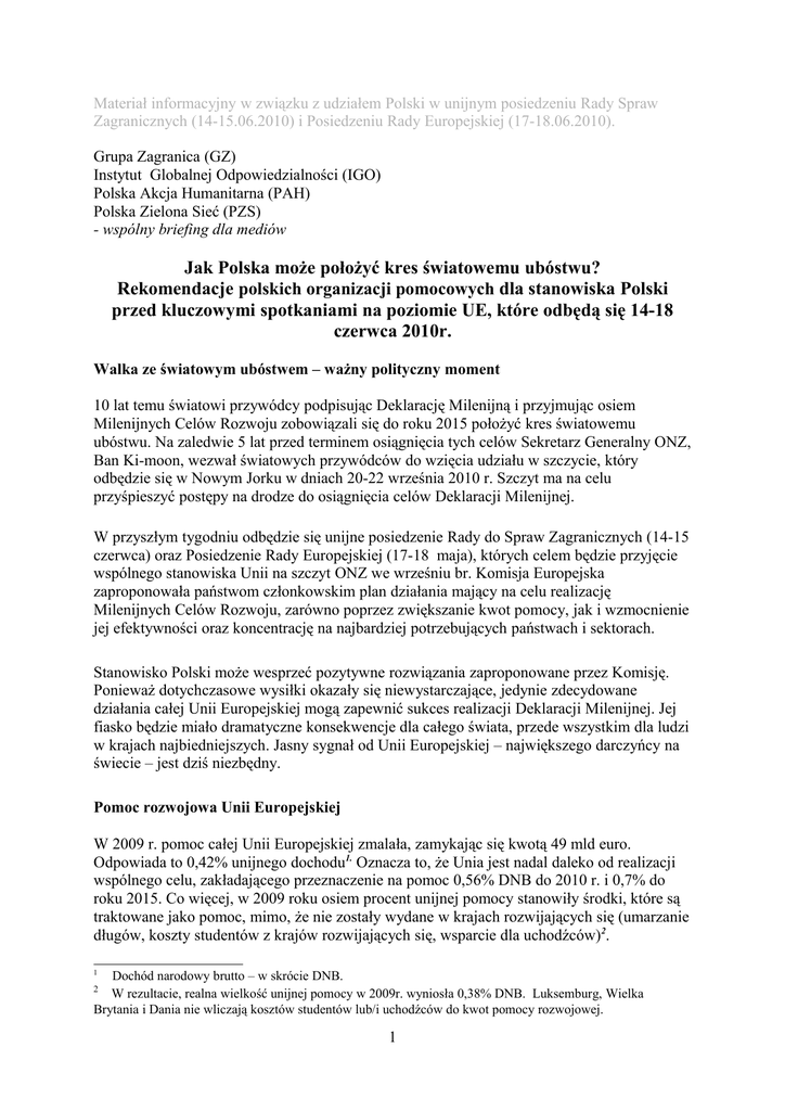 Materiał informacyjny w związku z udziałem Polski w unijnym posiedzeniu Rady Spraw Zagranicznych (14-15.06.2010) i Posiedzeniu Rady Europejskiej (17-18.06.2010). Grupa Zagranica (GZ) Instytut Globalnej Odpowiedzialności (IGO) Polska Akcja Humanitarna (PAH) Polska Zielona Sieć (PZS) - wspólny briefing dla mediów Jak Polska może położyć kres światowemu ubóstwu? Rekomendacje polskich organizacji pomocowych dla stanowiska Polski przed kluczowymi spotkaniami na poziomie UE, które odbędą się 14-18 czerwca 2010r. Walka ze światowym ubóstwem – ważny polityczny moment 10 lat temu światowi przywódcy podpisując Deklarację Milenijną i przyjmując osiem Milenijnych Celów Rozwoju zobowiązali się do roku 2015 położyć kres światowemu ubóstwu. Na zaledwie 5 lat przed terminem osiągnięcia tych celów Sekretarz Generalny ONZ, Ban Ki-moon, wezwał światowych przywódców do wzięcia udziału w szczycie, który odbędzie się w Nowym Jorku w dniach 20-22 września 2010 r. Szczyt ma na celu przyśpieszyć postępy na drodze do osiągnięcia celów Deklaracji Milenijnej. W przyszłym tygodniu odbędzie się unijne posiedzenie Rady do Spraw Zagranicznych (14-15 czerwca) oraz Posiedzenie Rady Europejskiej (17-18 maja), których celem będzie przyjęcie wspólnego stanowiska Unii na szczyt ONZ we wrześniu br. Komisja Europejska zaproponowała państwom członkowskim plan działania mający na celu realizację Milenijnych Celów Rozwoju, zarówno poprzez zwiększanie kwot pomocy, jak i wzmocnienie jej efektywności oraz koncentrację na najbardziej potrzebujących państwach i sektorach. Stanowisko Polski może wesprzeć pozytywne rozwiązania zaproponowane przez Komisję. Ponieważ dotychczasowe wysiłki okazały się niewystarczające, jedynie zdecydowane działania całej Unii Europejskiej mogą zapewnić sukces realizacji Deklaracji Milenijnej. Jej fiasko będzie miało dramatyczne konsekwencje dla całego świata, przede wszystkim dla ludzi w krajach najbiedniejszych. Jasny sygnał od Unii Europejskiej – największego darczyńcy na świecie – jest dziś niezbędny. Pomoc rozwojowa Unii Europejskiej W 2009 r. pomoc całej Unii Europejskiej zmalała, zamykając się kwotą 49 mld euro. Odpowiada to 0,42% unijnego dochodu1. Oznacza to, że Unia jest nadal daleko od realizacji wspólnego celu, zakładającego przeznaczenie na pomoc 0,56% DNB do 2010 r. i 0,7% do roku 2015. Co więcej, w 2009 roku osiem procent unijnej pomocy stanowiły środki, które są traktowane jako pomoc, mimo, że nie zostały wydane w krajach rozwijających się (umarzanie długów, koszty studentów z krajów rozwijających się, wsparcie dla uchodźców)2. 1 Dochód narodowy brutto – w skrócie DNB. W rezultacie, realna wielkość unijnej pomocy w 2009r. wyniosła 0,38% DNB. Luksemburg, Wielka Brytania i Dania nie wliczają kosztów studentów lub/i uchodźców do kwot pomocy rozwojowej. 2 1 Materiał informacyjny w związku z udziałem Polski w unijnym posiedzeniu Rady Spraw Zagranicznych (14-15.06.2010) i Posiedzeniu Rady Europejskiej (17-18.06.2010). Zgodnie z dostępnymi szacunkami, w 2010 r. unijna pomoc wyniesie ok. 0,46% DNB, czyli o 0,1% DNB mniej i tym samym o ok. 11 miliardów euro mniej, niż zadeklarowała Unia Europejska. Nie ma wątpliwości co do tego, że temat walki z ubóstwem musi zyskać na forum UE większy priorytet. Od tego zależy wiarygodność na arenie międzynarodowej zarówno Komisji Europejskiej, jak i państw członkowskich. Jak stanowisko Polski na forum UE może pomóc w walce z ubóstwem na świecie? Wielkość pomocy • Komisja Europejska zachęca, by przed szczytem ONZ we wrześniu 2010 r., państwa członkowskie ustanowiły realistyczne roczne harmonogramy pokazujące, ile pieniędzy rocznie przeznaczać będą na pomoc. To pozwoliłoby dopilnować, by wysiłek jednych krajów członkowskich nie został zaprzepaszczony przez brak działań innych państw. Dodatkowo, reputacja największego darczyńcy na świecie i wiarygodność obietnic danych przez kraje UE3, zostałyby zachowane. Harmonogramy te powinny być nie tylko realistyczne, ale też prawnie wiążące, jeśli szczerze planujemy zwiększyć wysiłek na rzecz walki z ubóstwem. Polska powinna wesprzeć propozycję Komisji Europejskiej, i do końca sierpnia stworzyć realistyczny i prawnie wiążący harmonogram wielkości środków na pomoc na lata 2011-2015. • Komisja Europejska zachęca do wdrożenia mechanizmu systematycznego przeglądu pomocy rozwojowej świadczonej przez kraje UE. Przewodzić temu procesowi miałaby Rada Europejska, niemniej ważna jest w nim rola Parlamentu Europejskiego. Polska powinna jasno opowiedzieć się za tym rozwiązaniem, bo pozwoliłoby ono na systematyczną ewaluację i zwiększanie skuteczności podejmowanych działań. Polska, jako stosunkowo nowy darczyńca, mogłaby również wykorzystać proces przeglądu i w jego ramach uczyć się od bardziej doświadczonych członków UE. • Unia Europejska powinna przygotować innowacyjny mechanizm finansowania pomocy – podatek od transakcji finansowych. Przychody pochodzące z tego podatku mogą wynieść rocznie od 215 miliardów do nawet 1 biliona euro – bez obciążeń dla unijnego podatnika. Polska powinna pozytywnie odnieść się do tego pomysłu na forum UE. • Polska powinna przestać zaliczać koszty studentów, uchodźców, a także umorzenia długów do puli oficjalnej pomocy rozwojowej, a także poprzeć wdrożenie tego rozwiązania na poziomie pomocy świadczonej przez Komisję Europejską. 3 0,33% DNB w 2015r. przeznaczać mają na pomoc nowe państwa członkowskie, 0,7% DNB pozostałe państwa UE, natomiast państwa członkowskie, których pomoc wynosi już 0,7% DNB, zobowiązują się utrzymać ją na obecnym poziomie. 2 Materiał informacyjny w związku z udziałem Polski w unijnym posiedzeniu Rady Spraw Zagranicznych (14-15.06.2010) i Posiedzeniu Rady Europejskiej (17-18.06.2010). Skutecznoś