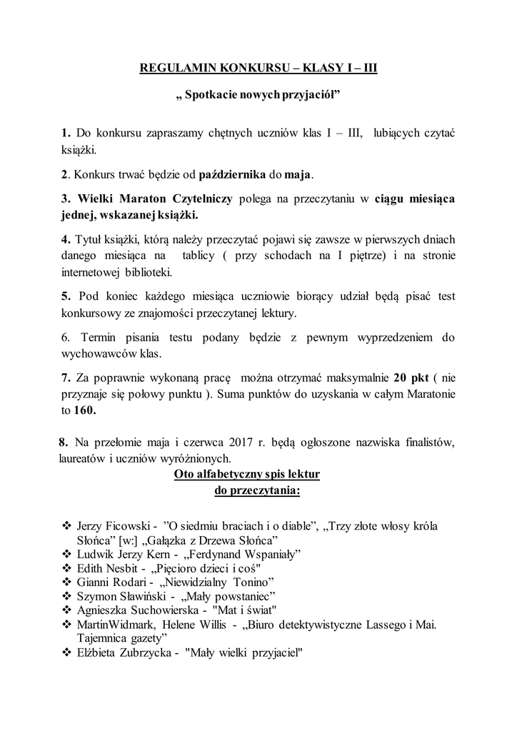 REGULAMIN KONKURSU – KLASY I – III „ Spotkacie nowych przyjaciół” 1. Do konkursu zapraszamy chętnych uczniów klas I – III, lubiących czytać książki. 2. Konkurs trwać będzie od października do maja. 3. Wielki Maraton Czytelniczy polega na przeczytaniu w ciągu miesiąca jednej, wskazanej książki. 4. Tytuł książki, którą należy przeczytać pojawi się zawsze w pierwszych dniach danego miesiąca na tablicy ( przy schodach na I piętrze) i na stronie internetowej biblioteki. 5. Pod koniec każdego miesiąca uczniowie biorący udział będą pisać test konkursowy ze znajomości przeczytanej lektury. 6. Termin pisania testu podany będzie z pewnym wyprzedzeniem do wychowawców klas. 7. Za poprawnie wykonaną pracę można otrzymać maksymalnie 20 pkt ( nie przyznaje się połowy punktu ). Suma punktów do uzyskania w całym Maratonie to 160. 8. Na przełomie maja i czerwca 2017 r. będą ogłoszone nazwiska finalistów, laureatów i uczniów wyróżnionych. Oto alfabetyczny spis lektur do przeczytania: Jerzy Ficowski - ”O siedmiu braciach i o diable”, „Trzy złote włosy króla Słońca” [w:] „Gałązka z Drzewa Słońca” Ludwik Jerzy Kern - „Ferdynand Wspaniały” Edith Nesbit - „Pięcioro dzieci i coś" Gianni Rodari - „Niewidzialny Tonino” Szymon Sławiński - „Mały powstaniec” Agnieszka Suchowierska - "Mat i świat" MartinWidmark, Helene Willis - „Biuro detektywistyczne Lassego i Mai. Tajemnica gazety” Elżbieta Zubrzycka - "Mały wielki przyjaciel" LEKTURA NA WRZESIEŃ DO PRZECZYTANIA: MartinWidmark, Helene Willis – „Biuro detektywistyczne Lassego i Mai. Tajemnica gazety” Informujemy, że biblioteka szkolna dysponuje niewielką ilością z każdego tytułu lub nie posiadamy książki w księgozbiorze. Prosimy zatem rodziców o pomoc w pozyskiwaniu książek. REGULAMIN KONKURSU – KLASY IV – VI „ Czytanie rozwija, czytanie wzbogaca” 1. Do konkursu zapraszamy chętnych uczniów klas IV – VI, lubiących czytać książki. 2. Konkurs trwać będzie od października do maja. 3. Wielki Maraton Czytelniczy polega na przeczytaniu w ciągu miesiąca jednej, wskazanej książki. 4. Tytuł książki, którą należy przeczytać pojawi się zawsze na tablicy ( obok biblioteki ) w pierwszych dniach danego miesiąca. 5. Pod koniec każdego miesiąca uczniowie biorący udział będą pisać test konkursowy ze znajomości przeczytanej lektury. 6. Terminy pisania testów podane będą na tablicy oraz na stronie internetowej biblioteki. 7. Uczniowie biorący udział muszą w podanym terminie zgłosić się do czytelni w celu wypełnienia testu. 8. Za poprawnie wykonaną pracę można otrzymać maksymalnie 20 pkt ( nie przyznaje się połowy punktu ) Suma punktów do uzyskania w całym Maratonie to 160. 9. Na przełomie maja i czerwca 2017 r. będą ogłoszone nazwiska finalistów, laureatów i uczniów wyróżnionych. 10.Wyniki, które uzyskają uczniowie w poszczególnych testach zamieścimy na tablicy i na stronie internetowej biblioteki. Oto alfabetyczny spis lektur do przeczytania: Czerwińska – Rydel Anna - „Kryształowe odkrycie. Powieść o Janie Czochralskim” Grahame Keneth – „O czym szumią wierzby” Kosmowska Barbara – „Kolorowy szalik” Łuszczewska Jadwiga ( Deotyma ) – „Panienka z okienka” Maleszka Andrzej – „ Magiczne drzewo. Świat ogromnych” Twain Mark – „ Królewicz i żebrak” Walliams David – „ Babcia rabuś” Wieczorek Dorota – „ Strachopolis” LEKTURA NA WRZESIEŃ DO PRZECZYTANIA: Mark Twain - „ Królewicz i żebrak” Informujemy, że biblioteka szkolna dysponuje niewielką ilością z każdego tytułu lub nie posiadamy książki w księgozbiorze. Prosimy zatem rodziców o pomoc w pozyskiwaniu książek. Szkolni koordynatorzy Maratonu Klasy I – III Anna Romanowska Bożena Żurawska Klasy IV – VI Sylwia Chmarzyńska Mariola Wrońska