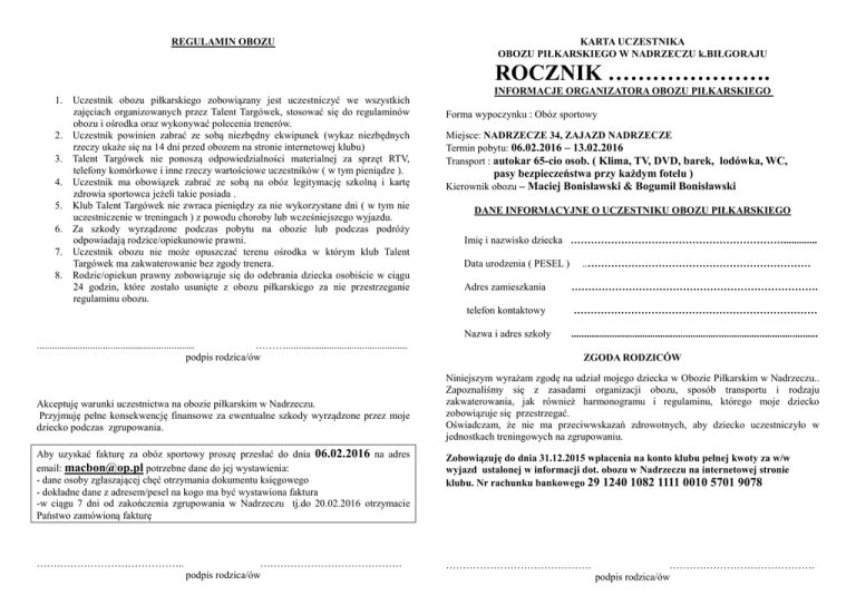 REGULAMIN OBOZU KARTA UCZESTNIKA OBOZU PIŁKARSKIEGO W NADRZECZU k.BIŁGORAJU ROCZNIK …………………. 1. Uczestnik obozu piłkarskiego zobowiązany jest uczestniczyć we wszystkich zajęciach organizowanych przez Talent Targówek, stosować się do regulaminów obozu i ośrodka oraz wykonywać polecenia trenerów. 2. Uczestnik powinien zabrać ze sobą niezbędny ekwipunek (wykaz niezbędnych rzeczy ukaże się na 14 dni przed obozem na stronie internetowej klubu) 3. Talent Targówek nie ponoszą odpowiedzialności materialnej za sprzęt RTV, telefony komórkowe i inne rzeczy wartościowe uczestników ( w tym pieniądze ). 4. Uczestnik ma obowiązek zabrać ze sobą na obóz legitymację szkolną i kartę zdrowia sportowca jeżeli takie posiada . 5. Klub Talent Targówek nie zwraca pieniędzy za nie wykorzystane dni ( w tym nie uczestniczenie w treningach ) z powodu choroby lub wcześniejszego wyjazdu. 6. Za szkody wyrządzone podczas pobytu na obozie lub podczas podróży odpowiadają rodzice/opiekunowie prawni. 7. Uczestnik obozu nie może opuszczać terenu ośrodka w którym klub Talent Targówek ma zakwaterowanie bez zgody trenera. 8. Rodzic/opiekun prawny zobowiązuje się do odebrania dziecka osobiście w ciągu 24 godzin, które zostało usunięte z obozu piłkarskiego za nie przestrzeganie regulaminu obozu. .............................................................. ………................................................ podpis rodzica/ów Akceptuję warunki uczestnictwa na obozie piłkarskim w Nadrzeczu. Przyjmuję pełne konsekwencję finansowe za ewentualne szkody wyrządzone przez moje dziecko podczas zgrupowania. INFORMACJE ORGANIZATORA OBOZU PIŁKARSKIEGO Forma wypoczynku : Obóz sportowy Miejsce: NADRZECZE 34, ZAJAZD NADRZECZE Termin pobytu: 06.02.2016 – 13.02.2016 Transport : autokar 65-cio osob. ( Klima, TV, DVD, barek, lodówka, WC, pasy bezpieczeństwa przy każdym fotelu ) Kierownik obozu – Maciej Bonisławski & Bogumił Bonisławski DANE INFORMACYJNE O UCZESTNIKU OBOZU PIŁKARSKIEGO Imię i nazwisko dziecka ………………………………………………………............. Data urodzenia ( PESEL ) ..………………………………………………………… Adres zamieszkania ………………………………………………………………. telefon kontaktowy ……………………………………………………………… Nazwa i adres szkoły ................................................................................................. ZGODA RODZICÓW Niniejszym wyrażam zgodę na udział mojego dziecka w Obozie Piłkarskim w Nadrzeczu.. Zapoznaliśmy się z zasadami organizacji obozu, sposób transportu i rodzaju zakwaterowania, jak również harmonogramu i regulaminu, którego moje dziecko zobowiązuje się przestrzegać. Oświadczam, że nie ma przeciwwskazań zdrowotnych, aby dziecko uczestniczyło w jednostkach treningowych na zgrupowaniu. Aby uzyskać fakturę za obóz sportowy proszę przesłać do dnia 06.02.2016 na adres email: [email protected] potrzebne dane do jej wystawienia: - dane osoby zgłaszającej chęć otrzymania dokumentu księgowego - dokładne dane z adresem/pesel na kogo ma być wystawiona faktura -w ciągu 7 dni od zakończenia zgrupowania w Nadrzeczu tj.do 20.02.2016 otrzymacie Państwo zamówioną fakturę Zobowiązuję do dnia 31.12.2015 wpłacenia na konto klubu pełnej kwoty za w/w wyjazd ustalonej w informacji dot. obozu w Nadrzeczu na internetowej stronie klubu. Nr rachunku bankowego 29 1240 1082 1111 0010 5701 9078 …………………………………….. ……………………………………. …………………………………… podpis rodzica/ów ……………………………………. podpis rodzica/ów INFORMACJA RODZICÓW (OPIEKUNÓW) O STANIE ZDROWIA DZIECKA INFORMACJA RODZICÓW O DZIECKU 1. Imię i nazwisko dziecka ............................................................................................... ........ 2. Przebyte choroby zakaźne (podać, w którym roku życia, lub wpisać „nie”) : ……………………………………………………………………………………………….. …..…………………………………………………………………………………………… ……………………………………………………………………………………………….. 3. U dziecka występowały w ostatnim roku lub występują obecnie (*właściwe podkreślić): Drgawki, utraty przytomności, zaburzenia równowagi, omdlenia, częste bóle głowy, lęki nocne, trudności w zasypianiu, tiki, moczenia nocne, częste bóle brzucha, wymioty, krwawienia z nosa, przewlekły kaszel, (lub katar, anginy), duszność, bóle stawów, szybkie męczenie się, niedosłuch, inne ................................................................................................. 4. Dziecko jest *: nieśmiałe, ma trudności w nawiązywaniu kontaktów, nadpobudliwe, inne informacje o usposobieniu i zachowaniu dziecka. 5. Dziecko jest uczulone * : tak, nie, jeśli tak podać na co ...................................................... .................................................................................................................................................. 6. Dziecko nosi* : okulary, aparat ortodontyczny, wkładki ortopedyczne, inne aparaty ................................................................................................................................... 7. Jazdę samochodem znosi * : dobrze, źle. 8. Inne uwagi o zdrowiu dziecka ............................................................................................. ………………………………………………………………………………………………. 9.Wyrażamy zgodę na hospitalizację, leczenie lub zabiegi operacyjne w przypadku nieszczęśliwego wypadku naszego dziecka. W razie zagrożenia życ