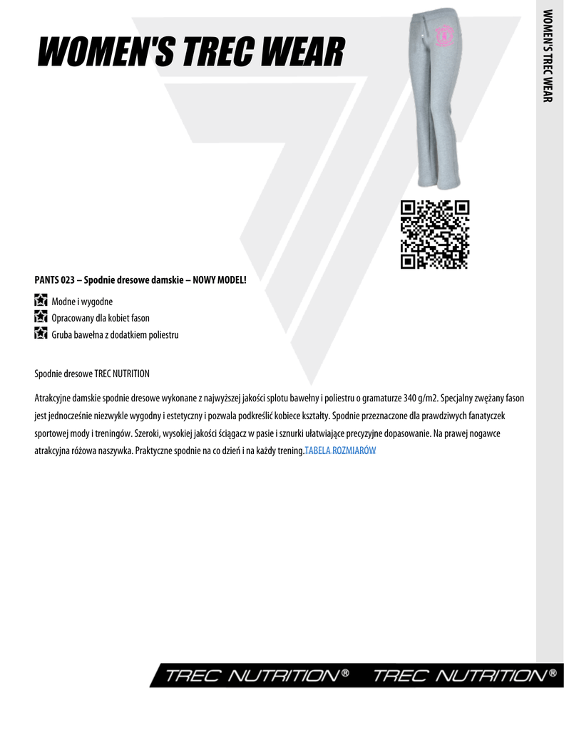 PANTS 023 – Spodnie dresowe damskie – NOWY MODEL! Modne i wygodne Opracowany dla kobiet fason Gruba bawełna z dodatkiem poliestru Spodnie dresowe TREC NUTRITION Atrakcyjne damskie spodnie dresowe wykonane z najwyższej jakości splotu bawełny i poliestru o gramaturze 340 g/m2. Specjalny zwężany fason jest jednocześnie niezwykle wygodny i estetyczny i pozwala podkreślić kobiece kształty. Spodnie przeznaczone dla prawdziwych fanatyczek sportowej mody i treningów. Szeroki, wysokiej jakości ściągacz w pasie i sznurki ułatwiające precyzyjne dopasowanie. Na prawej nogawce atrakcyjna różowa naszywka. Praktyczne spodnie na co dzień i na każdy trening.TABELA ROZMIARÓW WOMEN'S TREC WEAR WOMEN'S TREC WEAR