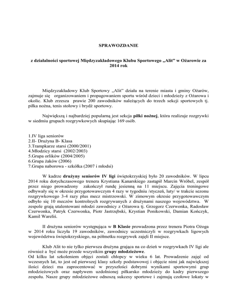 SPRAWOZDANIE z działalności sportowej Międzyzakładowego Klubu Sportowego „Alit” w Ożarowie za 2014 rok Międzyzakładowy Klub Sportowy „Alit” działa na terenie miasta i gminy Ożarów, zajmuje się organizowaniem i propagowaniem sportu wśród dzieci i młodzieży z Ożarowa i okolic. Klub zrzesza prawie 200 zawodników należących do trzech sekcji sportowych tj. piłka nożna, tenis stołowy i brydż sportowy. Największą i najbardziej popularną jest sekcja piłki nożnej, która realizuje rozgrywki w siedmiu grupach rozgrywkowych skupiając 169 osób. 1.IV liga seniorów 2.II- Drużyna B- Klasa 3.Trampkarze starsi (2000/2001) 4.Młodzicy starsi (2002/2003) 5.Grupa orlików (2004/2005) 6.Grupa żaków (2006) 7.Grupa naborowa - szkółka (2007 i młodsi) W kadrze drużyny seniorów IV ligi świętokrzyskiej było 20 zawodników. W lipcu 2014 roku dotychczasowego trenera Krystiana Kanarskiego zastąpił Marcin Wróbel, zespół przez niego prowadzony zakończył rundę jesienną na 11 miejscu. Zajęcia treningowe odbywały się w okresie przygotowawczym 4 razy w tygodniu /styczeń, luty/ w trakcie sezonu rozgrywkowego 3-4 razy plus mecz mistrzowski. W zimowym okresie przygotowawczym odbyło się 10 meczów kontrolnych rozgrywanych z drużynami naszego województwa. W zespole grają utalentowani młodzi zawodnicy z Ożarowa tj. Grzegorz Czerwonka, Radosław Czerwonka, Patryk Czerwonka, Piotr Jastrzębski, Krystian Ponikowski, Damian Kończyk, Kamil Wareliś. II drużyna seniorów występująca w B Klasie prowadzona przez trenera Piotra Ożoga w 2014 roku liczyła 19 zawodników, zawodnicy uczestniczyli w rozgrywkach ligowych województwa świętokrzyskiego, na półmetku rozgrywek zajęli II miejsce. Klub Alit to nie tylko pierwsza drużyna grająca na co dzień w rozgrywkach IV ligi ale również a być może przede wszystkim grupy młodzieżowe. Od kilku lat szkoleniem objęci zostali chłopcy w wieku 6 lat. Prowadzenie zajęć od wczesnych lat, to jest od pierwszej klasy szkoły podstawowej i objęcie nimi jak największej ilości dzieci ma zaprocentować w przyszłości dobrymi wynikami sportowymi grup młodzieżowych oraz napływem uzdolnionej piłkarsko młodzieży do kadry pierwszego zespołu. Nasze grupy młodzieżowe odnoszą sukcesy sportowe i zajmują czołowe lokaty w rozgrywkach organizowanych przez Świętokrzyski Związek Piłki Nożnej. Po rundzie jesiennej sezonu 2014/2015 wszystkie grupy młodzieżowe awansowały do grup finałowych Inne osiągnięcia to np. : - Mistrzostwo województwa świętokrzyskiego rocznik 2002 - v-ce mistrzostwo województwa świętokrzyskiego rocznik 2001(turniej piłkarski im. Marka Wielgusa) -III miejsce w województwie w turnieju piłkarskim ,, Z podwórka na stadion.” - I miejsce w Ogólnopolskim turnieju „Staszów Cup” - rocznik 2002 Współpracując ze ŚZPN w Kielcach prowadzimy selekcję do kadry województwa, w 2014 r. mieliśmy w niej trzech reprezentantów. Zarząd klubu ,,MZKS” Alit Ożarów ma nadzieję, iż osiągane bardzo dobre wyniki przez najmłodszych adeptów piłki nożnej przełożą się w późniejszym czasie na sukces sportowy w piłce seniorskiej. Należy podkreślić również wpływ sekcji seniorów na motywację do pracy najmłodszych piłkarzy. Drużyna seniorów stała się swoistym magnesem przyciągającym dzieci i młodzież do klubu, co może wyjść tylko na dobre dla propagowania kultury fizycznej w naszym mieście. Celem szkolenia młodzieży nie jest jedynie osiągnięcie wyniku ale przede wszystkim wychowanie własnych zawodników, którzy będą w przyszłości reprezentować barwy naszego klubu na szczeblu seniorskim. Co niestety w naszym środowisku jest trudne, gdyż często ci najlepsi zawodnicy chcą kontynuować karierę w klubach występujących w wyższych ligach co daje im większe możliwości rozwoju. Przykładem mogą tu być nasi młodzi wychowankowie z rocznika 2002 Jakub Górski i Kacper Plichta, którzy aktualnie grają w klubie Korona Kielce. W październiku 2014 roku Jakub Górski z powodzeniem zadebiutował w zespole Reprezentacji Polski w meczu ze Słowacją /gol i asysta/. Drużyna trampkarzy starszych prowadzona przez trenera Jarosława Lipowskiego w 2014 roku liczyła 20 zawodników, młodzież uczestniczyła w rozgrywkach ligowych województwa świętokrzyskiego, drużyna na półmetku sezonu zajęła II miejsce w lidze zajęcia odbywały się 2 - 3 razy w tygodniu. Drużyna prowadzona przez trenera Grzegorza Witka uczestniczy w rozgrywkach ligi młodzików starszych zajmując II miejsce na zakończenie rundy jesiennej sezonu 2014/2015. W zajęciach odbywających się 3-4 razy w tygodniu uczestniczyło 25 osób. W drużynie orlików starszych na treningi uczęszcza 25 zawodników. Zajęcia są prowadzone w wymiarze 2 do 3 jednostek treningowych w tygodniu. Drużyna pod kierunkiem trenera Emila Urbana zakończyła rundę jesienną na I miejscu w tabeli. W roku 2014 w treningach żaczków uczestniczyło 30 chłopców, zajęcia prowadzi 2-3 razy w tygodniu trener Grzegorz Witek. Drużyny te nie uczestniczą w rozgrywkach ligowych natomiast biorą udział turniejach organizowanych przez ŚZPN Kielce. Grupa naborowa (szkółka) licząca 30 najmłodszych adeptów piłki nożnej prowadzona jest przez trenera Jarosława Lipowskiego. Dzieci uczestniczą w zajęciach treningowych oraz mini turniejach organizowanych przez klub i ŚZPN Kielce. W okresie zimowym poszczególne grupy młodzieżowe brały udział w licznych turniejach halowych w Starachowicach, Dwikozach, Staszowie, Sandomierzu, Kielcach, Klimontowie oraz Bidzinach co wiąże się z określonymi kosztami ( wpisowe na turniej, transport, wyżywienie, napoje chłodzące, ubezpieczenie). Klub zapewnia wszystkim zawodnikom na meczach wyjazdowych posiłki i napoje chłodzące. Szkolenie dzieci i młodzieży przebiega pod okiem doskonałych szkoleniowców z II klasą trenerską. Zajęcia w zależności od pory ro