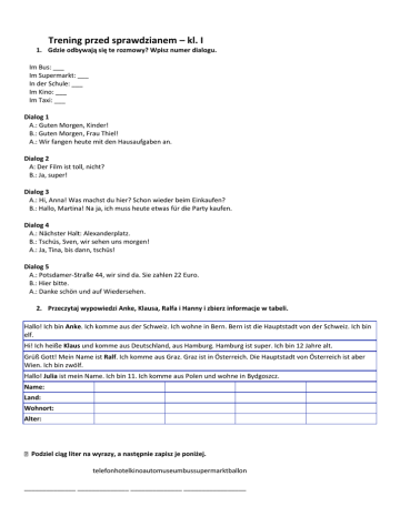 Trening przed sprawdzianem – kl. I 1. Gdzie odbywają się te rozmowy? Wpisz numer dialogu. Im Bus: ___ Im Supermarkt: ___ In der Schule: ___ Im Kino: ___ Im Taxi: ___ Dialog 1 A.: Guten Morgen, Kinder! B.: Guten Morgen, Frau Thiel! A.: Wir fangen heute mit den Hausaufgaben an. Dialog 2 A: Der Film ist toll, nicht? B.: Ja, super! Dialog 3 A.: Hi, Anna! Was machst du hier? Schon wieder beim Einkaufen? B.: Hallo, Martina! Na ja, ich muss heute etwas für die Party kaufen. Dialog 4 A.: Nächster Halt: Alexanderplatz. B.: Tschüs, Sven, wir sehen uns morgen! A.: Ja, Tina, bis dann, tschüs! Dialog 5 A.: Potsdamer-Straße 44, wir sind da. Sie zahlen 22 Euro. B.: Hier bitte. A.: Danke schön und auf Wiedersehen. 2. Przeczytaj wypowiedzi Anke, Klausa, Ralfa i Hanny i zbierz informacje w tabeli. Hallo! Ich bin Anke. Ich komme aus der Schweiz. Ich wohne in Bern. Bern ist die Hauptstadt von der Schweiz. Ich bin elf. Hi! Ich heiße Klaus und komme aus Deutschland, aus Hamburg. Hamburg ist super. Ich bin 12 Jahre alt. Grüß Gott! Mein Name ist Ralf. Ich komme aus Graz. Graz ist in Österreich. Die Hauptstadt von Österreich ist aber Wien. Ich bin zwölf. Hallo! Julia ist mein Name. Ich bin 11. Ich komme aus Polen und wohne in Bydgoszcz. Name: Land: Wohnort: Alter: Podziel ciąg liter na wyrazy, a następnie zapisz je poniżej. telefonhotelkinoautomuseumbussupermarktballon ______________ ______________ ______________ _________________ ______________ ______________ ______________ _________________ a. Jakie to wyrazy? Zapisz je. 1. 2. 3. 4. 5. ITAX – _______________________ NLETEOF – _______________________ IEIPLOZ – _______________________ ARPK – _______________________ LEOHT – _______________________ b. Może znasz jeszcze inne niemieckie słowa? Spróbuj je odczytad i zapisad. 1. 2. 3. 4. 5. LACO – _______________________ GERBURHAM – _______________________ PUCOMTER – _______________________ IKMUS – _______________________ NABANE – _______________________ Przyporządkuj godzinę i formę powitania lub pożegnania. 1. 8:30 a. Gute Nacht! 2. 19:00 b. Guten Morgen! 3. 12:00 c. Guten Abend! 4. 22:00 d. Guten Tag! Uzupełnij brakujące litery. 1. G__ten __ag! 6. G__t__ Nach__! 2. Au__ Wi__derse__en! 7. Gute__ M__rg__n! 3. Gr__ß di__h! 8. Ci__o! 4. H__! 9. __uten Ab__nd! 5. B__s dan__! 10. __all__! Co nie pasuje? Przekreśl. 1. Guten Tag! – Tschüs! – Hallo! 2. Bis dann! – Tschüs! – Guten Morgen! 3. Guten Abend! – Gute Nacht! – Guten Tag! 4. Hi! – Tschüs! – Hallo! 5. Auf Wiedersehen! – Tschüs! – Grüß dich! Jakiej odpowiedzi udzielisz na pytanie: Wie geht’s? Spójrz na buźki ( :-) ; :-() i wpisz odpowiednio do tabeli. Super! – Schlecht! – Toll! – Sehr gut! – Schrecklich! – Prima! – Nicht gut! Co nie pasuje? Przekreśl. 1. Hallo! – Auto – Guten Morgen! – Hi! 2. Es geht! – Danke! – Nicht schlecht! – So lala! 3. Hotel – Pizzeria – Polizei – Bis dann! 4. Super! – Grüß dich! – Prima! – Toll! 5. Tschüs! – Nicht gut! – Schrecklich! – Schlecht! Wpisując kolejny numer przy każdym zdaniu, utwórz dialog. ___ Wie geht es Ihnen, Frau Thiel? 1. Guten Tag, Frau Thiel! ___ Danke, Herr Dolle, gleichfalls! ___ Danke, Herr Dolle, super! ___ Guten Tag, Herr Dolle! ___ Einen schönen Tag, Frau Thiel! Uzupełnij wielką lub małą literę h. Następnie przeczytaj głośno wyrazy i podkreśl te, w których h jest nieme (nie wymawia się go). ze___n – ___otel – Auf Wiederse___en! – ___i! – Wie ge___t es dir? – Danke, ___err ___uber! – Se___r gut! – Powiedz to po niemiecku. 1. Jak spytasz koleżankę o samopoczucie? ________________________________________________________________________ 2. Jak przywitasz się o ósmej rano ze swoją nauczycielką, panią Weber? ________________________________________________________________________ 3. Jak odpowiesz swojemu nauczycielowi, panu Redelowi, gdy spyta cię o samopoczucie? ________________________________________________________________________ 4. Jak pożegnasz się ze swoją nauczycielką? ________________________________________________________________________ 5. Jak pożyczysz swojemu nauczycielowi miłego dnia? ________________________________________________________________________ 6. Jak spytasz swojego sąsiada, pana Thiela o samopoczucie? ________________________________________________________________________ W każdej grupie znajduje się inny rzeczownik, który nie pasuje do pozostałych. Przekreśl go. a. Park - Museum - Tag - Hotel b. Abend - Tag - Nacht - Telefon c. Schmidt - Frau - Dretzke - Schulz Jak ci się wydaje, które z imion twoich rówieśników z Niemiec to imiona dziewcząt, a które chłopców? Zaznacz: M jak Mädchen (dziewczynka), lub J jak Junge (chłopiec). 1. Andreas ____ 6. Marko ____ 2. Andrea ____ 7. Holger ____ 3. Julia ____ 8. Heidi ____ 4. Julian ____ 9. Rudi ____ 5. Miriam ____ 10. Rosi _____ Zaznacz znakiem X w tabeli możliwe dokooczenie zdania. Ich heiße … Ich bin … Ich komme … Ich wohne … Melanie Thiel. in Warschau. aus der Schweiz 12 Jahre alt. Florian. in der Schweiz. zehn. Uzupełnij h lub ch. Pamiętaj o wielkiej i małej literze. Auf Wiederse___en! – s___reckli___ – Österrei___ – ni___t gut – Sara___ – viellei___t – Wie ge___t es dir? – se___r gut – glei___falls Napisz poprawnie zdania. 1. ichheißekatharina _______________________________________________________ 2. wiegehtesdir?___________________________________________________________ 3. ichwohneinderschweiz____________________________________________________ 4. ichbinkaroline___________________________________________________________ 5. ichkommeausösterreich___________________________________________________ Która odpowiedź pasuje? Zaznacz znakiem X w tabeli. Wie alt bist du? Woher kommst du? Wo wohnst du? Wie heißt du? Aus Hamburg. Ich bin Anna. 10. Ich komme aus Berlin. Karin Thiel. Ich bin aus Warschau. In der Schweiz. Ich bin elf. Ich woh