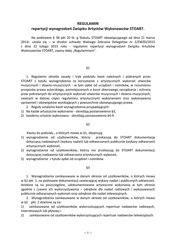 REGULAMIN repartycji wynagrodzeń Związku Artystów Wykonawców STOART. Na podstawie § 38 pkt 10 lit. g Statutu STOART obowiązującego od dnia 21 marca 2013r. ustala się – w drodze uchwały Walnego Zebrania Delegatów nr 2/ZWZD/2015 z dnia 22 lutego 2015 roku - regulamin repartycji wynagrodzeń Związku Artystów Wykonawców STOART, zwany dalej „Regulaminem”. §1 1. Regulamin określa zasady i tryb podziału kwot należnych i pobranych przez STOART z tytułu wynagrodzenia za korzystanie z artystycznych wykonań utworów muzycznych i słowno-muzycznych - w tym opłat od urządzeń i nośników, w rozumieniu przepisów prawa autorskiego, pomniejszonych o koszt zbiorowego zarządzania i ochrony praw pokrewnych do artystycznych wykonań utworów muzycznych i słowno-muzycznych, zwanych w dalszej części regulaminu artystycznymi wykonaniami oraz wykonywania uprawnień i obowiązków wynikających z powszechnie obowiązującego prawa. 2. Reguły ustalania kwot wynagrodzenia przypadających: 1) Na każde artystyczne wykonanie - określają postanowienia §3, 2) każdemu artyście wykonawcy - określają postanowienia §4-9. §2 Kwoty do podziału , o których mowa w §1, obejmują: 1) wynagrodzenie od użytkowników, którzy przekazują do STOART dokumentację dotyczącą nadawanych (wykazy nadań) lub odtwarzanych publicznie (wykazy odtworzeń) artystycznych wykonań, 2) wynagrodzenie od użytkowników, którzy nie przekazują do STOART dokumentacji dotyczącej nadawania lub odtwarzania artystycznych wykonań, 3) wynagrodzenie z tytułu opłat od urządzeń i nośników. §3 1. Wynagrodzenia zainkasowane w danym okresie od użytkowników, o których mowa w §2 pkt. 1, na podstawie dokumentacji zawierającej wykazy nadań i publicznych odtworzeń, dzielone są na poszczególne, udokumentowane artystyczne wykonania w tym okresie zgodnie z czasem ich wykorzystywania – odrębnie dla nadań radiowych i wykazywanych publicznie odtwarzanych wykonań oraz odrębnie dla nadań telewizyjnych. 2. Wynagrodzenia zainkasowane w danym okresie od użytkowników, o których mowa w §2 pkt. 2 dzielone są na: 1) zainkasowane od użytkowników wykorzystujących repertuar nadawców radiowych, internetowych lub płytowy i 2) zainkasowane od użytkowników wykorzystujących repertuar nadawców telewizyjnych. ~1~ 3) Kwoty inkasa wymienione w pkt 1) i 2) dzielone są na wykonania i wykonawców proporcjonalnie do kwot wyliczonych dla tych wykonań i wykonawców z inkasa od użytkowników, o których mowa w § 3 ust 1. 3. Podział wynagrodzenia, o którym mowa w ust. 2 ustanawiany jest raz na trzy lata na podstawie ustalanego przez Biuro Wykonawcze parytetu udziału liczby umów z użytkownikami wykorzystującymi repertuar radiowy i użytkownikami wykorzystującymi repertuar telewizyjny w łącznej ilości umów z tymi użytkownikami i zatwierdzonego uchwałą Zarządu ZAW STOART. 4. Udział każdego artystycznego wykonania oraz wykonawcy w wynagrodzeniu z tytułu opłat od urządzeń i nośników w danym okresie wylicza się proporcjonalnie do udziału tego wykonania i wykonawcy w łącznej kwocie wyliczonej z podziału środków zainkasowanych od użytkowników, o których mowa w §3 ust. 1 i 2. §4 1. Wśród artystów wykonawców uczestniczących w podziale wynagrodzenia za korzystanie z przedmiotu praw pokrewnych do artystycznych wykonań odróżnia się następujące funkcje artystyczne: 1) solista wokalista, śpiewak, 2) solista instrumentalista, 3) dyrygent, 4) muzyk wykonujący partie solową, 5) członek chóru, 6) członek chórku, 7) muzyk akompaniujący, 8) członek orkiestry, 9) didżej (DJ), 10) recytator. 2. W podziale wynagrodzenia, o którym mowa w ust.1, uczestniczy również realizator dźwięku. Realizatorowi dźwięku, który utrwalił dane artystyczne wykonanie przysługuje wynagrodzenie w wysokości 2 procent kwoty pobranej przez STOART na koszty prowadzenia zbiorowego zarządu, dotyczącej tego artystycznego wykonania. §5 1. Procentowy udział poszczególnych artystów wykonawców w wynagrodzeniu za korzystanie z artystycznych wykonań ustala się według zasad wskazanych w oświadczeniu woli podpisanym przez wszystkich artystów wykonawców biorących udział w tym wykonaniu a w przypadku braku takiego oświadczenia według zasad wskazanych w postanowieniach §6-8. 2. Wzór oświadczenia woli, o którym mowa w ust.1, określa Zarząd STOART. §6 Ustala się dwa rodzaje repartycji: ~2~ 1) repartycja związana gatunkiem muzyki rozrywkowej i jazzowej, w tym formacje mieszane, także przy współudziale orkiestr oraz artystów klasycznych- repartycja „Rozrywka i jazz”, 2) repartycja związana z gatunkiem muzyki klasycznej, w tym repertuar operetkowy - repartycja „Klasyka”. §7 1. Repartycja „Rozrywka i jazz” obejmuje następujące trzy pule: 1) pula 1 (stanowiąca 40 % całości)- w równych częściach przypadające solistom instrumentalistom, solistom wokalistom (śpiewakom), recytatorom, 2) pula 2 (stanowiąca 10 % całości) przypadająca dyrygentowi lub dyrygentom w równych częściach, 3) pula 3 (stanowiąca 50 % całości)- w równych częściach przypadająca członkom chórku, członkom chóru, członkom orkiestry, dj., muzykom akompaniującym, muzykom wykonującym partie solowe. 2. W razie braku artystów wykonawców przypisanych do : 1) puli 1- całość tej puli sumuje się z pulą 3, 2) puli 2- całość tej puli sumuje się z pulą 3, 3) puli 1 i 2- całość tych pul sumuje się z pulą 3, 4) puli 3- całość tej puli sumuje się z pulą 1, 5) puli 2 i 3- całość tych pul sumuje się z pulą 1, 3. W przypadku gdy w artystycznym wykonaniu ilość solistów jest równa lub większa niż ilość muzyków akompaniujących wynagrodzenie za to wykonanie dzielone jest w równych częściach na wszystkich wykonawców. §8 1) 2) 1) 2) 3) 1. Repartycja „Klasyka” (w przypadku wykonań orkiestrowych) obejmuje następujące dwie pule: pula 1 (stanowiąca 30 % ca
