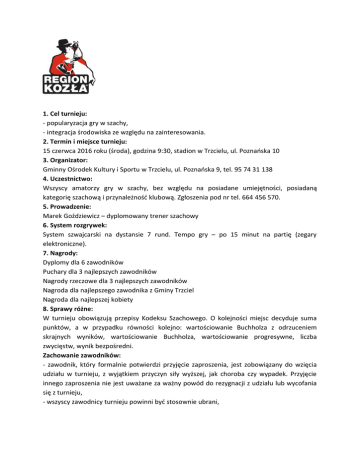 1. Cel turnieju: - popularyzacja gry w szachy, - integracja środowiska ze względu na zainteresowania. 2. Termin i miejsce turnieju: 15 czerwca 2016 roku (środa), godzina 9:30, stadion w Trzcielu, ul. Poznańska 10 3. Organizator: Gminny Ośrodek Kultury i Sportu w Trzcielu, ul. Poznańska 9, tel. 95 74 31 138 4. Uczestnictwo: Wszyscy amatorzy gry w szachy, bez względu na posiadane umiejętności, posiadaną kategorię szachową i przynależność klubową. Zgłoszenia pod nr tel. 664 456 570. 5. Prowadzenie: Marek Goździewicz – dyplomowany trener szachowy 6. System rozgrywek: System szwajcarski na dystansie 7 rund. Tempo gry – po 15 minut na partię (zegary elektroniczne). 7. Nagrody: Dyplomy dla 6 zawodników Puchary dla 3 najlepszych zawodników Nagrody rzeczowe dla 3 najlepszych zawodników Nagroda dla najlepszego zawodnika z Gminy Trzciel Nagroda dla najlepszej kobiety 8. Sprawy różne: W turnieju obowiązują przepisy Kodeksu Szachowego. O kolejności miejsc decyduje suma punktów, a w przypadku równości kolejno: wartościowanie Buchholza z odrzuceniem skrajnych wyników, wartościowanie Buchholza, wartościowanie progresywne, liczba zwycięstw, wynik bezpośredni. Zachowanie zawodników: - zawodnik, który formalnie potwierdzi przyjęcie zaproszenia, jest zobowiązany do wzięcia udziału w turnieju, z wyjątkiem przyczyn siły wyższej, jak choroba czy wypadek. Przyjęcie innego zaproszenia nie jest uważane za ważny powód do rezygnacji z udziału lub wycofania się z turnieju, - wszyscy zawodnicy turnieju powinni być stosownie ubrani, - zawodnik, który nie chce kontynuować partii i opuszcza miejsce gry bez poddania partii czy powiadomienia sędziego, postępuje nie fair. Sędzia Główny może ukarać takiego zawodnika za niesportowe zachowanie, - zawodnik nie może rozmawiać o swojej partii w jej trakcie. W trakcie turnieju będzie dostępny bufet. Zastrzega się możliwość wprowadzania zmian w niniejszym regulaminie. ORGANIZATORZY